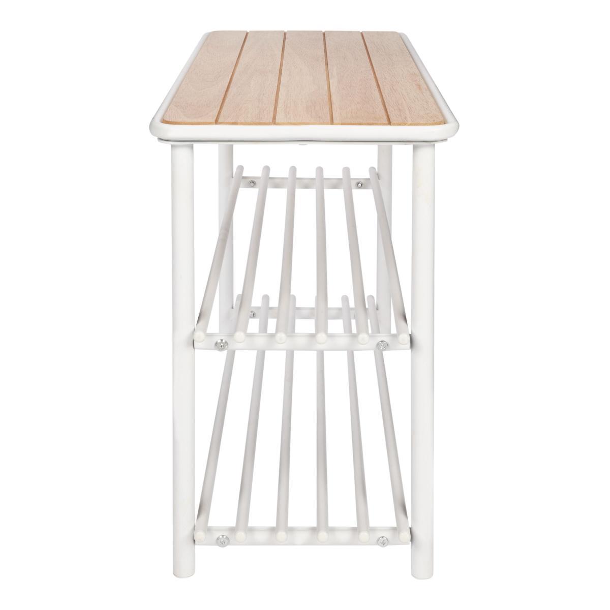 A simply designed shoe rack with bench top for storing bags and other accessories.
