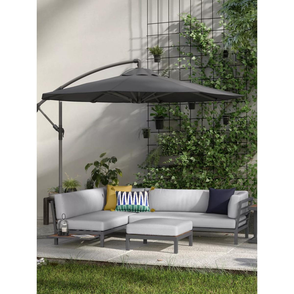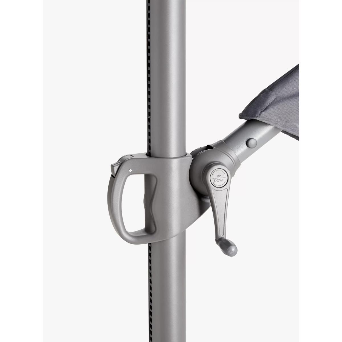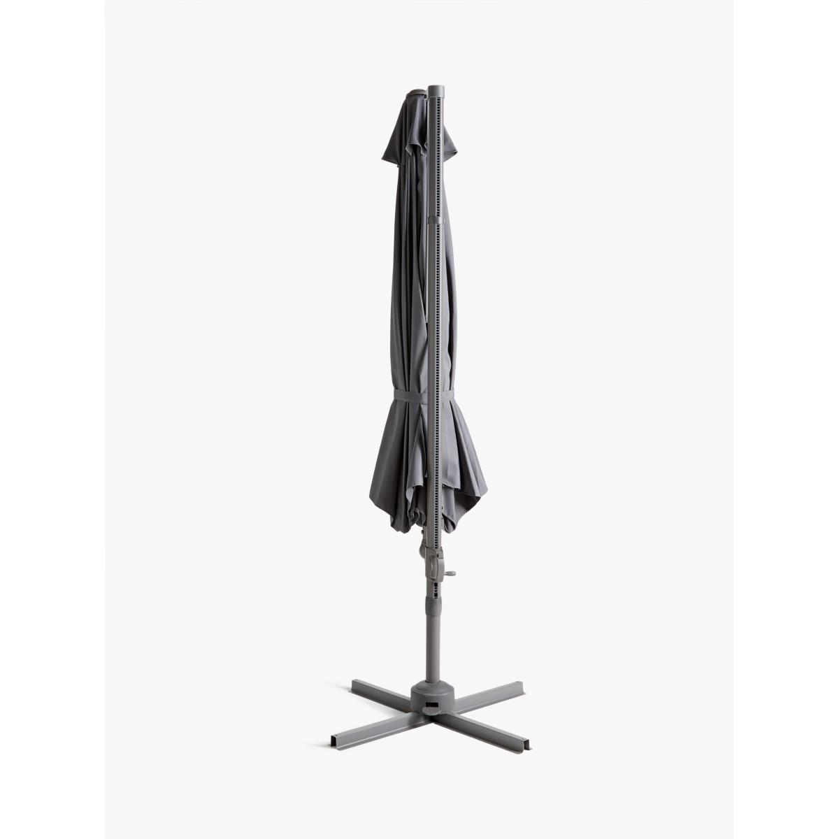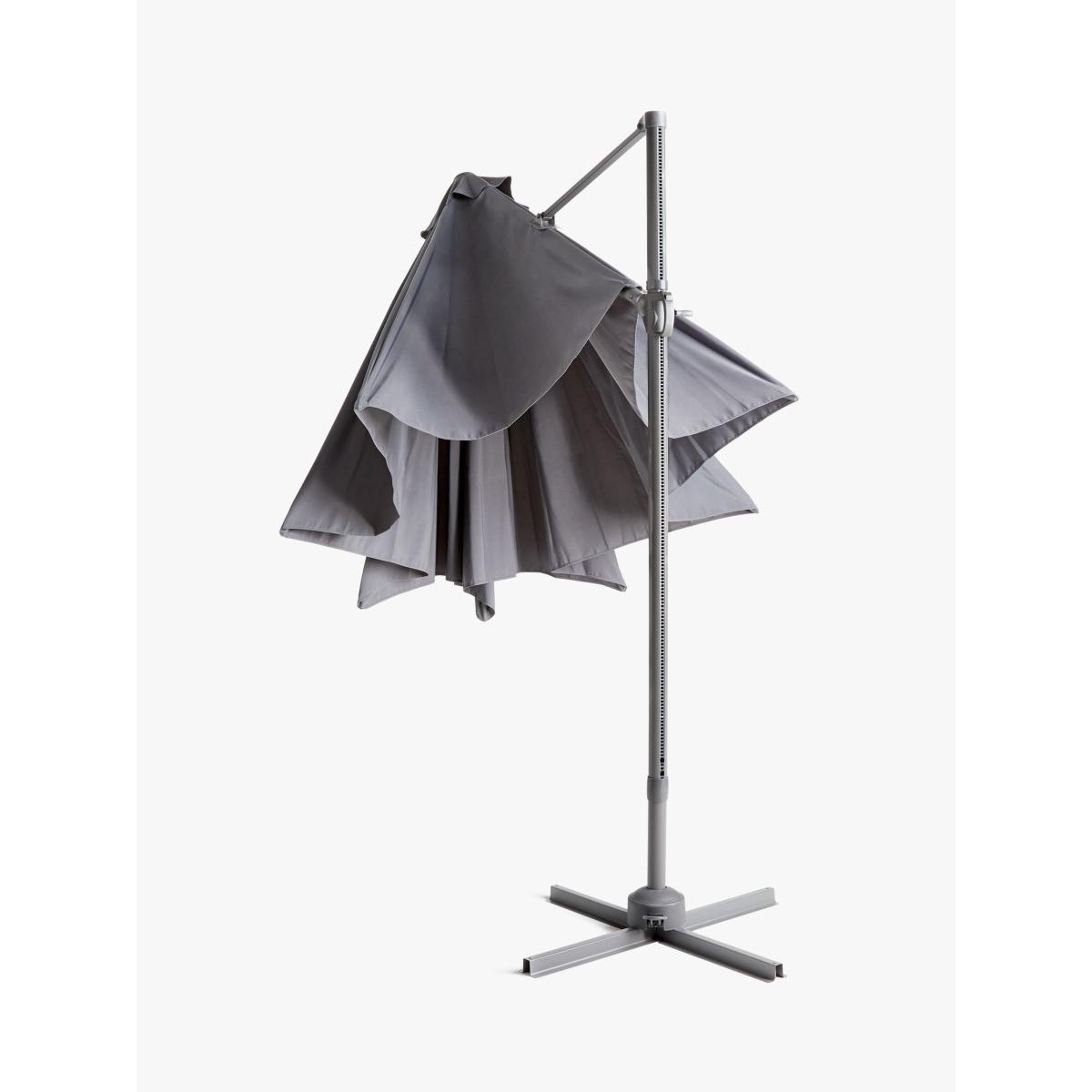 Control protection from the sun with this large, easily adjusted freestanding parasol. Ideal for a 6 or 8-seater dining table set, it provides plenty of shade to keep you and your guests cool while dining in your garden or on your patio. With a wind-up cantilevered operation to open and adjust the height, it features UV50+ sun protection with 360-degree rotation. Made with a corrosion-resistant aluminium pole and ribs and an all-weather polyester fabric canopy. Pole diameter: 58mm. Requires a minimum base weight of 90kg. Choose a suitable. Good to know: The parasol is designed for sun shade protection only. In windy weather, take down the parasol and store safely. Want to see it first? You may want to see and get a feel for the product in one of our shops before ordering. We'll be able to tell you where the range you'd like to view is on display.