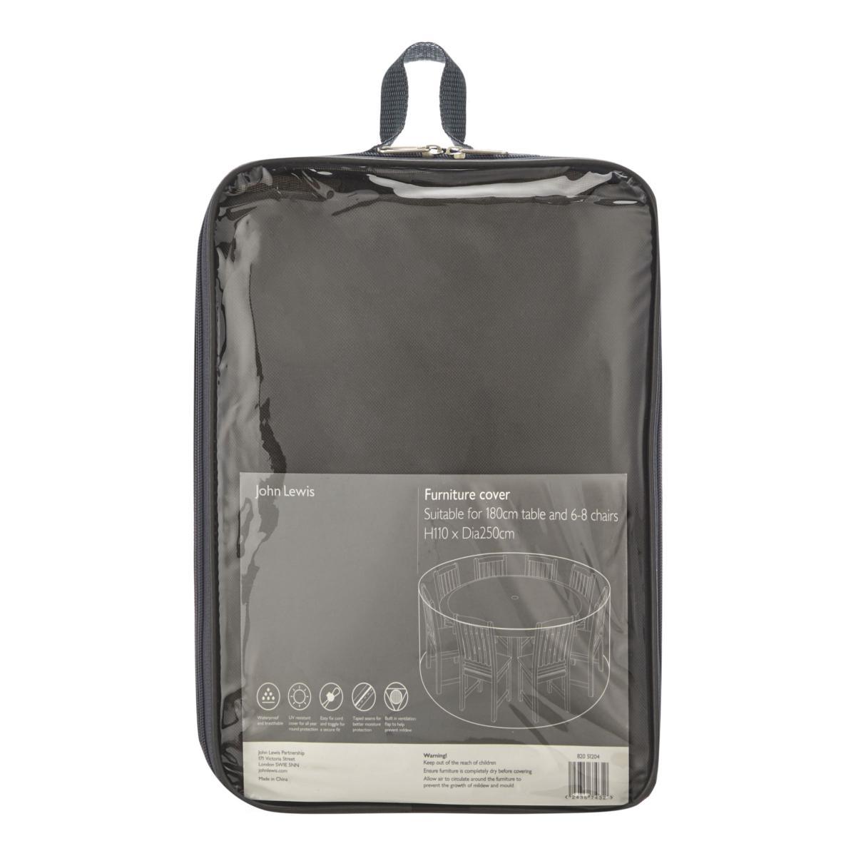 A cover for John Lewis & Partners outdoor round furniture sets, suitable for a 180cm table and 6 to 8 chairs. It's waterproof with taped seams for better protection yet breathable with built-in ventilation to prevent mildew. The cover comes with a cord and toggle for an easy, secure fit. Made from strong 600. D polyester with UV30+ sun protection for all-year-round use. Please note: not all our ranges are on display in our shops.