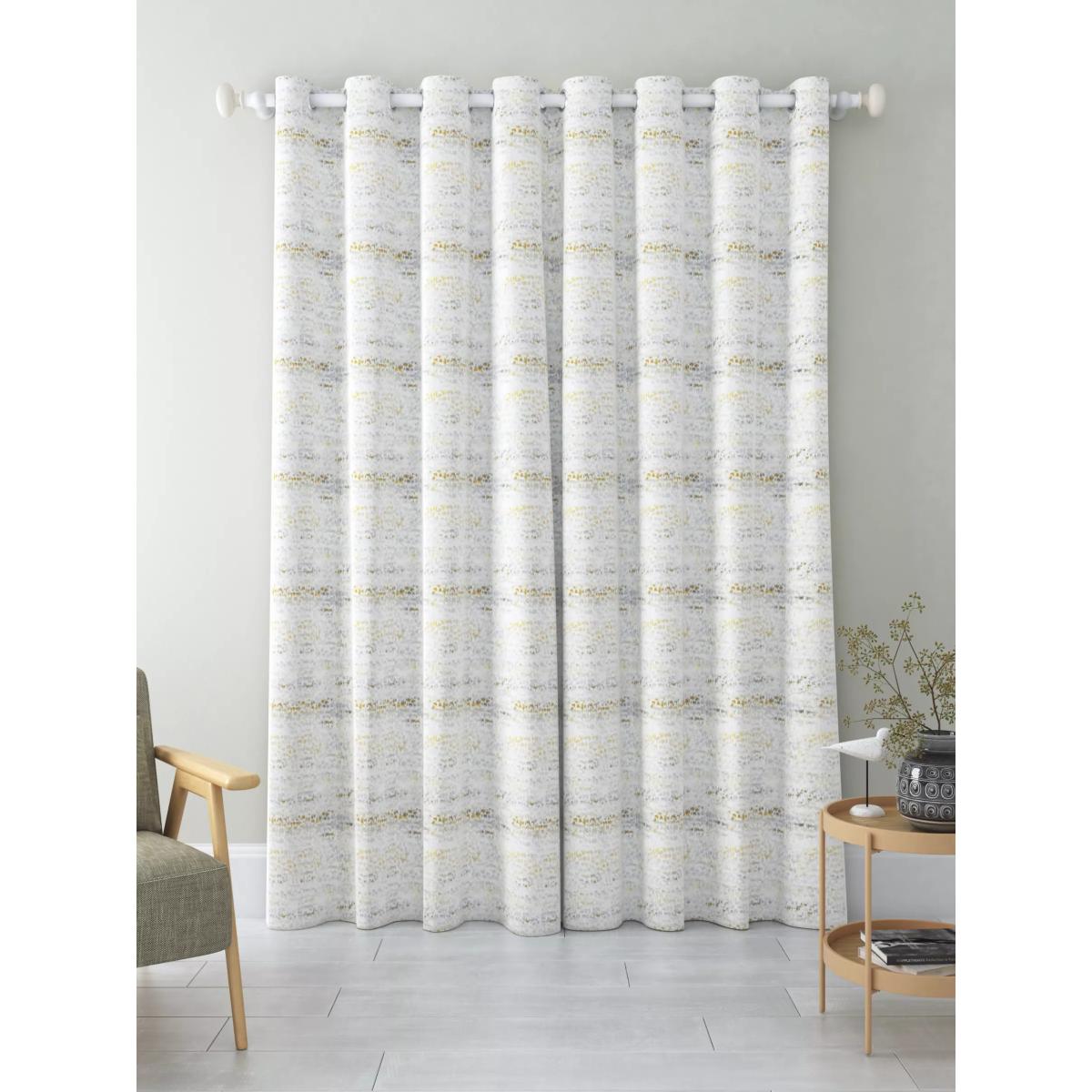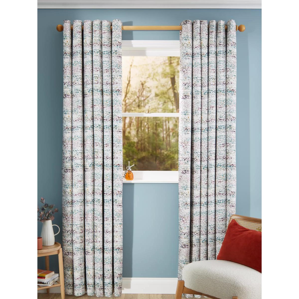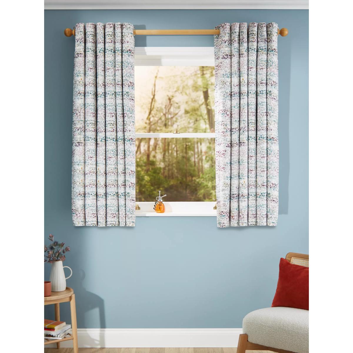These curtains have an abstract, washed colour design and eyelet heading, which gives them a more contemporary look with large, even folds. The blackout lining eliminates light and lends a full look to the curtain, improving the drape and enhancing the vibrancy of the pattern. Warm in winter, cool in summer As the blackout lining on these curtains blocks out sunlight they help keep your room cool as well as dark. This lining also adds an extra layer of insulation to the curtains, giving them the added benefit of being thermal. They protect against both heat loss and heat gain, regulating the temperature of your room so you're kept warm in winter and cool in summer. The width stated indicates the size of one curtain panel when laid completely flat. This pack contains two panels and the track/pole length we've recommended allows for the two panels to be gathered when the curtains are drawn. For a fuller look, increase the curtain width. One pair of 167cm width curtains will fit a curtain track/pole size 133-167cm One pair of 228cm width curtains will fit a curtain track/pole size 182-228cm Worth knowing... We package our curtains in recycled materials to keep them protected whilst they make their way to you. This means that when they arrive there could be some creases in them. We recommend you hang them for a few days to allow them to flatten and for the creases to fall out. If after this period your curtains still show signs of being folded then follow the ironing instructions on the back of the packaging. Be aware that each style of curtain has different ironing instructions, including heat limitations according to the fabric, so do make sure you follow the guidance provided to get the best results. Do you need a curtain pole and accessories? Shop them here.