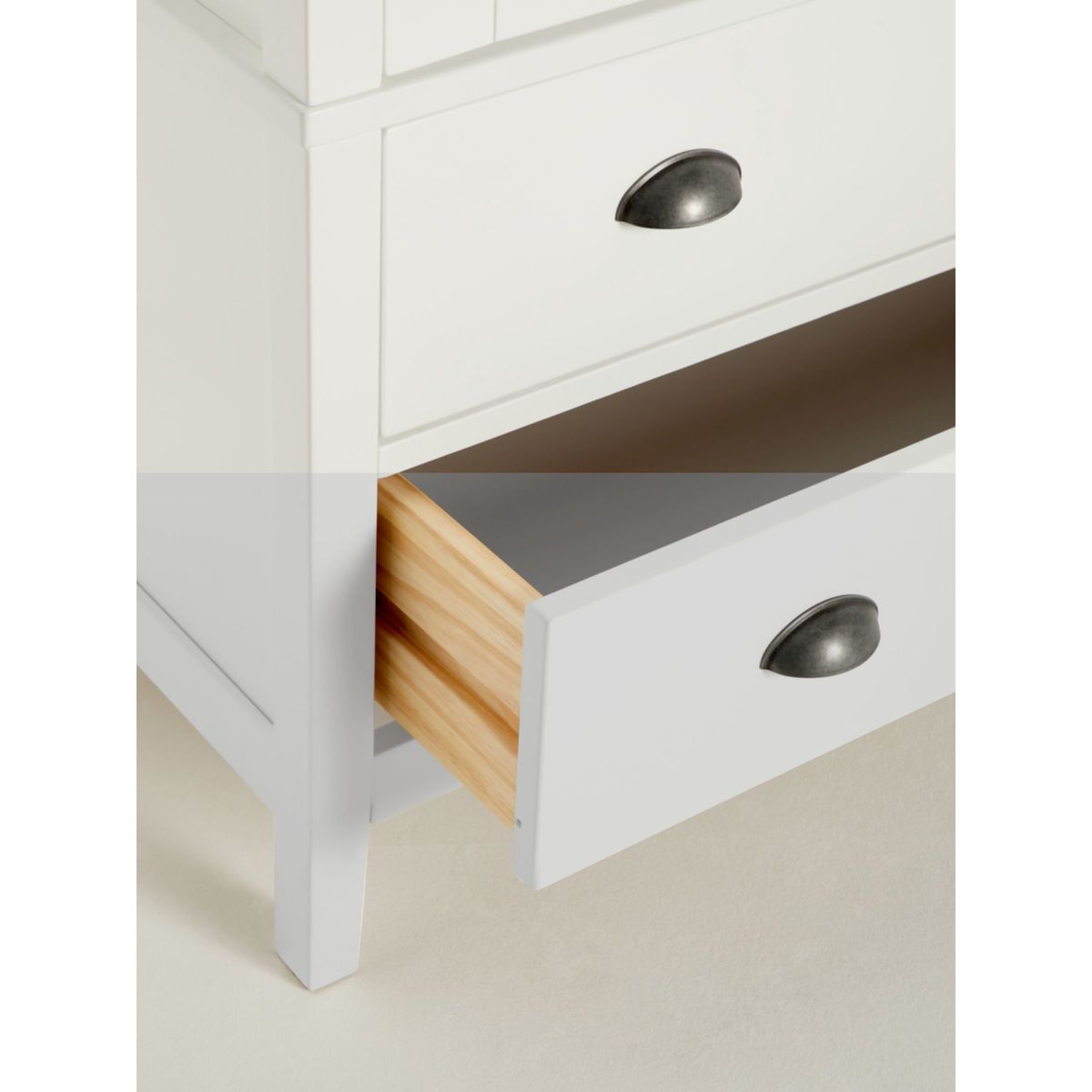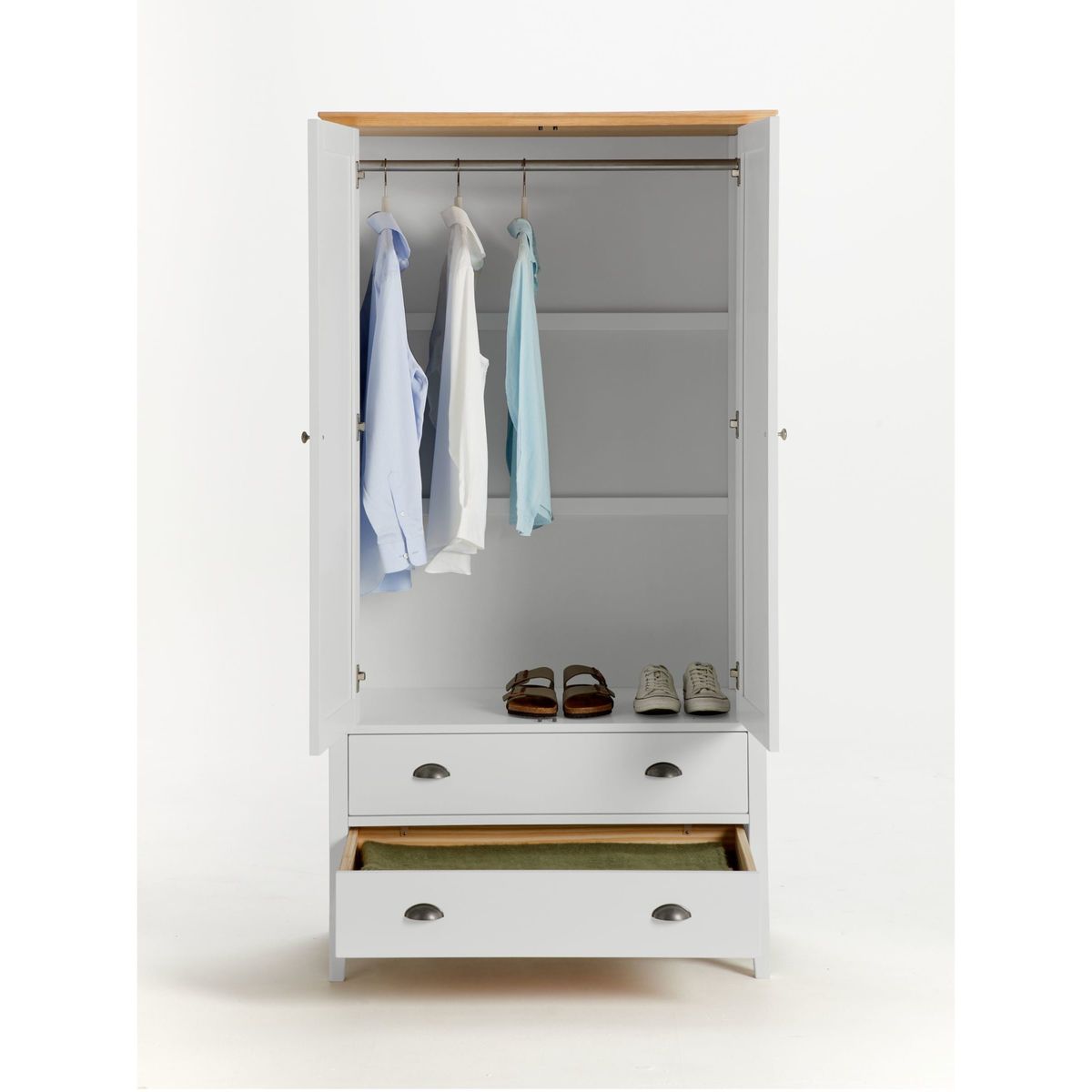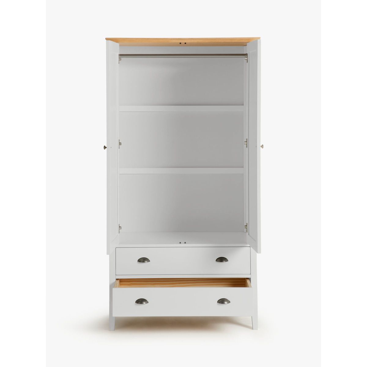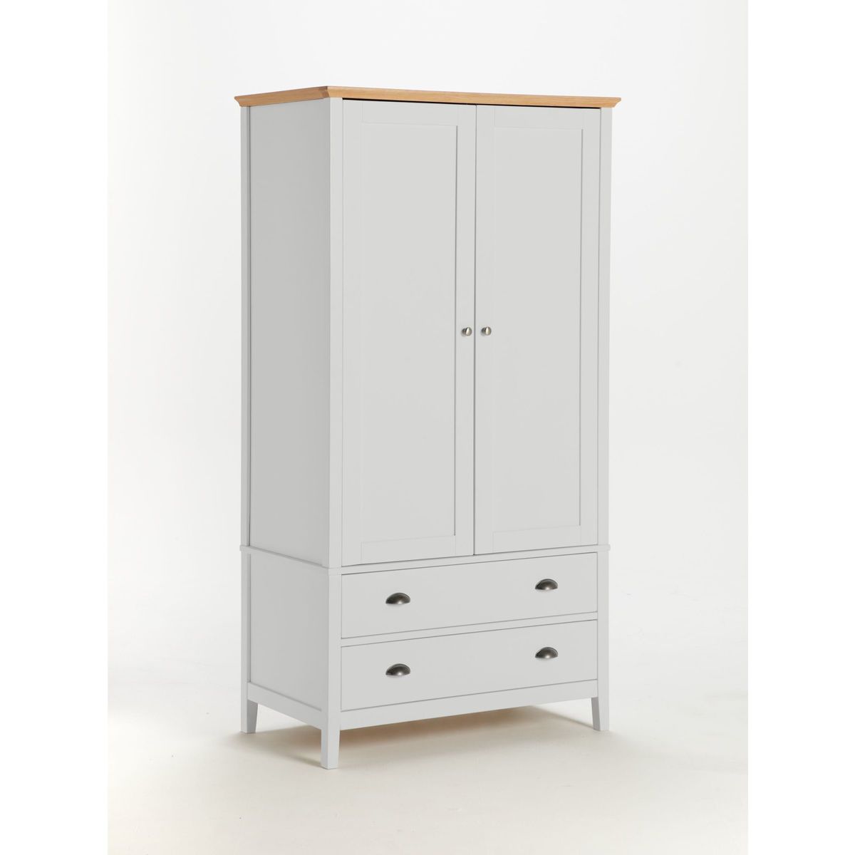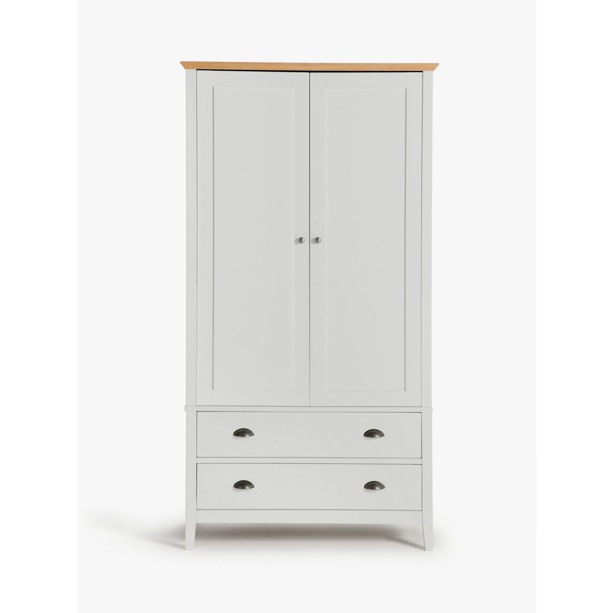 The Albany range of bedroom furniture showcases traditional design influences alongside robust natural materials. Designed with clean lines and subtly tapered legs, each piece has a versatile painted finish that's complemented with a smooth oak veneer top and solid oak edges. This sturdy, practical wardrobe opens with two hinged doors to reveal a spacious interior and metal hanging rail. Two lower drawers offer additional storage space while cup-pull handles lend a classic styling accent.