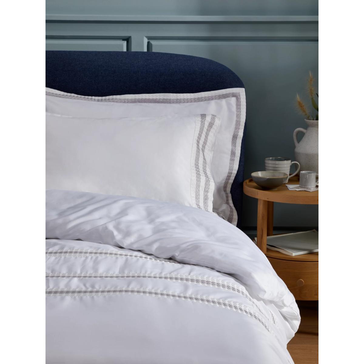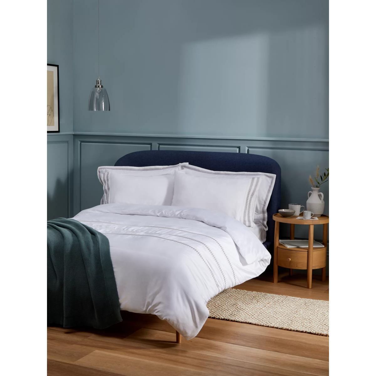 300 thread count bedding, woven in pure white cotton sateen and trimmed with grey stitch detail. The world’s most widely used natural fibre, versatile cotton makes the perfect bed linen; cool, lightweight, soft and breathable. Please note: Duvet covers and pillowcases are available to purchase separately, and not in sets. Have you thought about sheeting? Shop here. Bedding sizes To fit duvet/pillow size (cm) Standard pillowcase, L75 x W50cm Oxford pillowcase, L75 x W50cm (excluding trim) Single duvet cover, L200 x W135cm Double duvet cover, L200 x W200cm King duvet cover, L220 x W225cm Super king duvet cover, L220 x W260cm