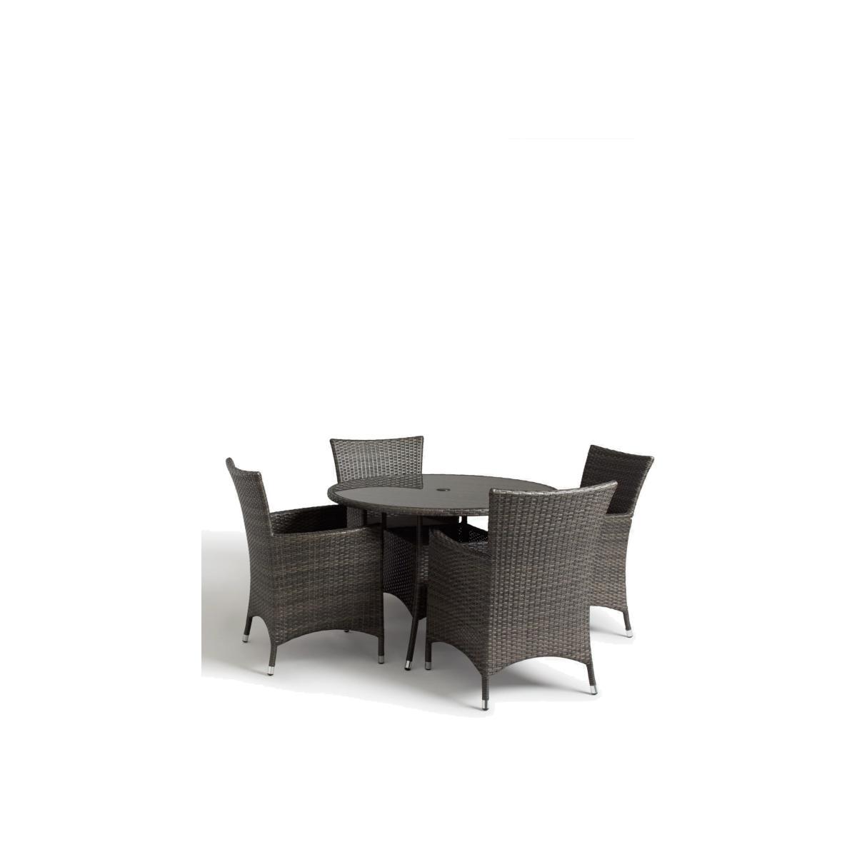 Elegant yet robust, this set of four Alora dining chairs and round, glass-topped dining table are equally at home in the garden or conservatory. The brown chairs come with comfortable 4cm grey cushions with removable covers for easy cleaning. Seating in the Alora range of outdoor furniture is made with strong aluminium frames that are able to withstand a weight of 20 stone (127kg), exceeding the industry standard. Made of synthetic rattan in a traditional flat-weave design, Alora dining furniture has an attractive, gently curved shape. Table: H75 x Dia.110cm, Chair: H89 x W63 x D65cm, Seat size: 47 x 49cm Good to know: The range is durable and for outdoor use all year round. As a precaution, we recommend you cover the furniture during adverse weather and remove the shower-resistant cushions when not in use to avoid over-exposure to rain and moisture. Want to see it first? You may want to see and get a feel for the product in one of our shops before ordering. We'll be able to tell you where the range you'd like to view is on display. Choose the perfect outdoor furniture We have a vast selection of furniture for you to choose from which will suit the home or garden. The majority of our furniture ranges have been hand woven using a synthetic wicker; the thinner the weave, the longer it takes for more skilled workers to complete. All weave types are durable so they'll last throughout the seasons All woven outdoor furniture is UV protected so it will not fade in direct sunlight All woven outdoor furniture is easy to maintain; simple wipe clean with warm water Flat A weave of various widths which offers incredible value for money Half round More detailed with a 3D effect, the half round is a round weave in half which displays a wicker appearance on the top and hollowed underside Double half round A double strand of half round, this is a wider width of weave which achieves a premium appearance Round weave A very tight, premium weave which is available in various widths Rope A selection of our ranges have been made using rope originally made for the fishing industry. The yarn is made up of 10,000 (approx) woven strands with a double core for extreme strength, does not attract mould even if wet for a long time and is UV resistant.