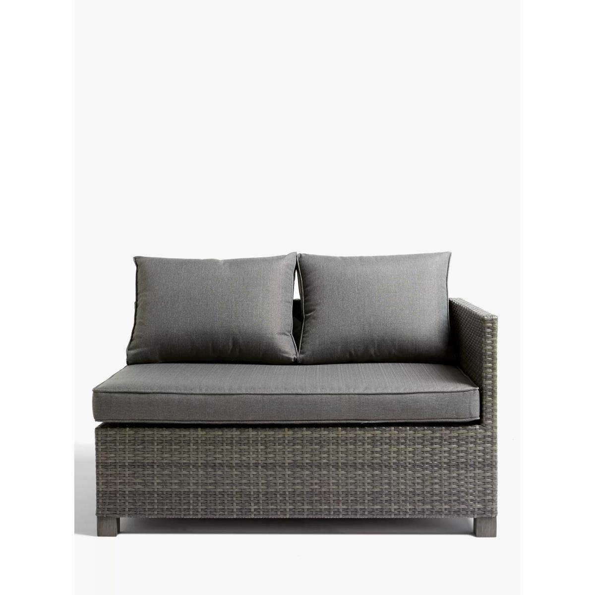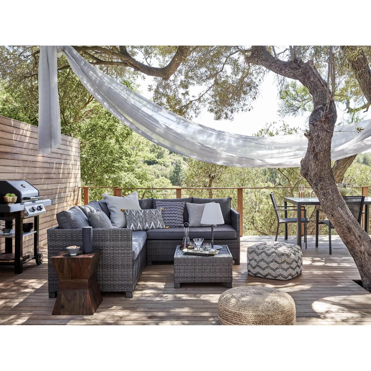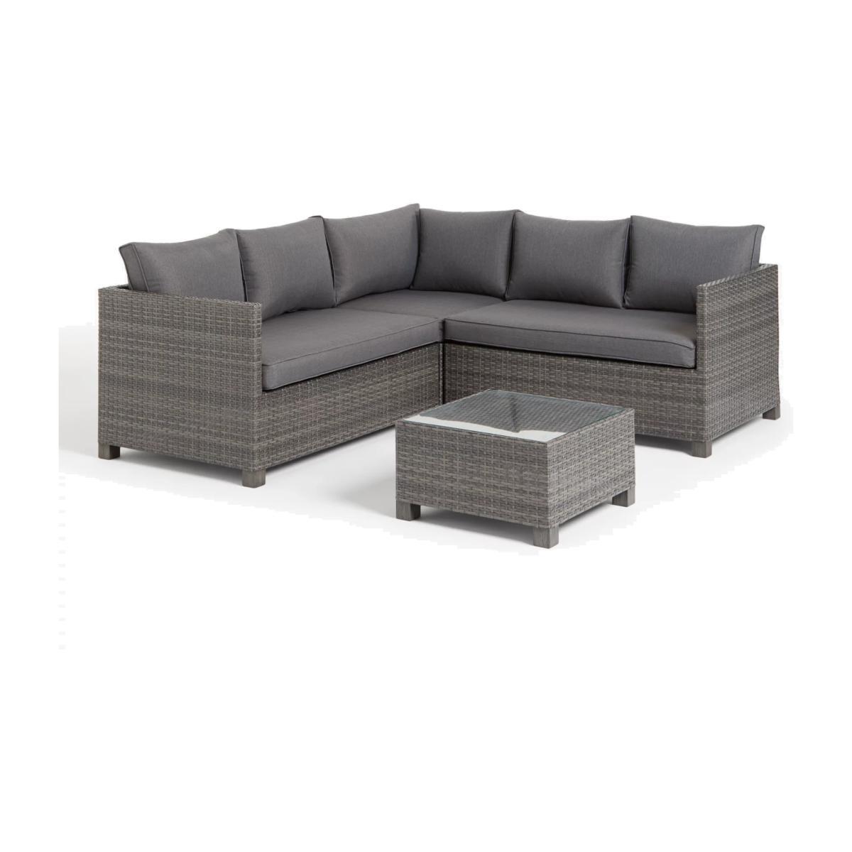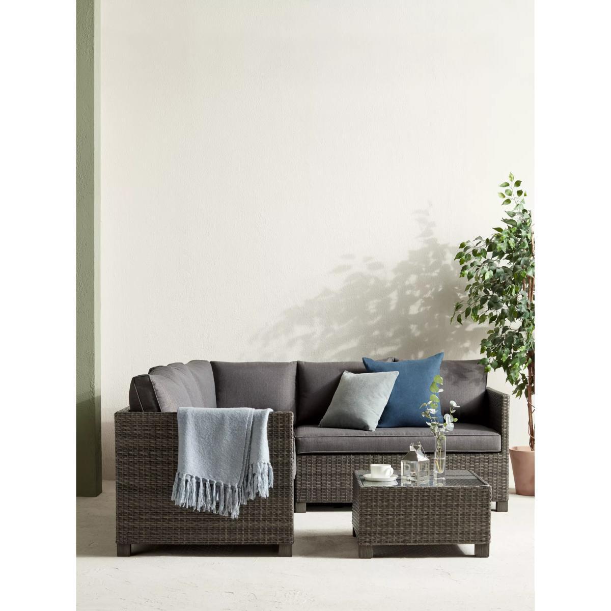 Elegant yet robust, the Alora corner sofa unit is equally at home in the garden or conservatory. It's a modular set that can be arranged to suit your space and needs. The set includes a corner chair and a left and a right side sofa, all with thick and comfortable back and seat cushions with removable covers for easy cleaning. The seating is for up to four people. A matching coffee table with a glass top completes the lounging set. Key features: 4-seater corner sofa unit and glass-topped coffee table Robust aluminium frames Woven rattan design Thick 8cm cushions included Seating in the Alora range of outdoor furniture is made with strong aluminium frames that are able to withstand a weight of 20 stone (127kg), exceeding the industry standard. The synthetic rattan has a traditional flat-weave design. Good to know: The range is durable and for outdoor use all year round. As a precaution, we recommend you cover the furniture during adverse weather and remove the shower-resistant cushions when not in use to avoid over-exposure to rain and moisture. Want to see it first? You may want to see and get a feel for the product in one of our shops before ordering. We'll be able to tell you where the range you'd like to view is on display. Choose the perfect outdoor furniture We have a vast selection of furniture for you to choose from which will suit the home or garden. The majority of our furniture ranges have been hand woven using a synthetic wicker; the thinner the weave, the longer it takes for more skilled workers to complete. All weave types are durable so they’ll last throughout the seasons All woven outdoor furniture is UV protected so it will not fade in direct sunlight All woven outdoor furniture is easy to maintain; simple wipe clean with warm water Flat A weave of various widths which offers incredible value for money Half round More detailed with a 3D effect, the half round is a round weave in half which displays a wicker appearance on the top and hollowed underside Double half round A double strand of half round, this is a wider width of weave which achieves a premium appearance Round weave A very tight, premium weave which is available in various widths Rope A selection of our ranges have been made using rope originally made for the fishing industry. The yarn is made up of 10,000 (approx) woven strands with a double core for extreme strength, does not attract mould even if wet for a long time and is UV resistant.