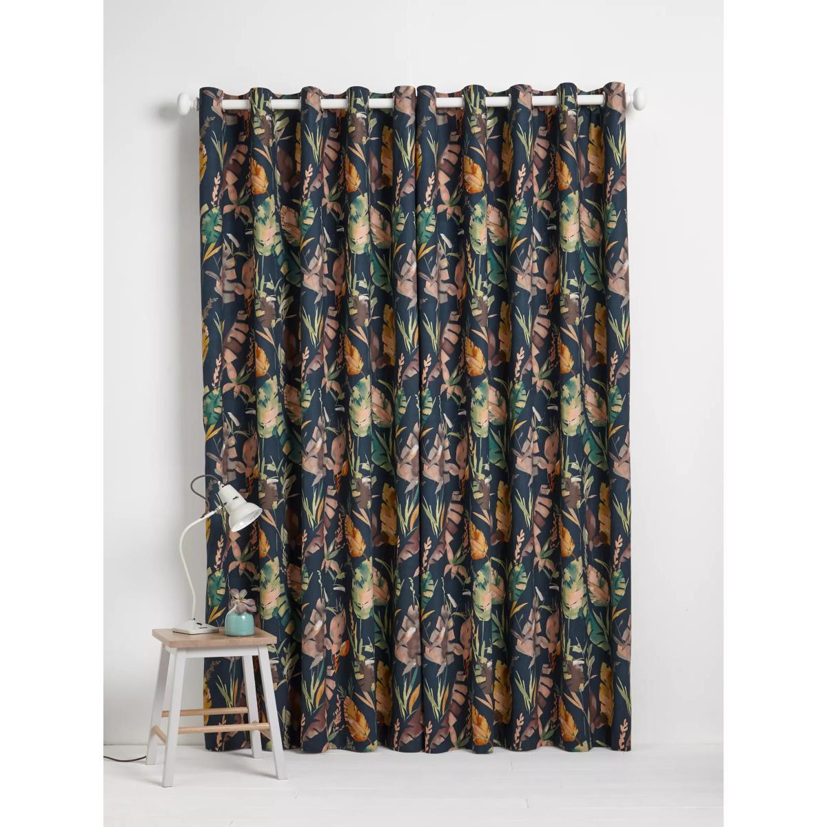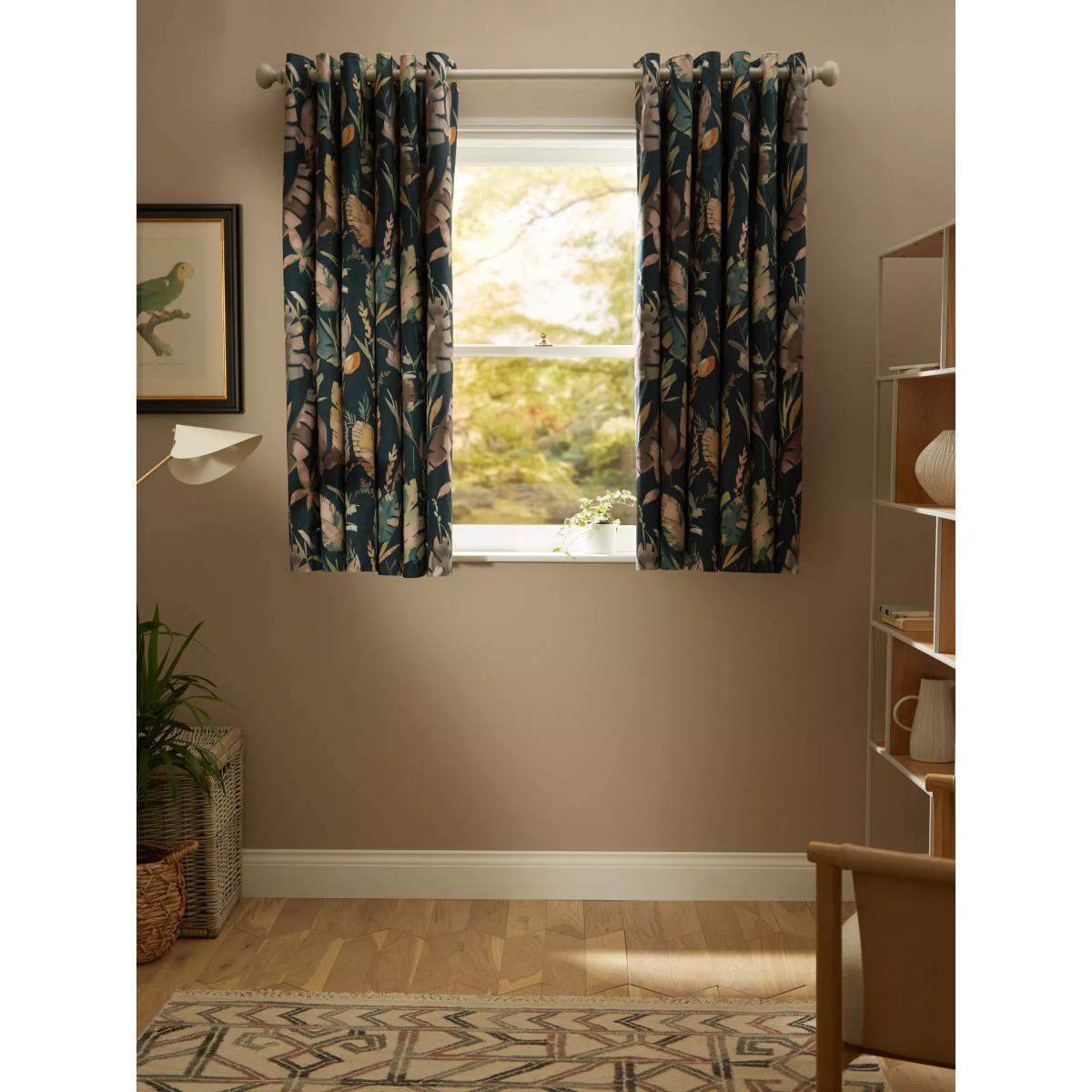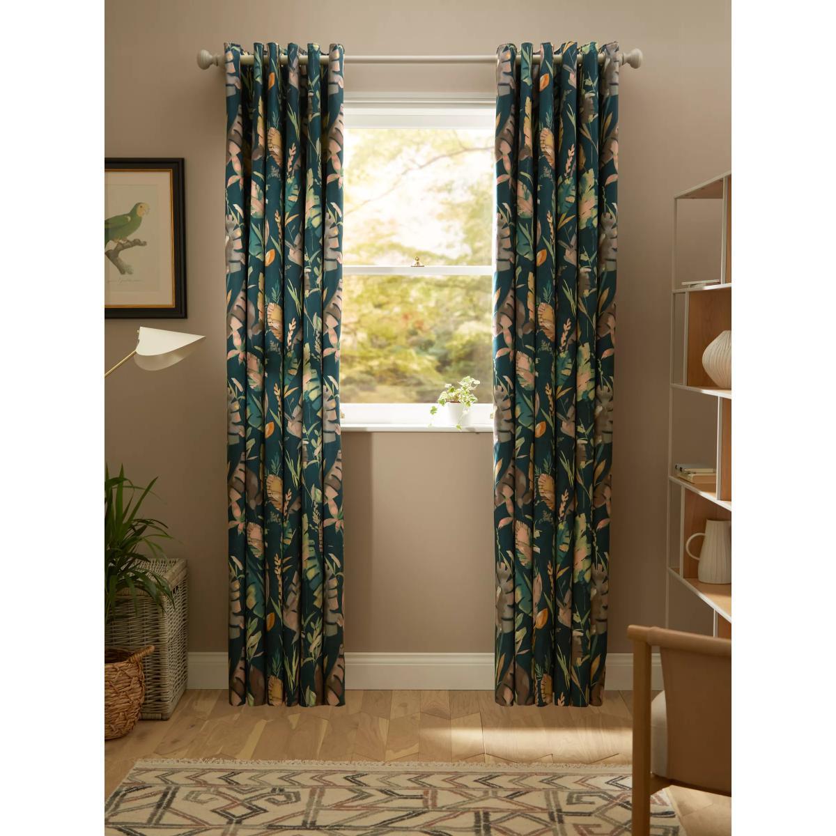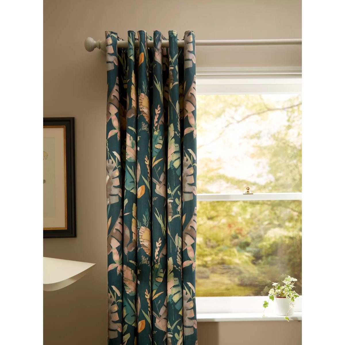 Cotton curtains with an oversized leaf pattern on a dark teal background. These curtains have an eyelet heading which gives them a more contemporary look with large, even folds. The blackout lining eliminates light and lends a full look to the curtain, improving the drape and enhancing the vibrancy of the pattern. The width stated indicates the size of one curtain panel when laid completely flat. This pack contains two panels, and the track/pole length we've recommended allows for the two panels to be gathered when the curtains are drawn. For a fuller look, increase the curtain width. One pair of 167cm width curtains will fit a curtain track/pole size of 133-167cm One pair of 228cm width curtains will fit a curtain track/pole size of 182-228cm Worth knowing... We package our curtains in recycled materials to keep them protected whilst they make their way to you. This means that when they arrive there could be some creases in them. We recommend you hang them for a few days to allow them to flatten and for the creases to fall out. If after this period your curtains still show signs of being folded then follow the ironing instructions on the back of the packaging. Be aware that each style of curtain has different ironing instructions, including heat limitations according to the fabric, so do make sure you follow the guidance provided to get the best results. Do you need a curtain pole/track and accessories?