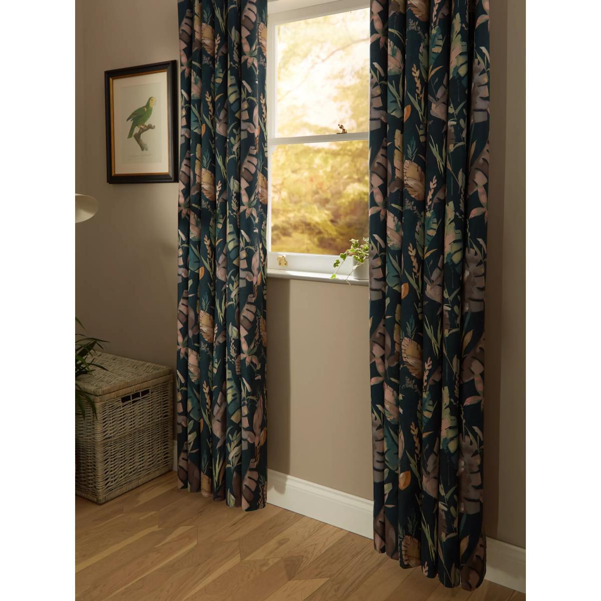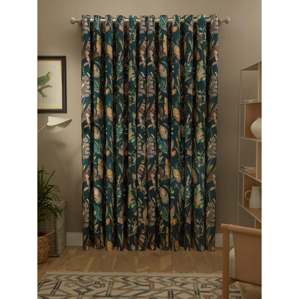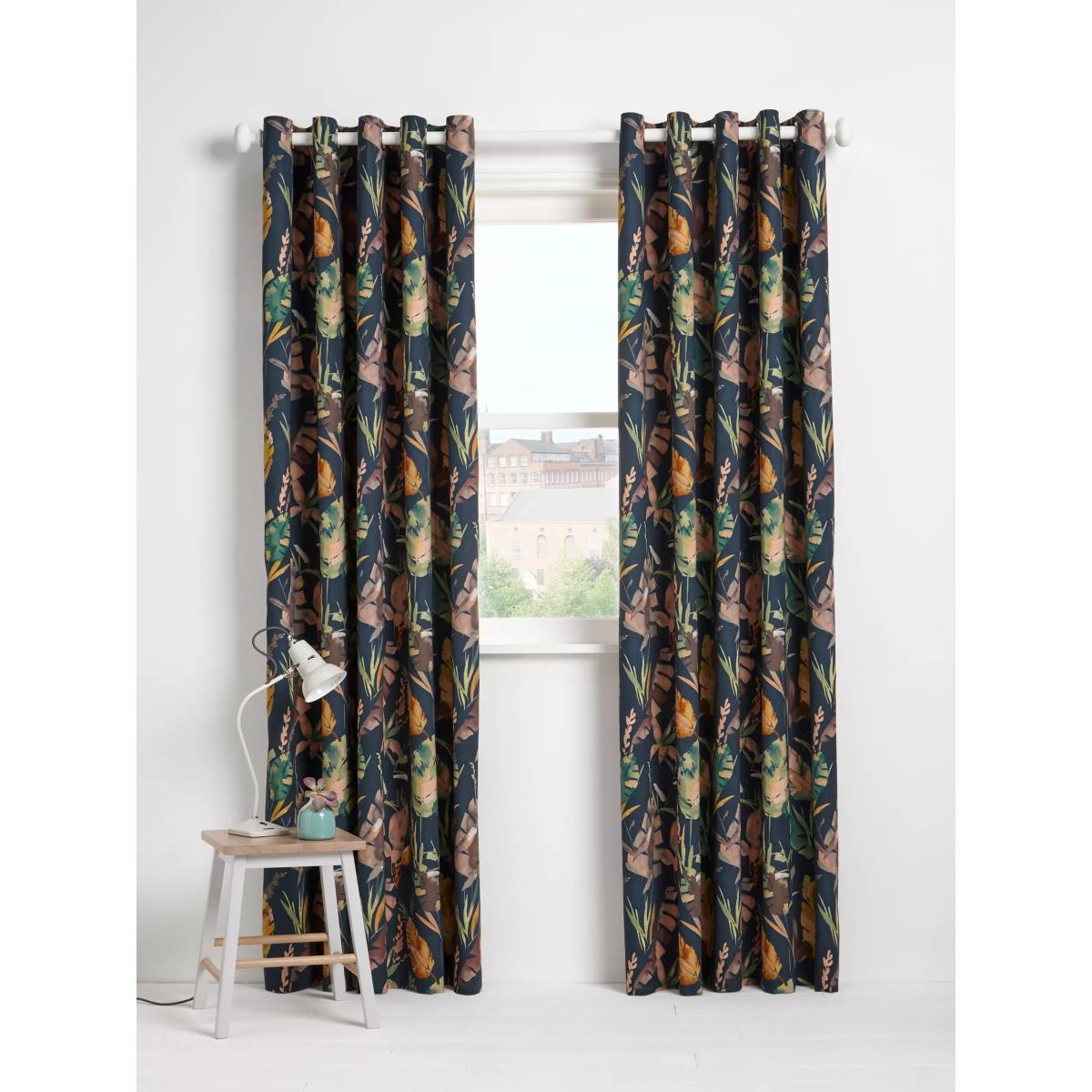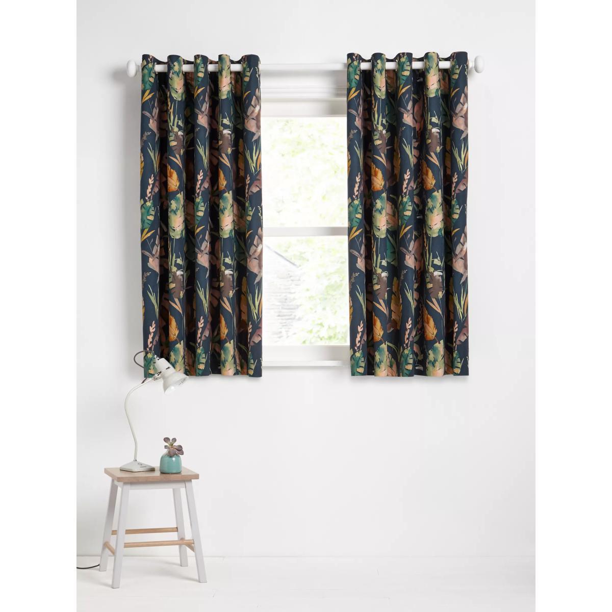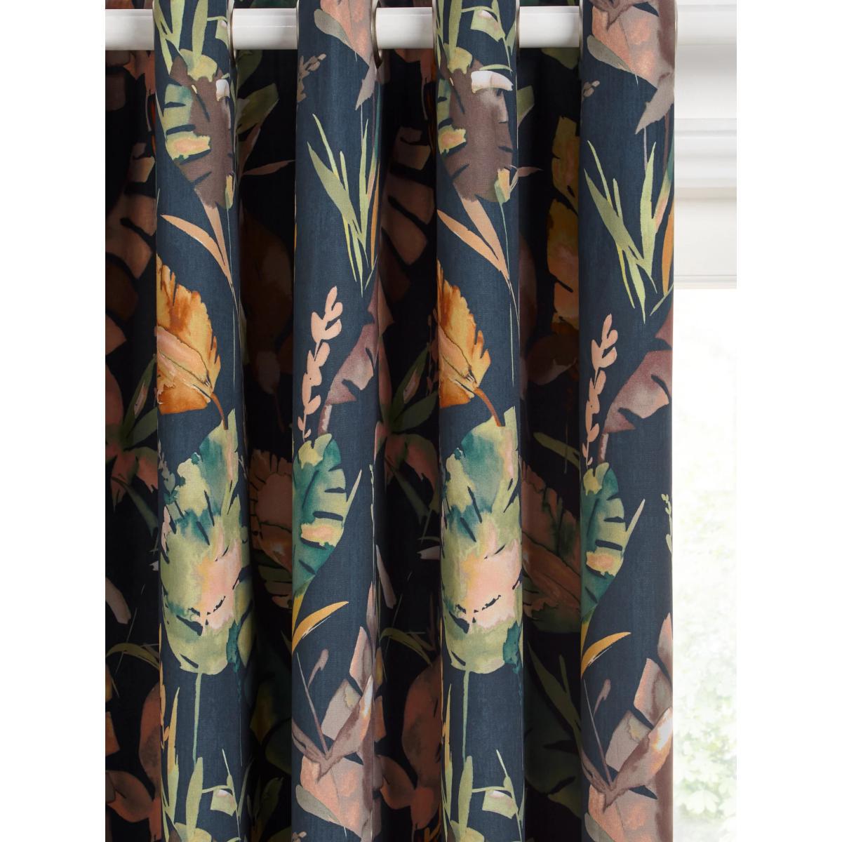 Cotton curtains with an oversized leaf pattern on a dark teal background. These curtains have an eyelet heading which gives them a more contemporary look with large, even folds. The blackout lining eliminates light and lends a full look to the curtain, improving the drape and enhancing the vibrancy of the pattern. The width stated indicates the size of one curtain panel when laid completely flat. This pack contains two panels, and the track/pole length we've recommended allows for the two panels to be gathered when the curtains are drawn. For a fuller look, increase the curtain width. One pair of 167cm width curtains will fit a curtain track/pole size of 133-167cm One pair of 228cm width curtains will fit a curtain track/pole size of 182-228cm Worth knowing... We package our curtains in recycled materials to keep them protected whilst they make their way to you. This means that when they arrive there could be some creases in them. We recommend you hang them for a few days to allow them to flatten and for the creases to fall out. If after this period your curtains still show signs of being folded then follow the ironing instructions on the back of the packaging. Be aware that each style of curtain has different ironing instructions, including heat limitations according to the fabric, so do make sure you follow the guidance provided to get the best results. Do you need a curtain pole/track and accessories?
