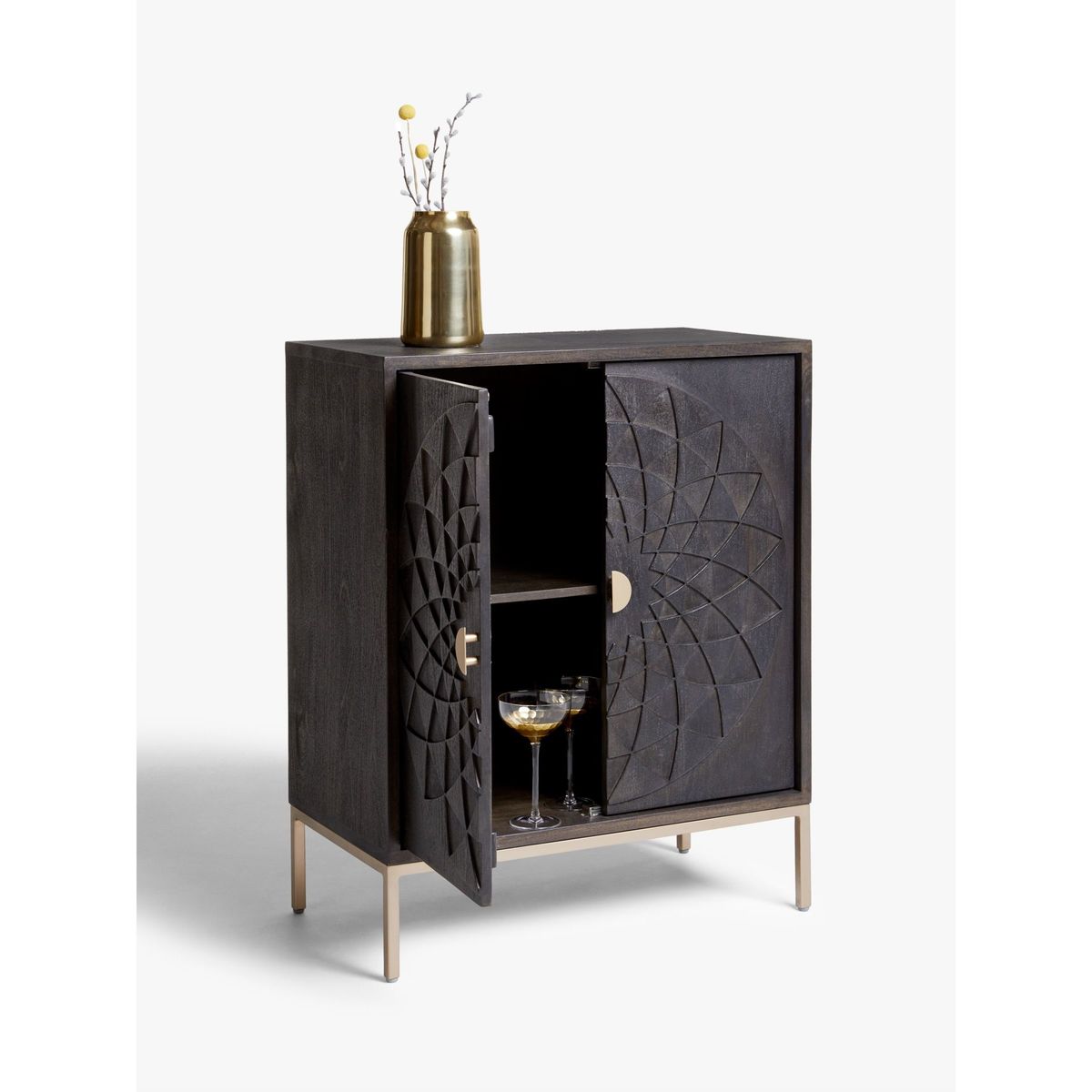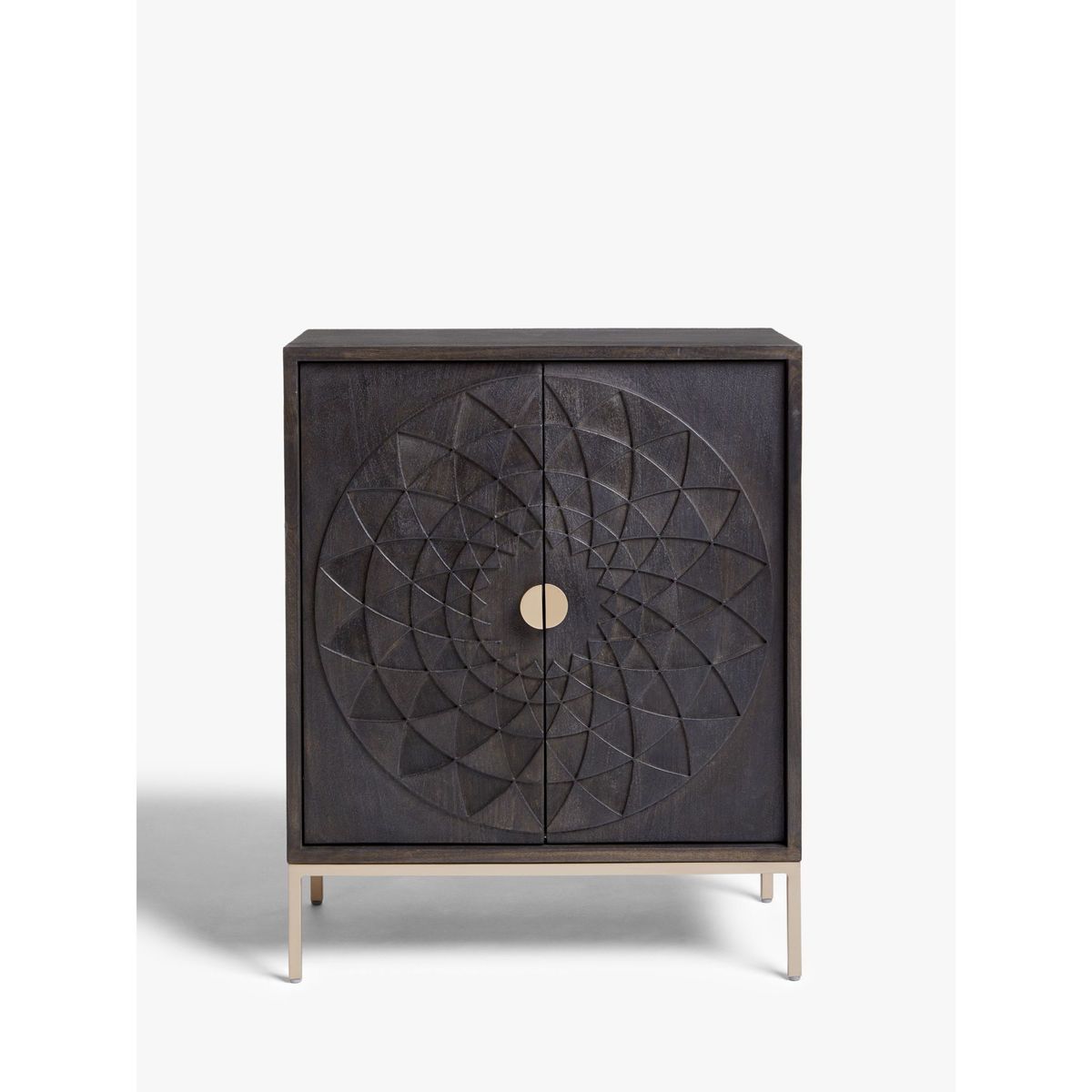 The allure of this storage cabinet comes from the beautiful mandala pattern that's been carefully carved into the doors. Made from solid acaica wood with MDF for support, our in-house designers created this functional cabinet into a bold and beautiful piece that will become a focal point in your room. It's finished with robust iron details for stability and there's a fixed shelf inside. Want to see it first? You may want to see and get a feel for the furniture in one of our shops before ordering. We'll be able to tell you where the range you'd like to view is on display.