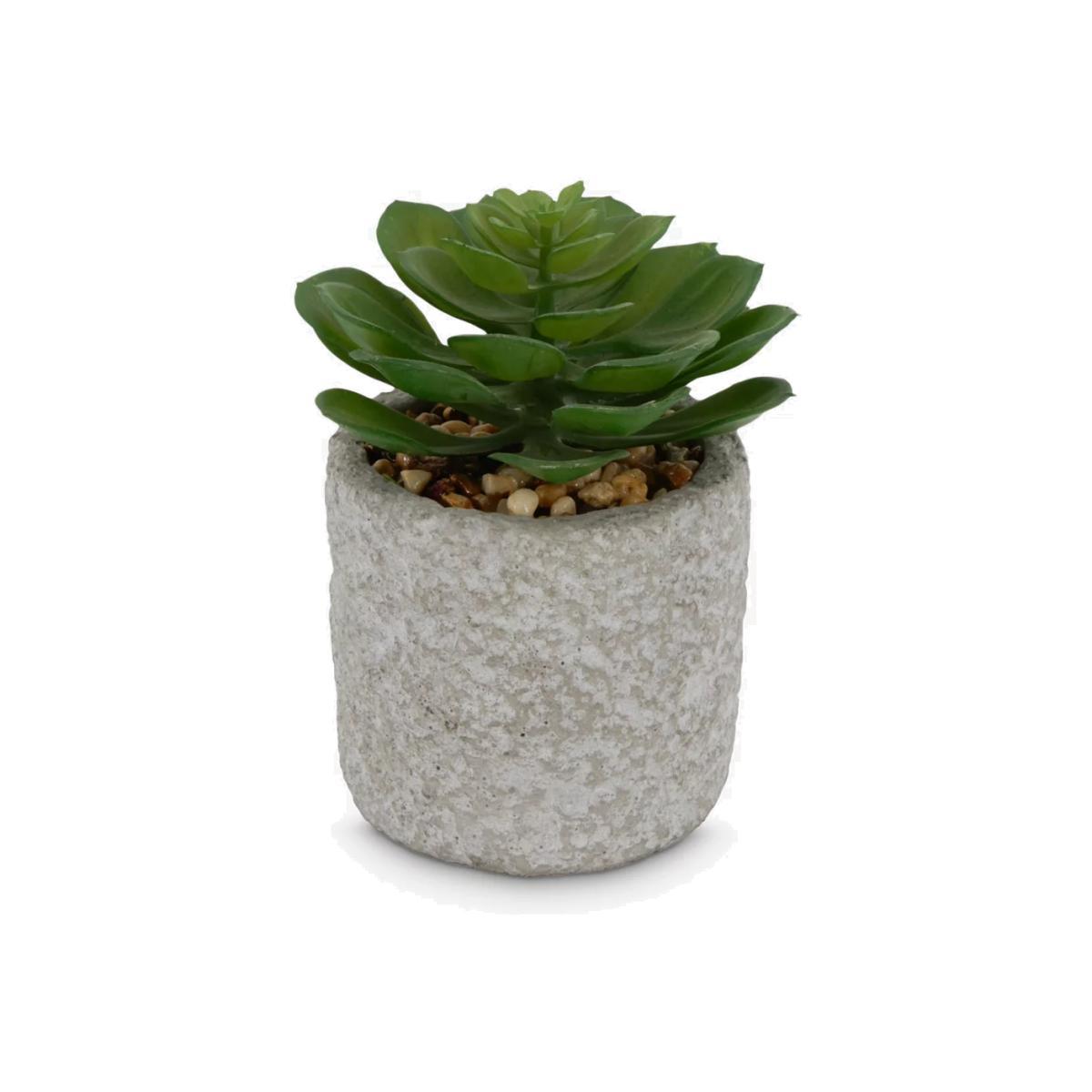 This mini, artificial succulent is set into a rustic finish grey mini planter, perfect for small spaces which need brightening in your home, like your mantlepiece, shelf, or on your desk.
