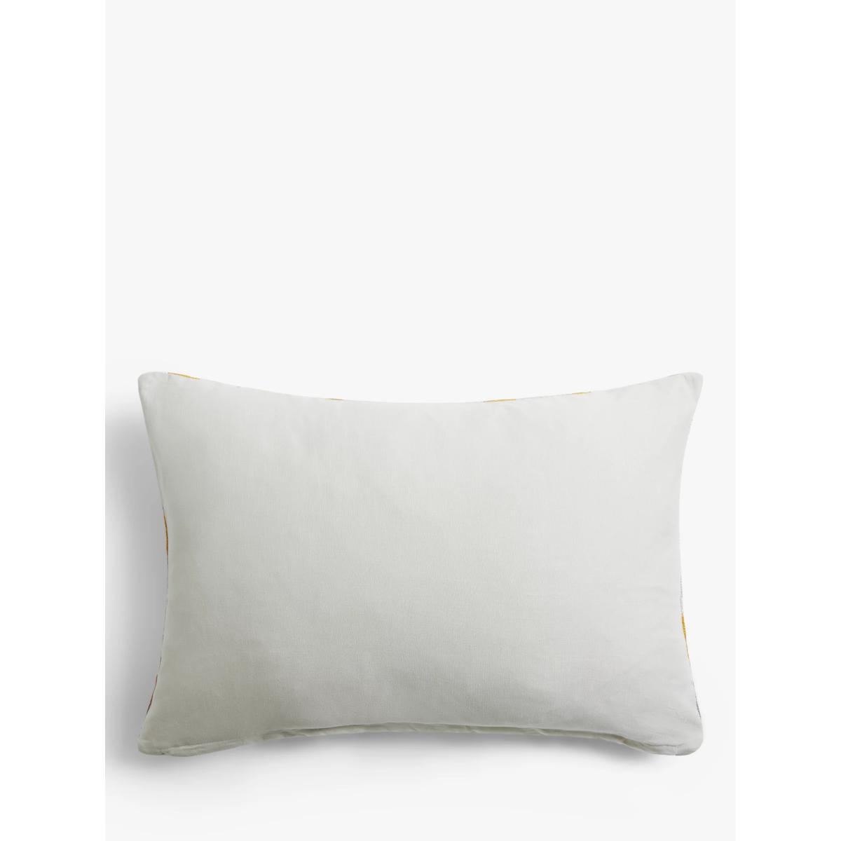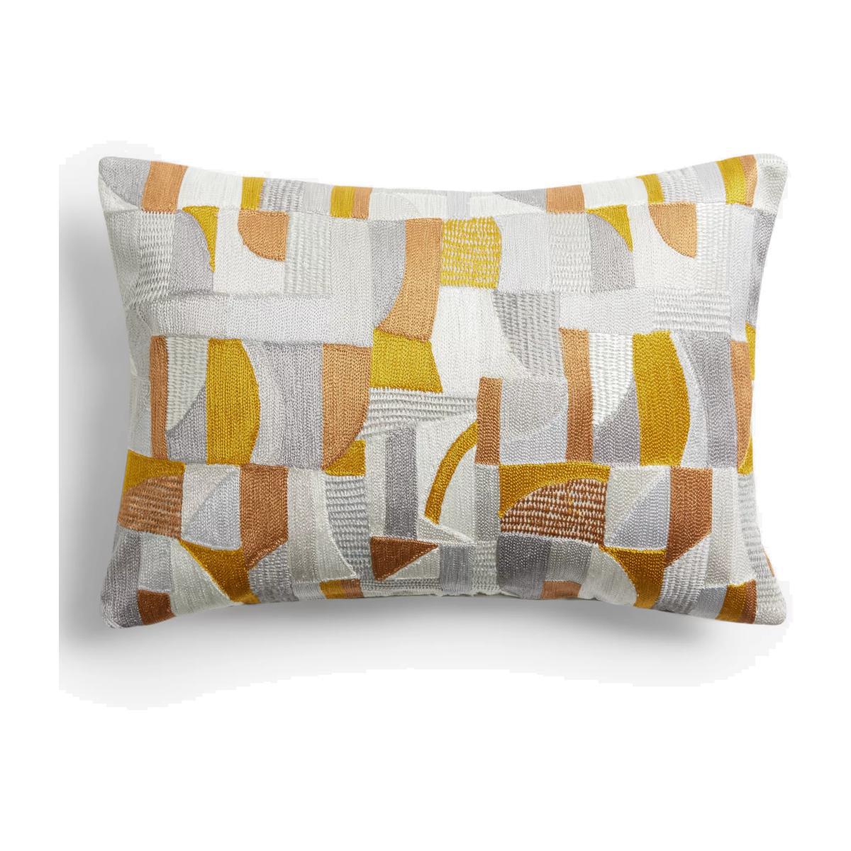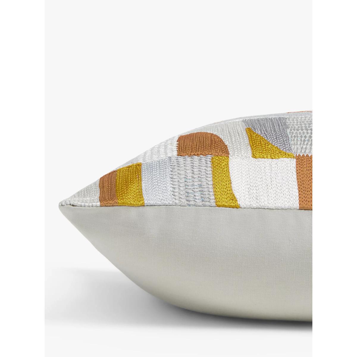A wonderfully tactile cushion covered with intricate, geometric embroidery for a pleasing patchwork of colour.