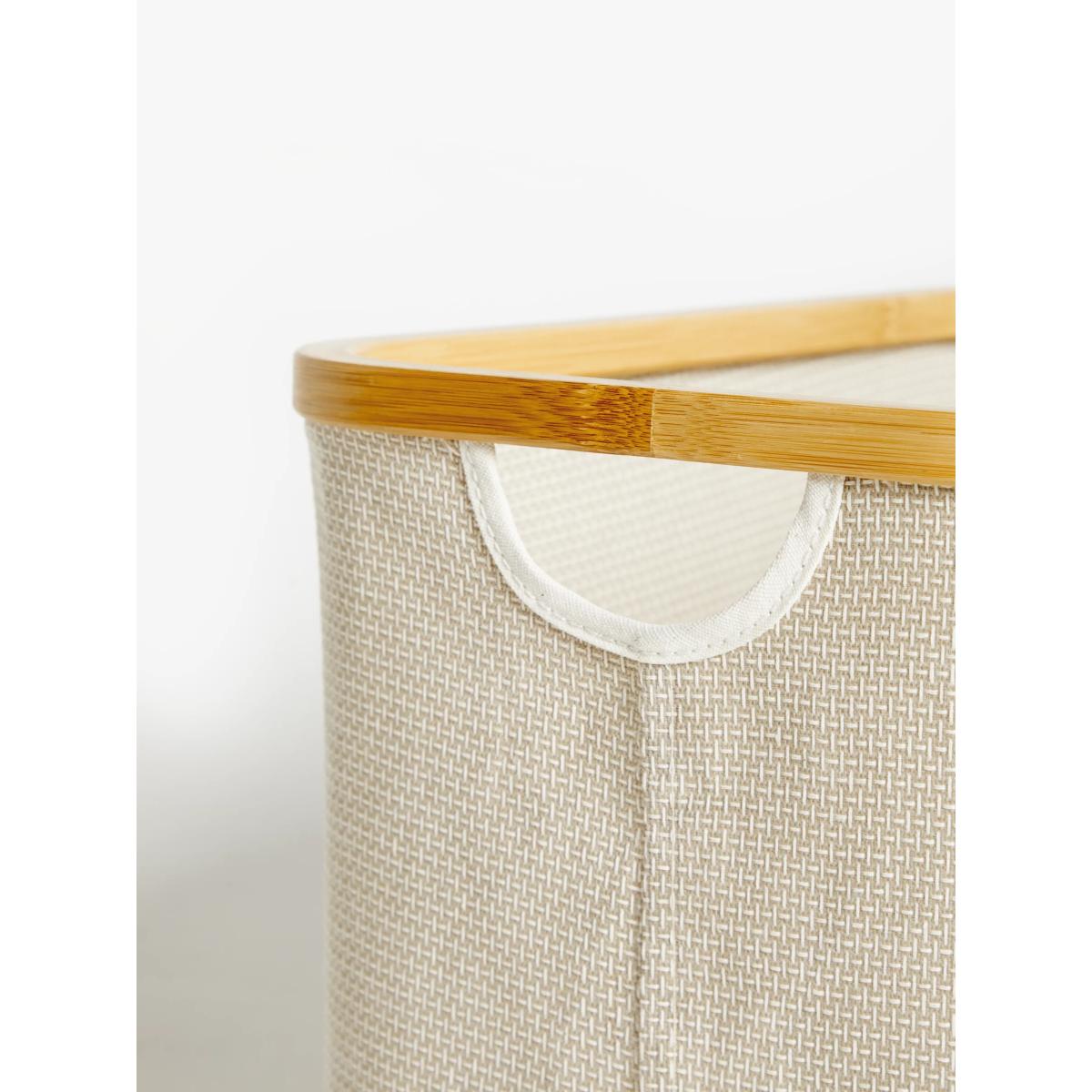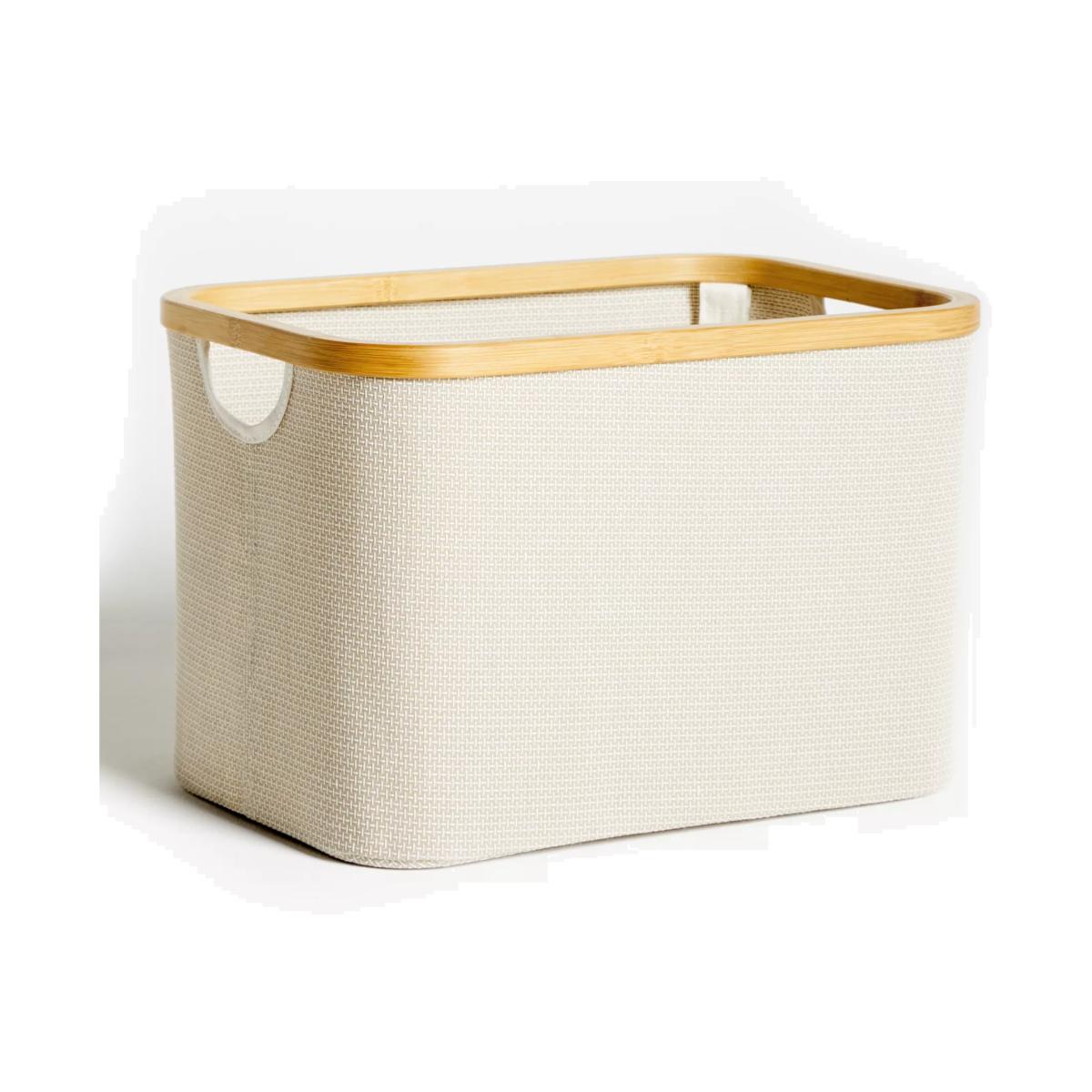 I love this basket for its clean, versatile design that effortlessly blends function with style. Its neutral tone and natural bamboo rim add a subtle touch of warmth, making it suitable for a variety of interiors-from modern minimal to cosy Scandinavian schemes. It works particularly well when used for organising textiles, magazines, or children's toys in living rooms or bedrooms, helping to keep clutter out of sight while maintaining a tidy aesthetic. Practical styling tips include pairing it with other natural or neutral-toned accessories to create a cohesive look, and using it as a multi-purpose organiser in open shelving or under the console to maximise space efficiency. Its sturdy handle cut-outs also make it easy to move around, offering both style and practicality.