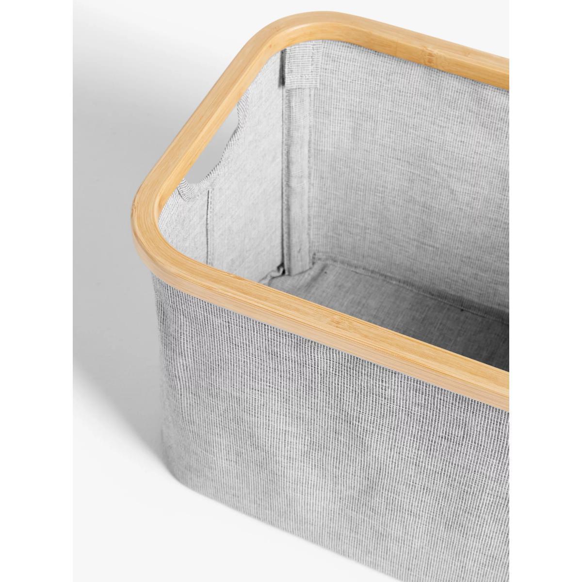 Durable, sustainable bamboo paired with a rounded rectangular fabric basket to store household essentials. The collapsible bamboo supports fold down for compact storage.