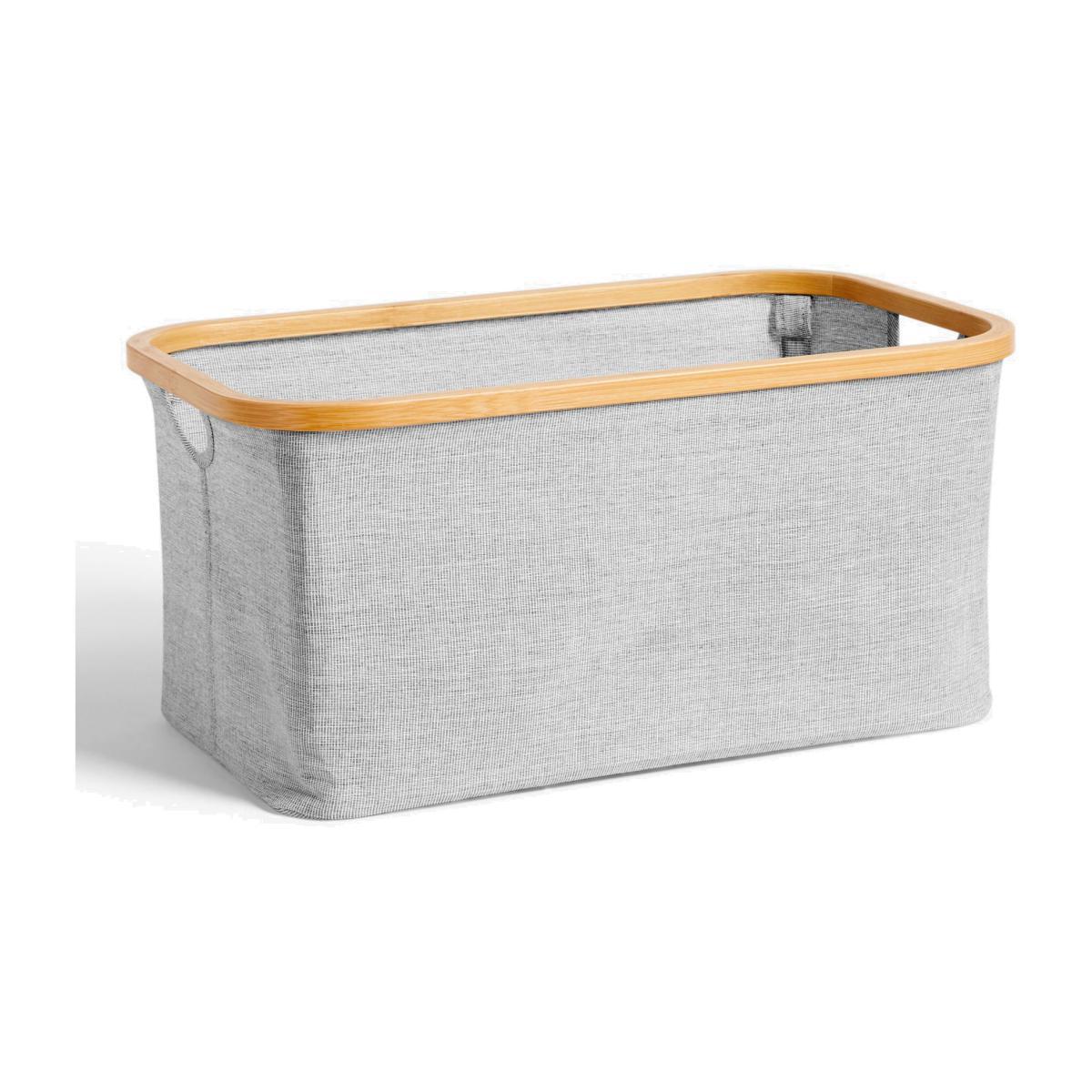 Durable, sustainable bamboo paired with a rounded rectangular fabric basket to store household essentials. The collapsible bamboo supports fold down for compact storage.
