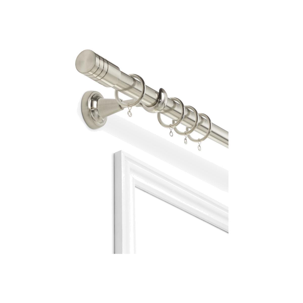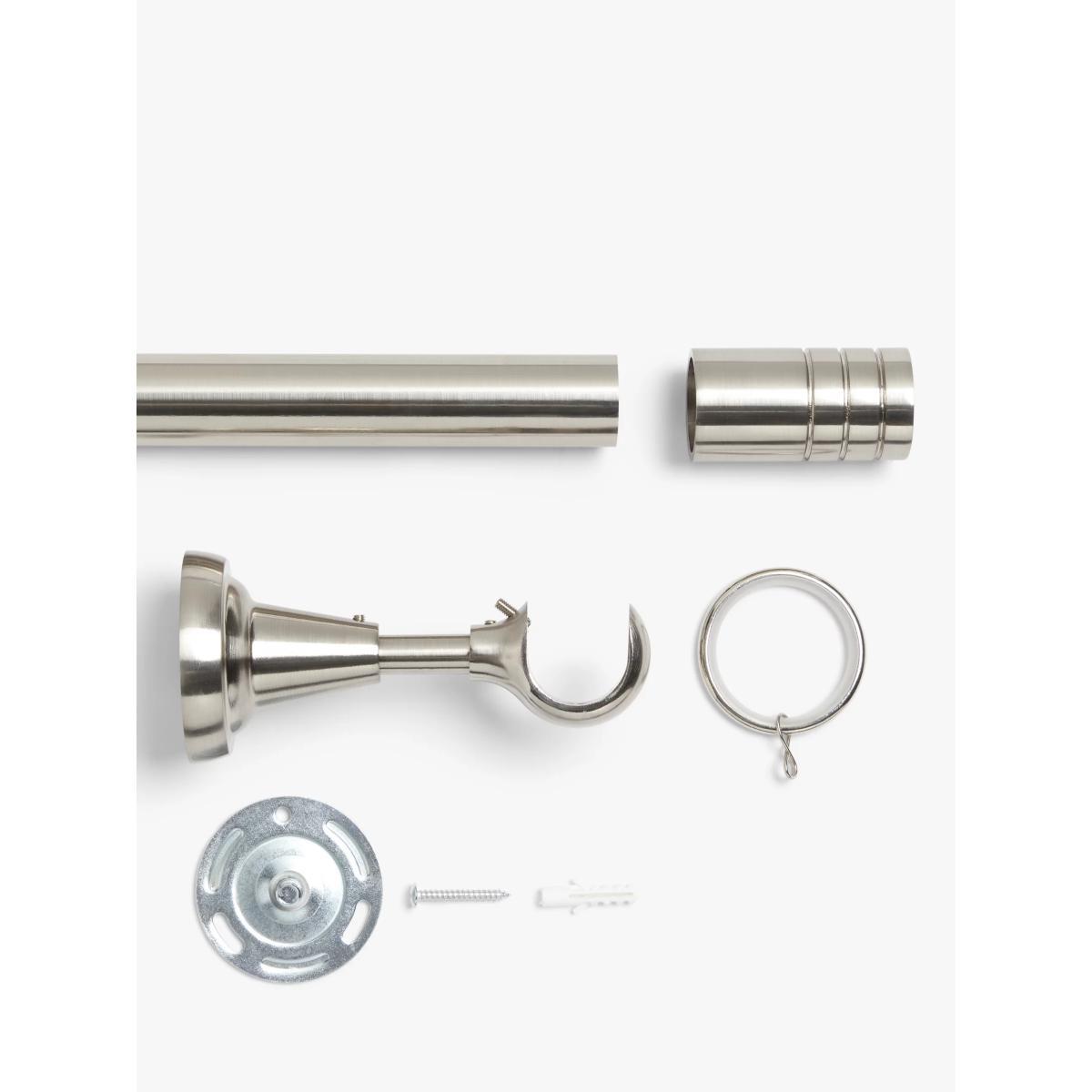 Suitable for all curtain types, this pole kit has contemporary styling with its brushed steel finish and barrel stud finials. This kit contains all the accessories and fittings you'll need to fit your pole, so all that's left is to choose your curtains. Comprehensive instructions offer a step-by-step guide, whether you're using the pole as it comes or cutting it to size. Kit includes: L120cm L180cm L240cm L300cm L360cm Curtain pole 1 1 2 plus a connector 2 plus a connector 2 plus a connector Brackets 2 2 3 3 3 Finials 2 2 2 2 2 Rings 12 18 24 30 36 Other Screws and wall plugs Screws and wall plugs Screws, wall plugs and a double-ended joining screw Screws, wall plugs and a double-ended joining screw Screws, wall plugs and a double-ended joining screw Additional rings are available separately.