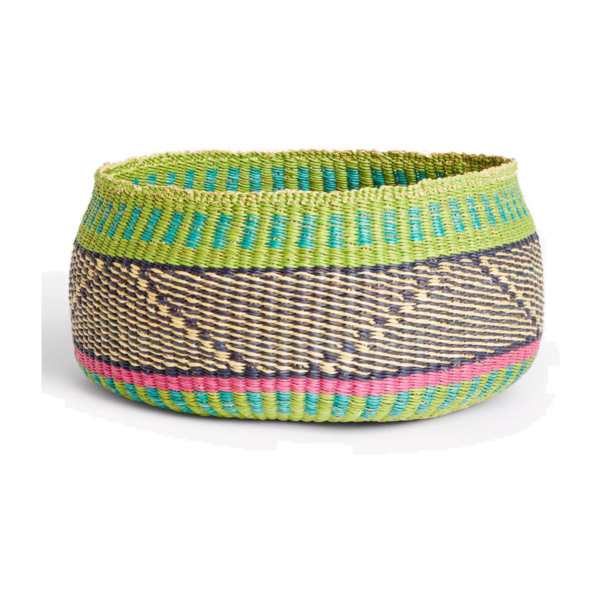 This colourful bowl basket is handy for storing all sorts of odds and ends. It's woven using using elephant grass from North African grasslands. This material holds vibrant colours that artisans use to create decorative yet durable pieces using traditional weaving techniques from Ghana villages. We've worked with Partner Africa to ensure working conditions are fair. This allows the artisans in the villages to sustain their weaving businesses and teach the women weavers many life skills.