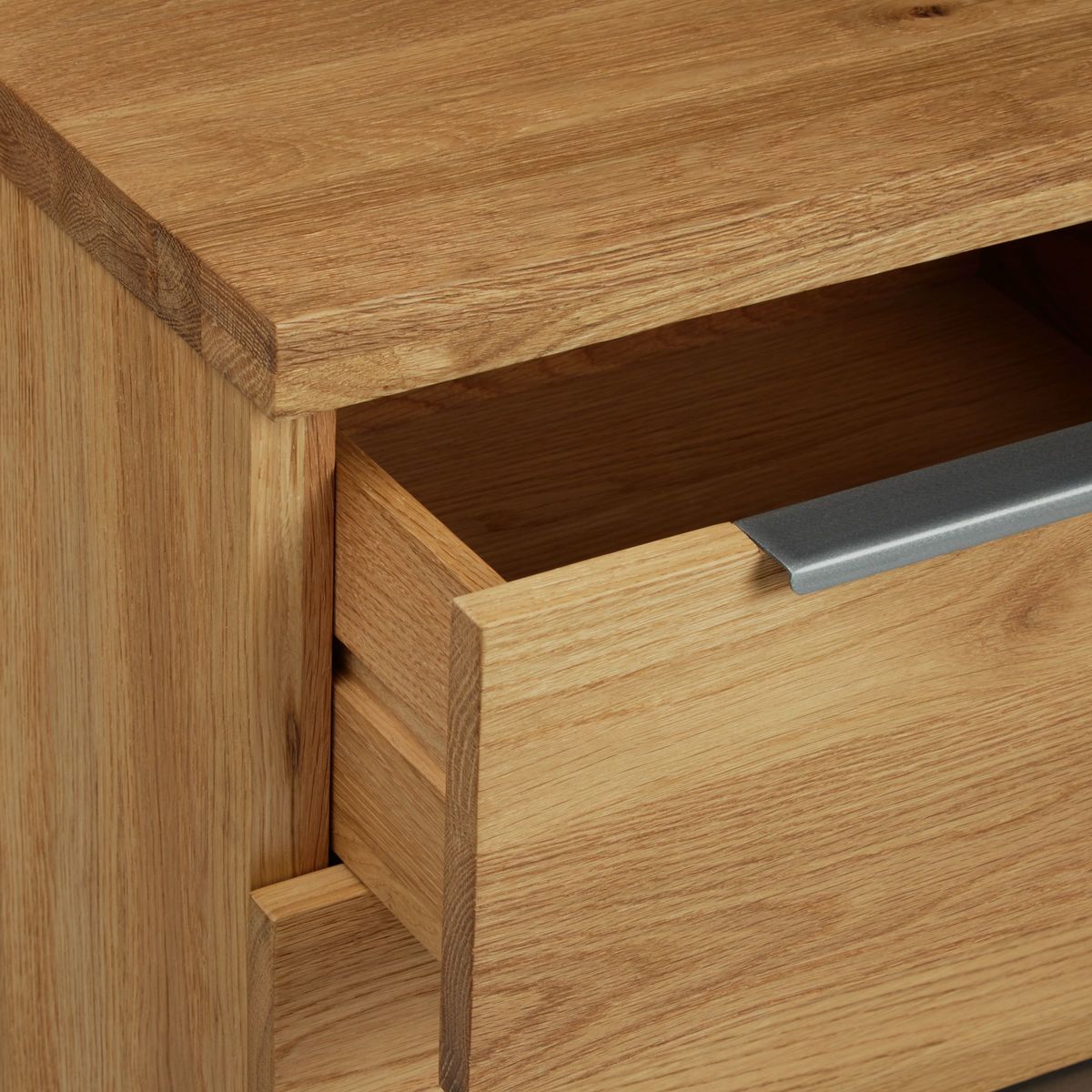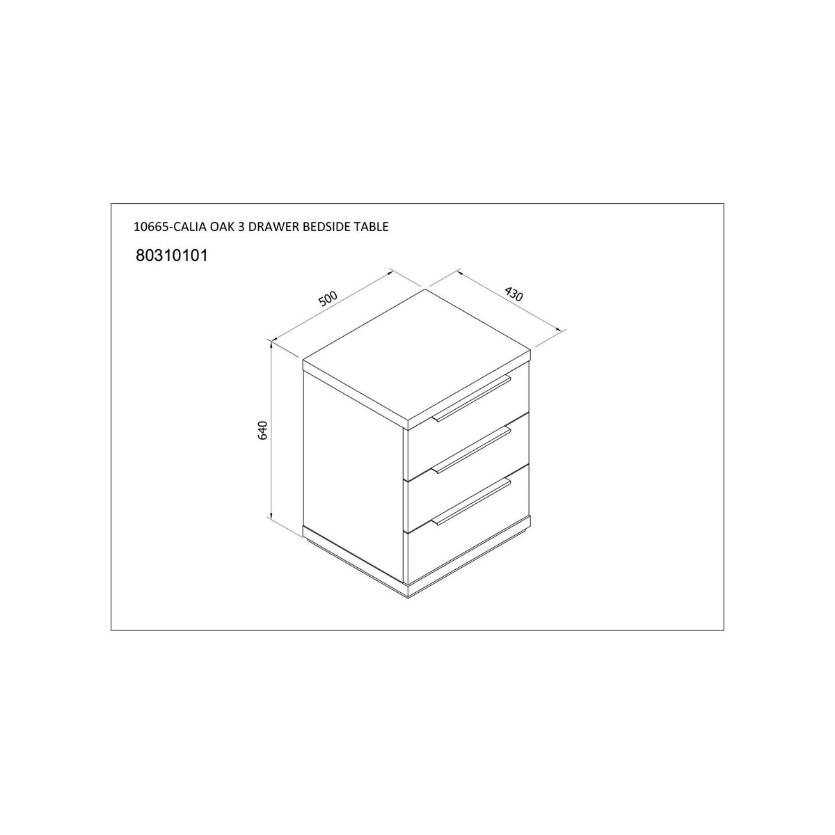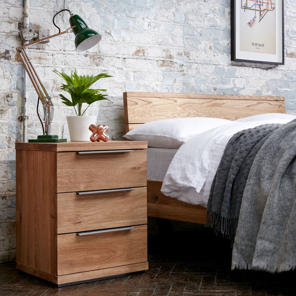 Made predominantly from solid American white oak, our Calia range of furniture has a natural, rustic look thanks to its wire-brushed, distressed finish. Each piece is made from individual wood slats that are carefully selected and sorted by skilled craftsman. They ensure that the natural pattern in the wood grain, even with its unique irregularities, uphold our design and quality standards, to offer an authentic and tactile look. This industrial-inspired, simple bedside table offers ample space for your bedside essentials thanks to its three drawers that open on wooden runners. Functional in design, its iron handles and base contrast against the warm tones of the oak. Worth knowing. Oak is a natural, living material, and part of its charm is that it develops over time. This means that surface splits may start to appear with the natural movement of the wood. Knots will vary in size and location and a subtle colour variation can also be expected. These distinctive qualities give the range a unique feel, as no two pieces will be exactly the same. To keep your furniture looking its best, we recommend periodic oiling. This is applicable to the Oak version only, as the Dark version has a lacquered finish. More information can be found in the assembly instructions supplied.