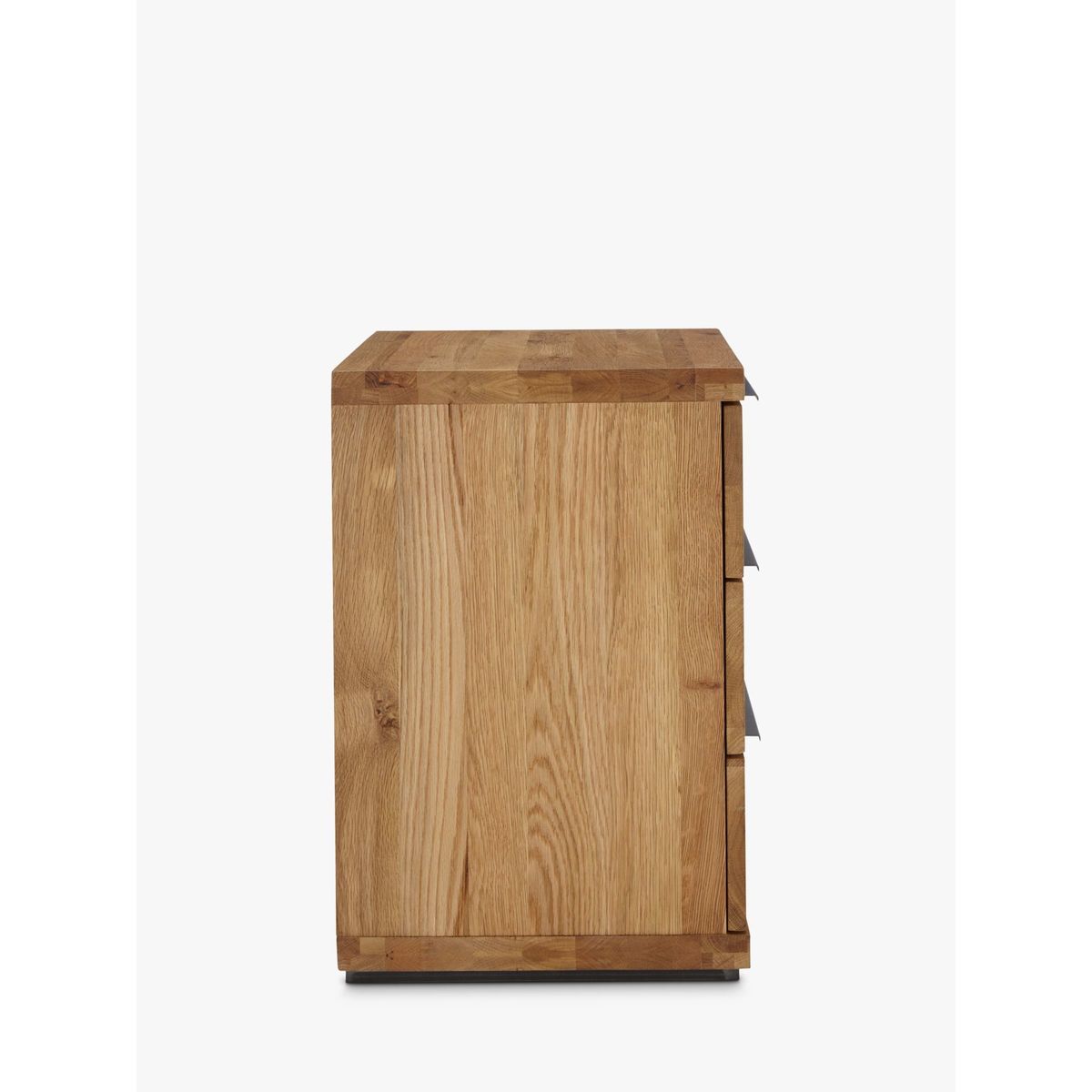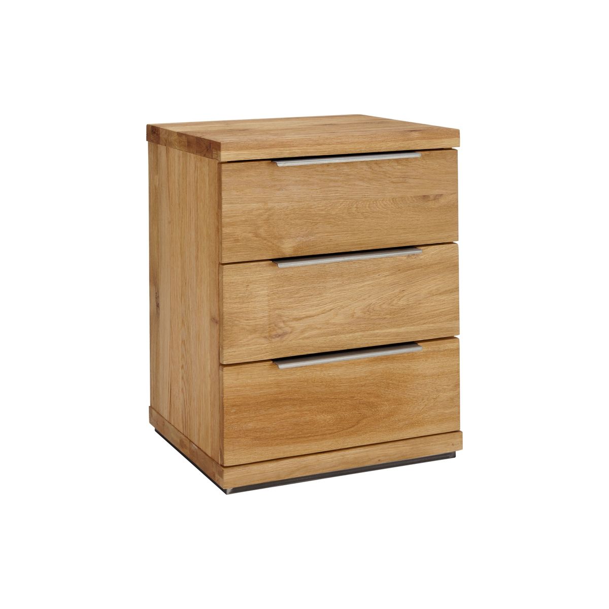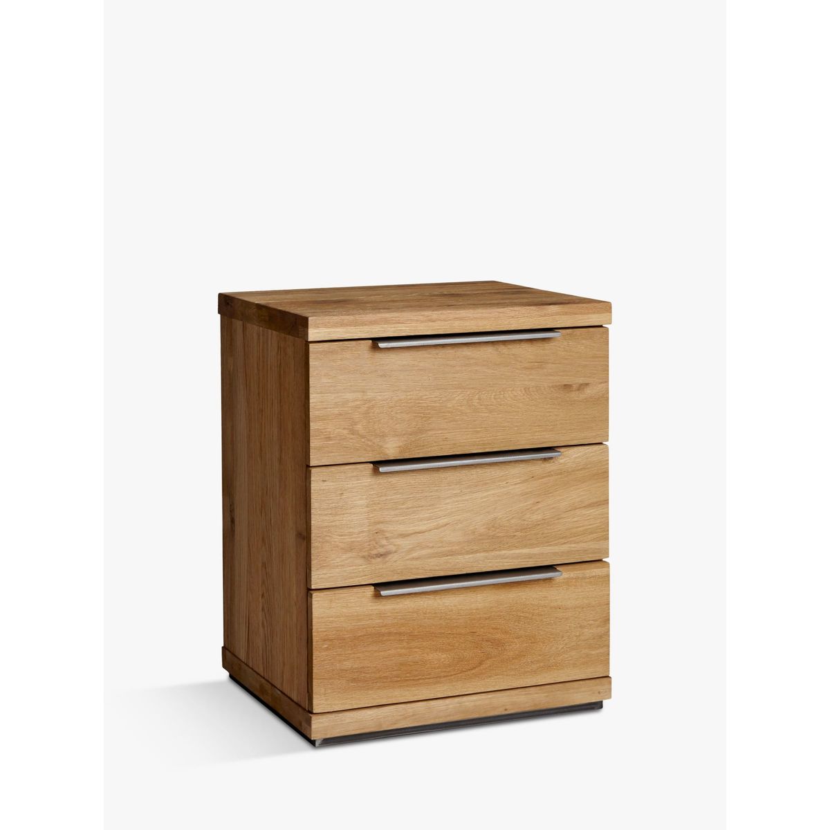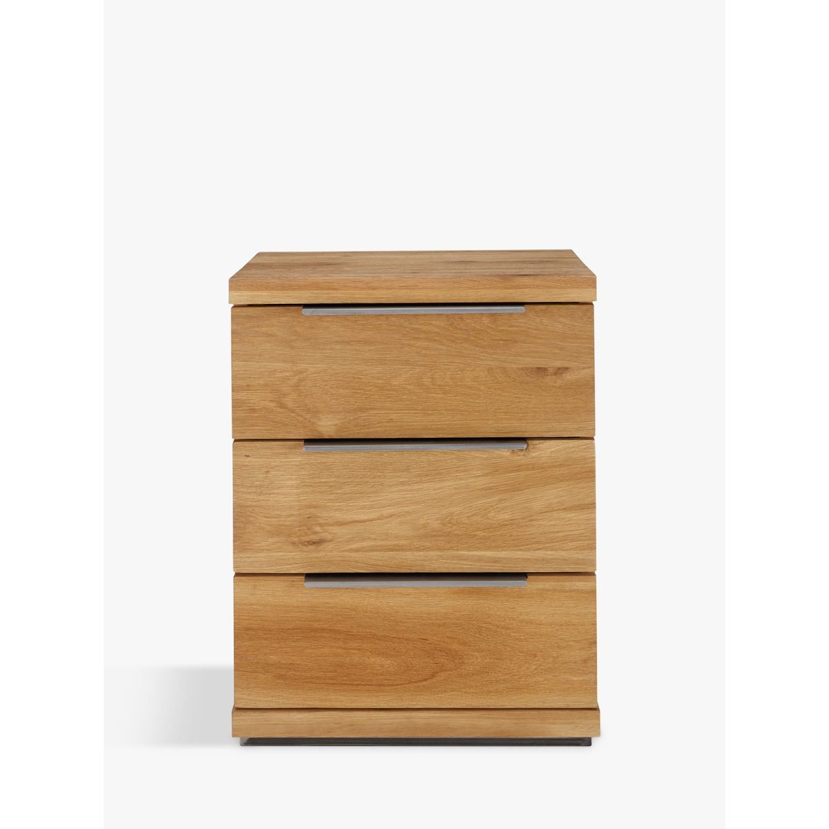Made predominantly from solid American white oak, our Calia range of furniture has a natural, rustic look thanks to its wire-brushed, distressed finish. Each piece is made from individual wood slats that are carefully selected and sorted by skilled craftsman. They ensure that the natural pattern in the wood grain, even with its unique irregularities, uphold our design and quality standards, to offer an authentic and tactile look. This industrial-inspired, simple bedside table offers ample space for your bedside essentials thanks to its three drawers that open on wooden runners. Functional in design, its iron handles and base contrast against the warm tones of the oak. Worth knowing. Oak is a natural, living material, and part of its charm is that it develops over time. This means that surface splits may start to appear with the natural movement of the wood. Knots will vary in size and location and a subtle colour variation can also be expected. These distinctive qualities give the range a unique feel, as no two pieces will be exactly the same. To keep your furniture looking its best, we recommend periodic oiling. This is applicable to the Oak version only, as the Dark version has a lacquered finish. More information can be found in the assembly instructions supplied.