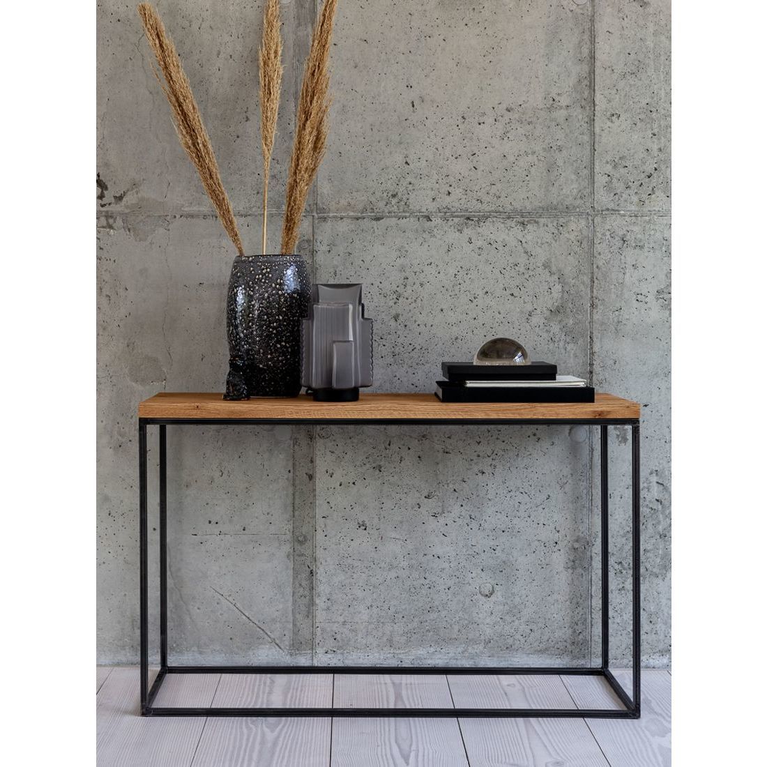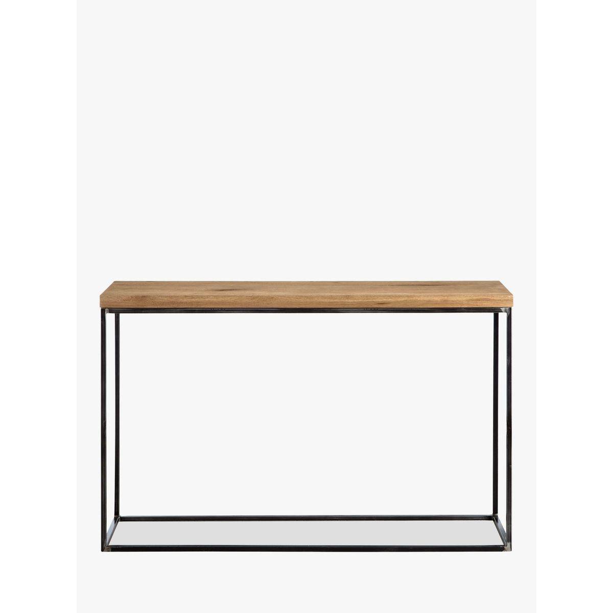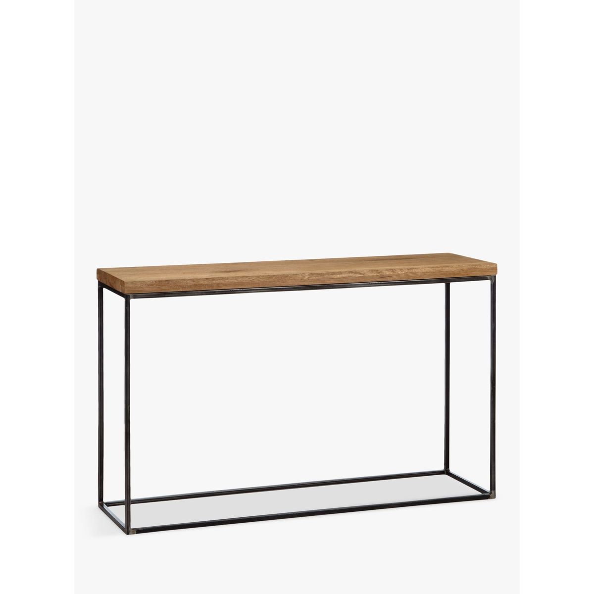 Made predominantly from solid American white oak, our Calia range of furniture has a natural, rustic look thanks to its wire-brushed, distressed finish. Each piece is made from individual wood slats that are carefully selected and sorted by skilled craftsman. They ensure that the natural pattern in the wood grain, even with its unique irregularities, uphold our design and quality standards, to offer an authentic and tactile look. This slimline, industrial-inspired console table is ideal for smaller spaces of hallways. Simple and functional in design, it is supported by a robust, welded iron frame that's finished with a durable lacquer. Worth knowing Oak is a natural, living material, and part of its charm is that it develops over time. This means that surface splits may start to appear with the natural movement of the wood. Knots will vary in size and location and a subtle colour variation can also be expected. These distinctive qualities give the range a unique feel, as no two pieces will be exactly the same. To keep your furniture looking its best, we recommend periodic oiling and oiling before first use. This is applicable to the Oak version only, as the Dark version has a lacquered finish. More information can be found in the assembly instructions supplied. Want to see it first? You may want to see and get a feel for the furniture in one of our shops before ordering. We'll be able to tell you where the range you'd like to view is on display.