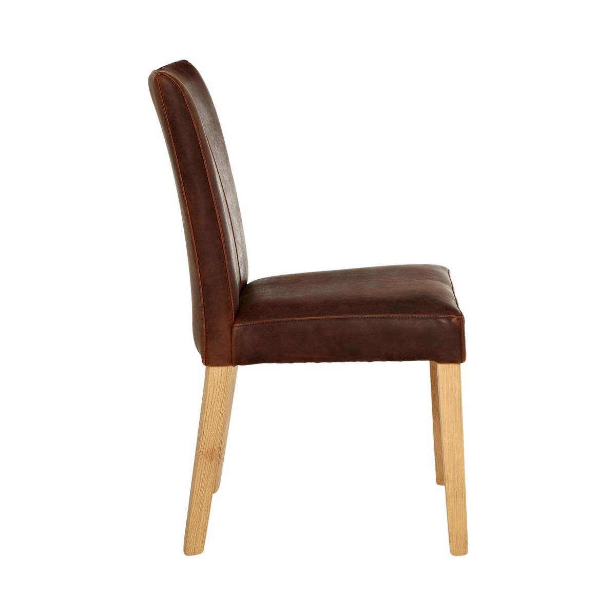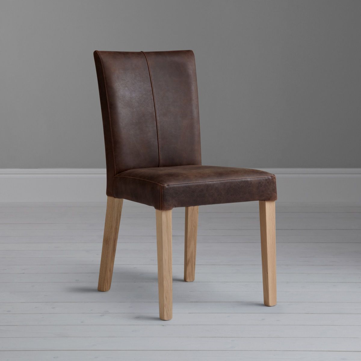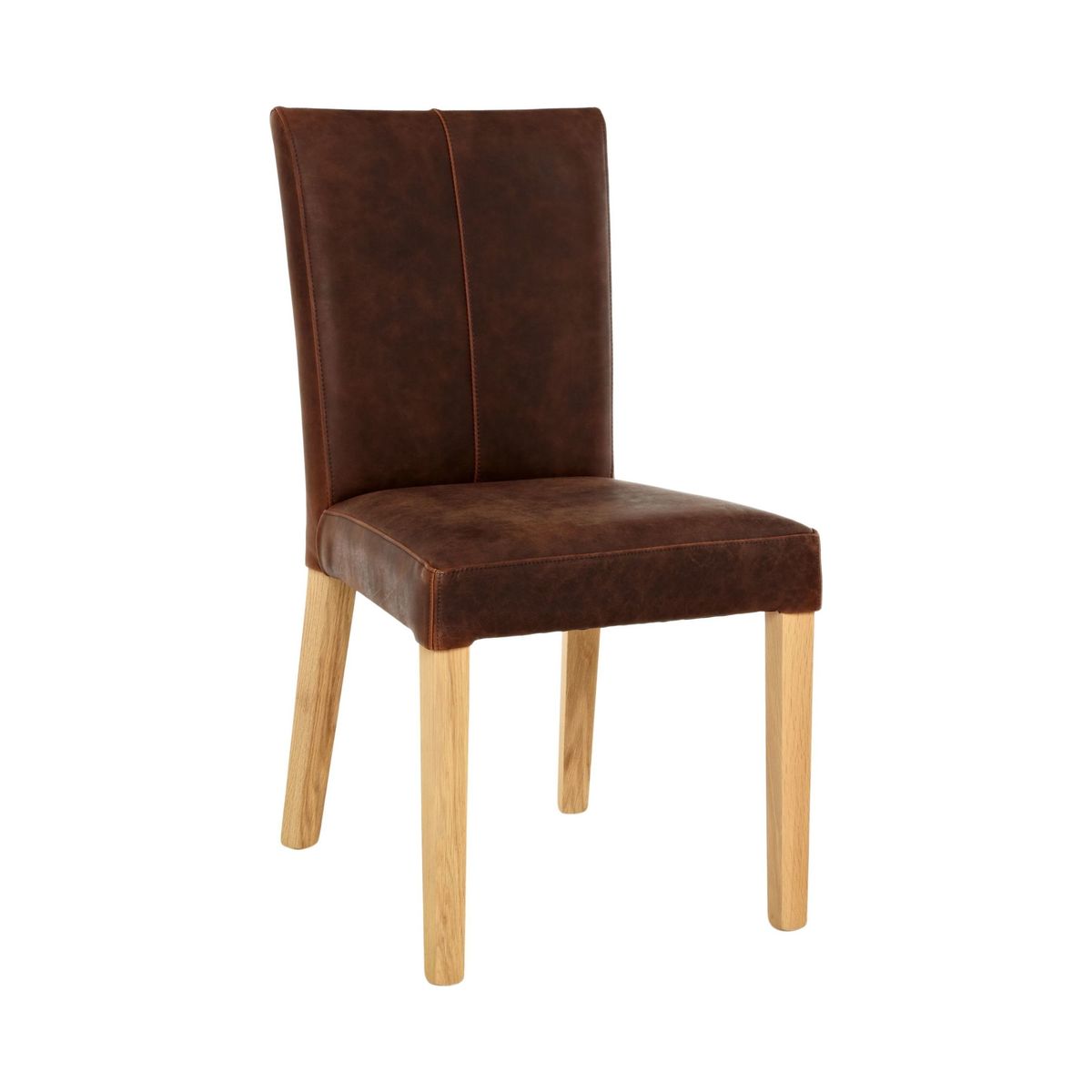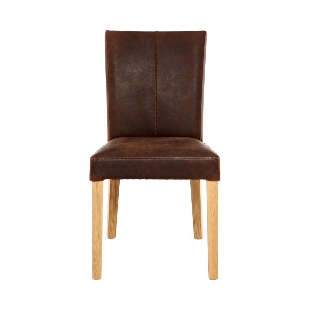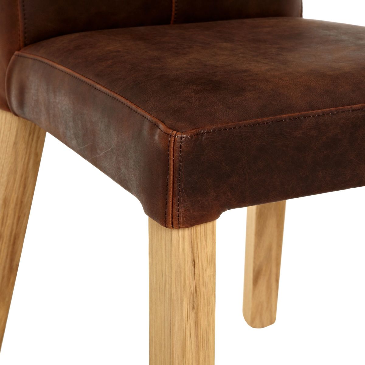A timeless classic that brings rustic charm and modern finesse together in one elegant piece, this Calia dining chair is perfect for creating an atmosphere.;Crafted from stained oak for durability and style, it has been wire brushed to give a naturally weathered look that enhances the natural grain. It also features distressed leather upholstery for a tactile finish.