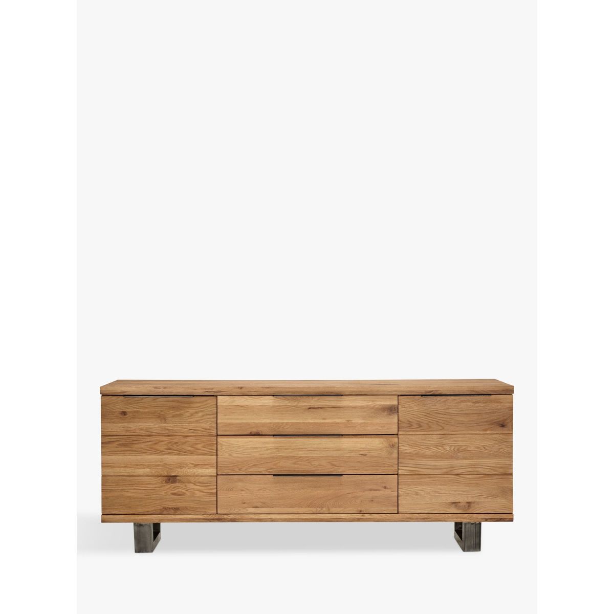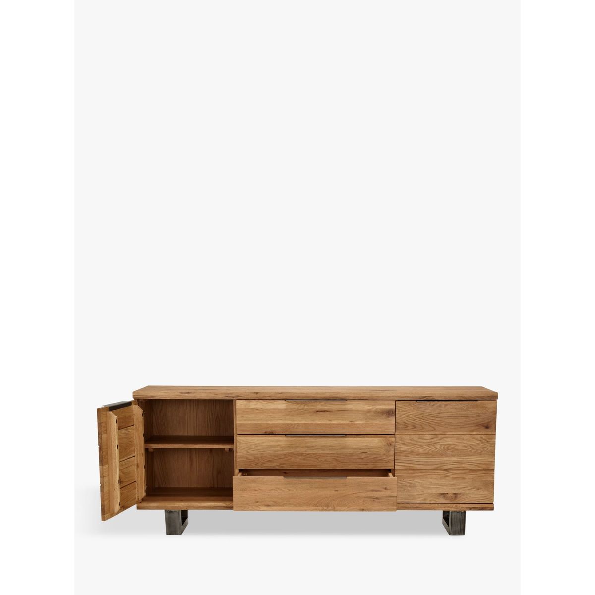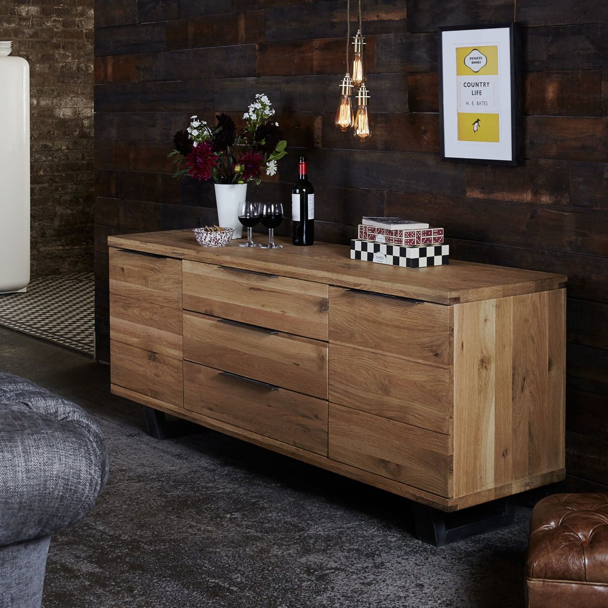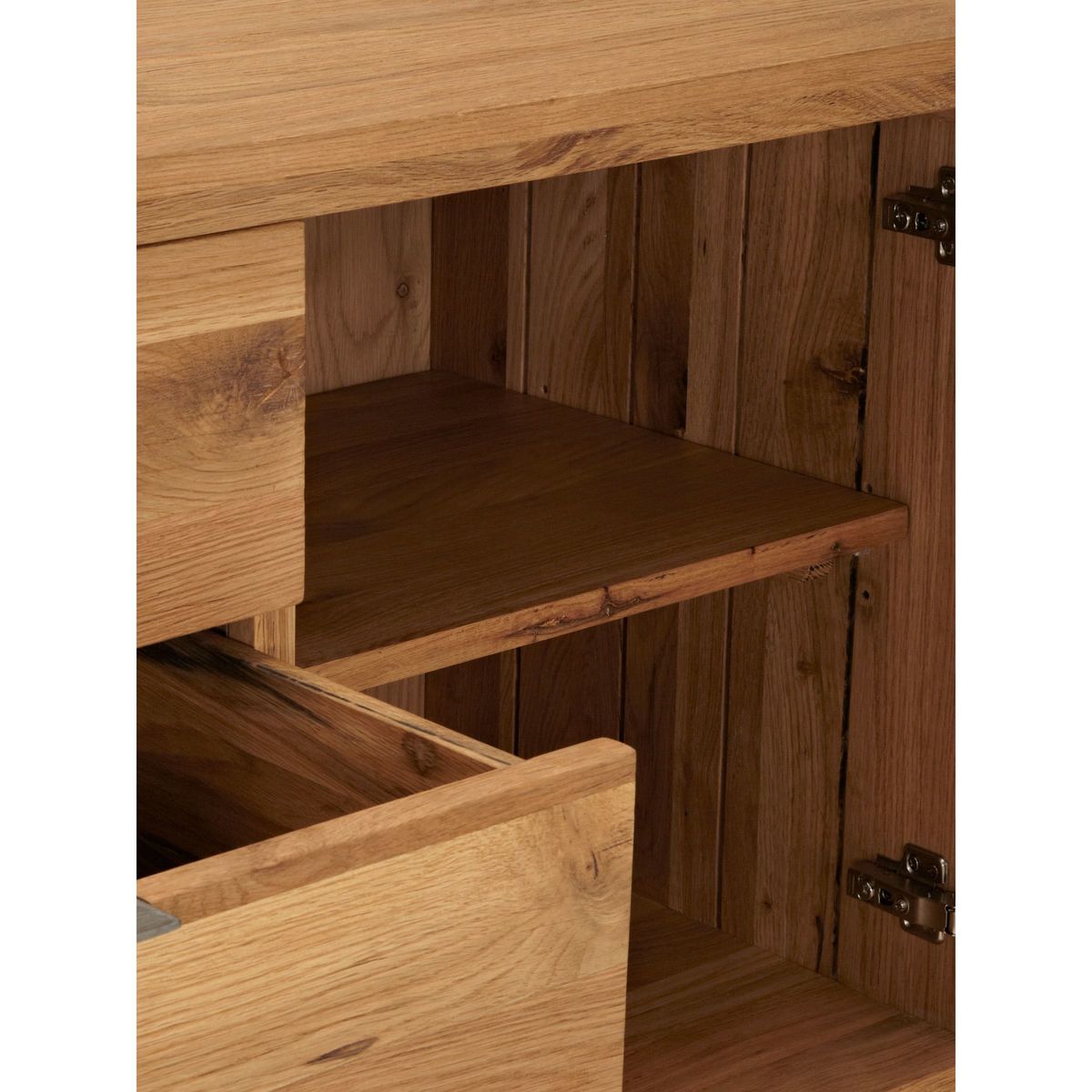 Made predominantly from solid American white oak, our Calia range of furniture has a natural, rustic look thanks to its wire-brushed, distressed finish. Each piece is made from individual wood slats that are carefully selected and sorted by skilled craftsman. They ensure that the natural pattern in the wood grain, even with its unique irregularities, uphold our design and quality standards, to offer an authentic and tactile look. This solid sideboard offers ample storage space thanks to its three drawers and two cupboard sections. The internal shelves are adjustable and its industrial-inspired design is supported by a robust, welded iron base that's finished with a durable lacquer. Worth knowing Oak is a natural, living material, and part of its charm is that it develops over time. This means that surface splits may start to appear with the natural movement of the wood. Knots will vary in size and location and a subtle colour variation can also be expected. These distinctive qualities give the range a unique feel, as no two pieces will be exactly the same. To keep your furniture looking its best, we recommend periodic oiling and oiling before first use. This is applicable to the Oak version only, as the Dark version has a lacquered finish. More information can be found in the assembly instructions supplied. Want to see it first? You may want to see and get a feel for the furniture in one of our shops before ordering. We'll be able to tell you where the range you'd like to view is on display.