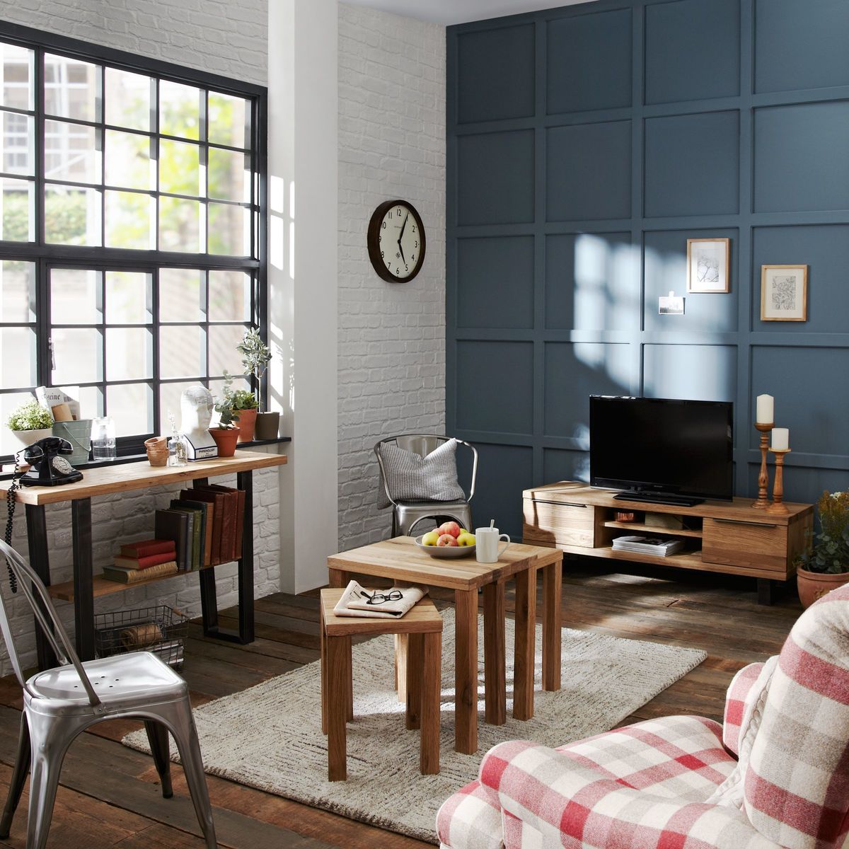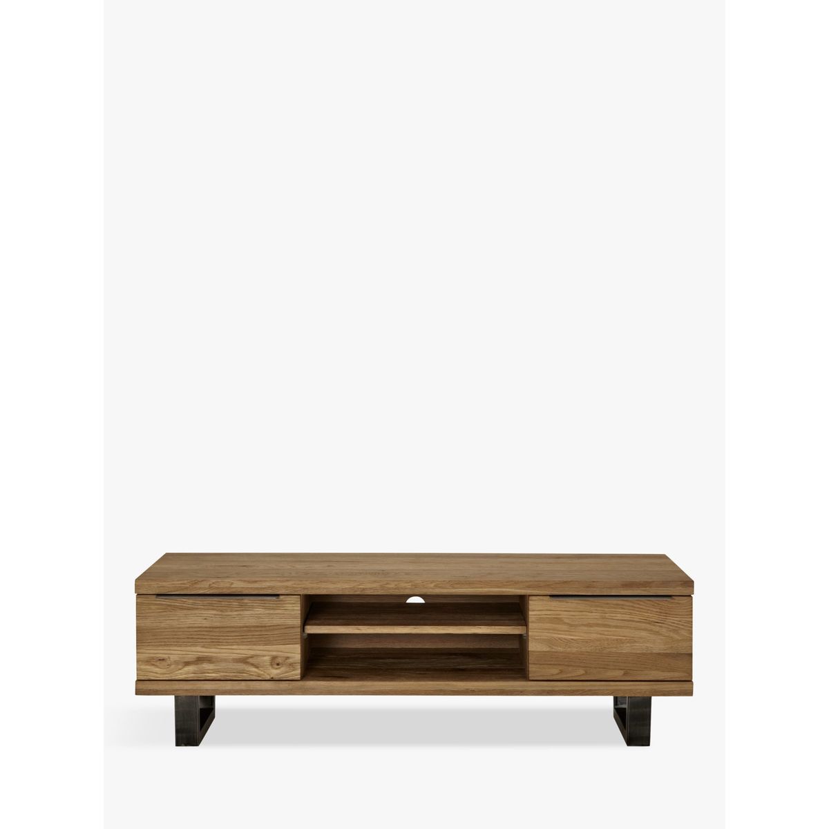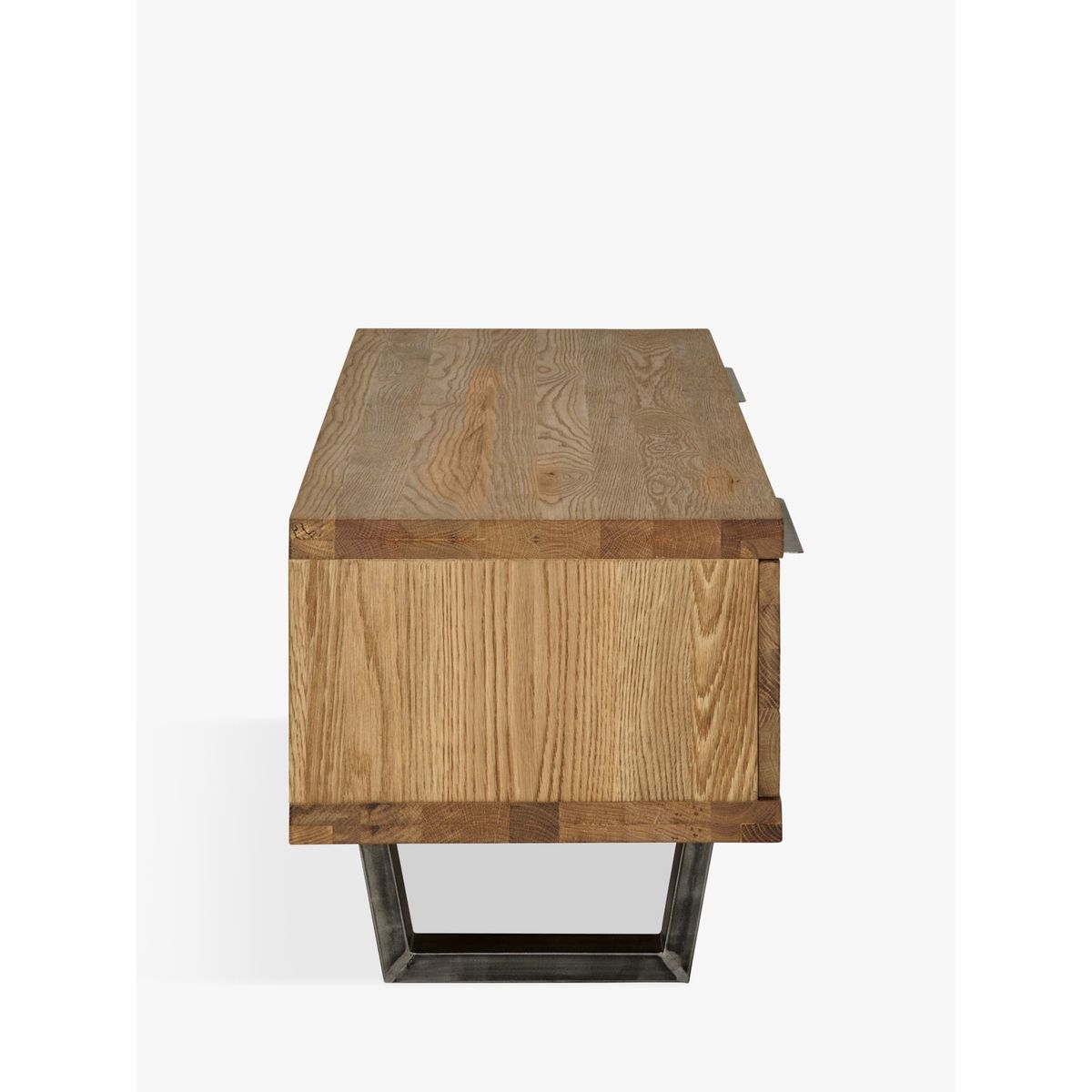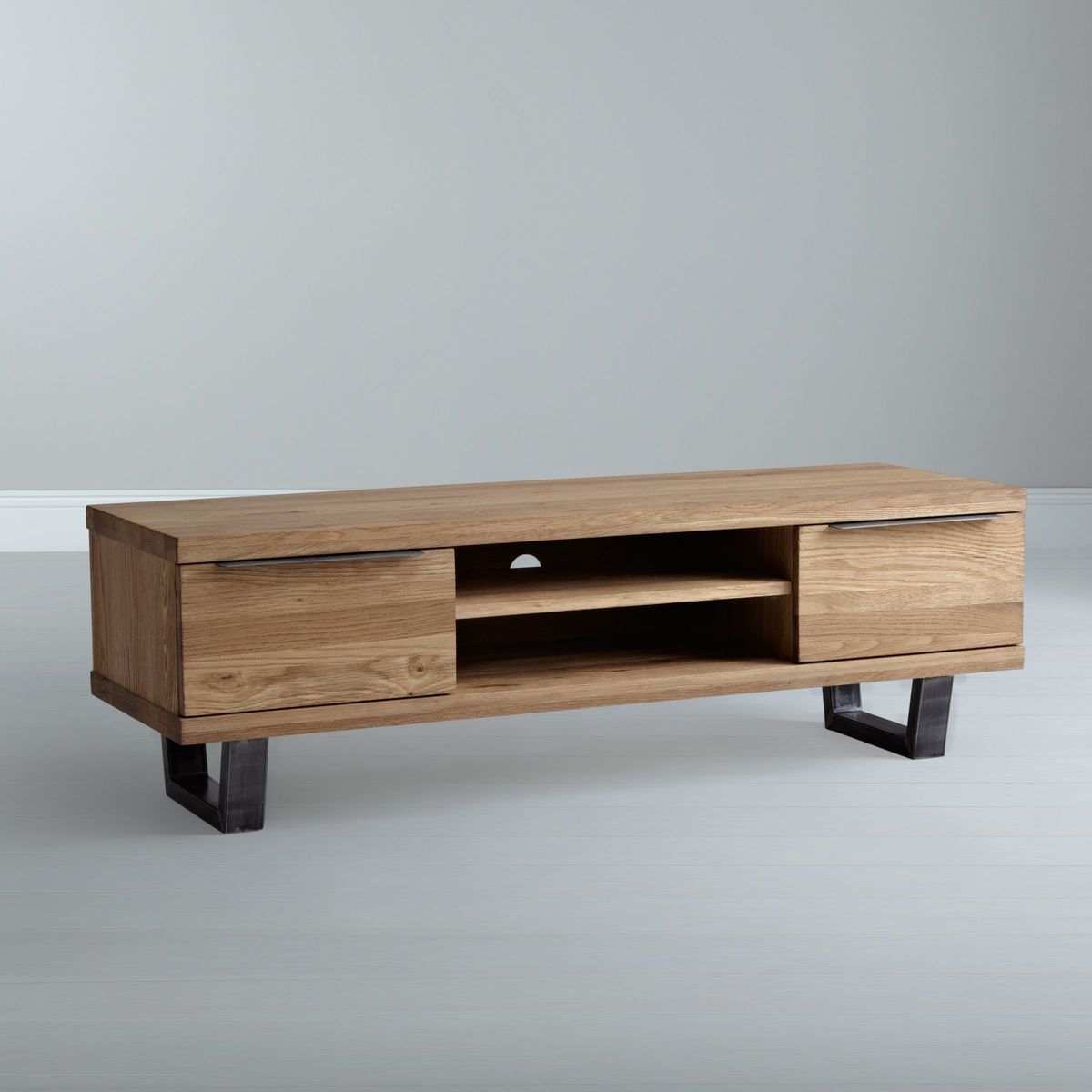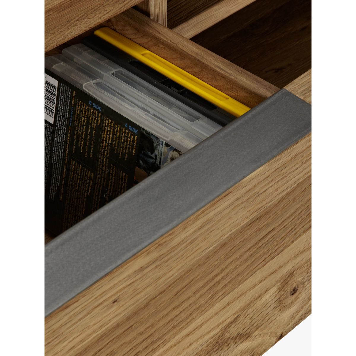 Made predominantly from solid American white oak, our Calia range of furniture has a natural, rustic look thanks to its wire-brushed, distressed finish. Each piece is made from individual wood slats that are carefully selected and sorted by skilled craftsman. They ensure that the natural pattern in the wood grain, even with its unique irregularities, uphold our design and quality standards, to offer an authentic and tactile look. This functional TV stand is designed with shelving and cupboard compartments that provide a convenient storage space for your media consoles. Suitable for TVs up to 60, its chunky profile is supported by a robust, welded iron frame that's finished with a durable lacquer. A cable hole at the rear ensures cables can be neatly stored. Offering both a retro and industrial-inspired aesthetic, it's a timeless option for your home. Worth knowing Oak is a natural, living material, and part of its charm is that it develops over time. This means that surface splits may start to appear with the natural movement of the wood. Knots will vary in size and location and a subtle colour variation can also be expected. These distinctive qualities give the range a unique feel, as no two pieces will be exactly the same. To keep your furniture looking its best, we recommend periodic oiling and oiling before first use. This is applicable to the Oak version only, as the Dark version has a lacquered finish. More information can be found in the assembly instructions supplied. Want to see it first? You may want to see and get a feel for the furniture in one of our shops before ordering. We'll be able to tell you where the range you'd like to view is on display.