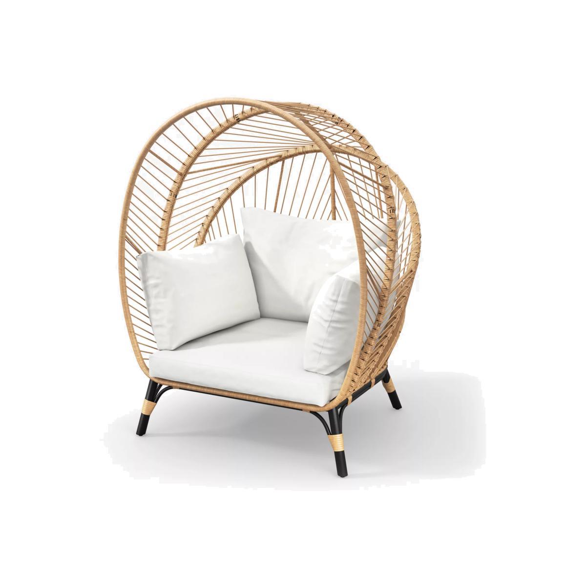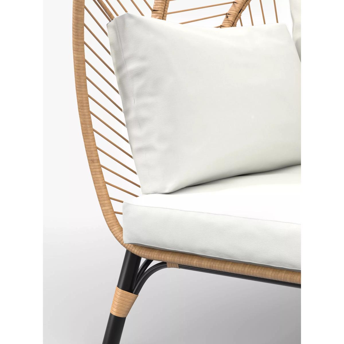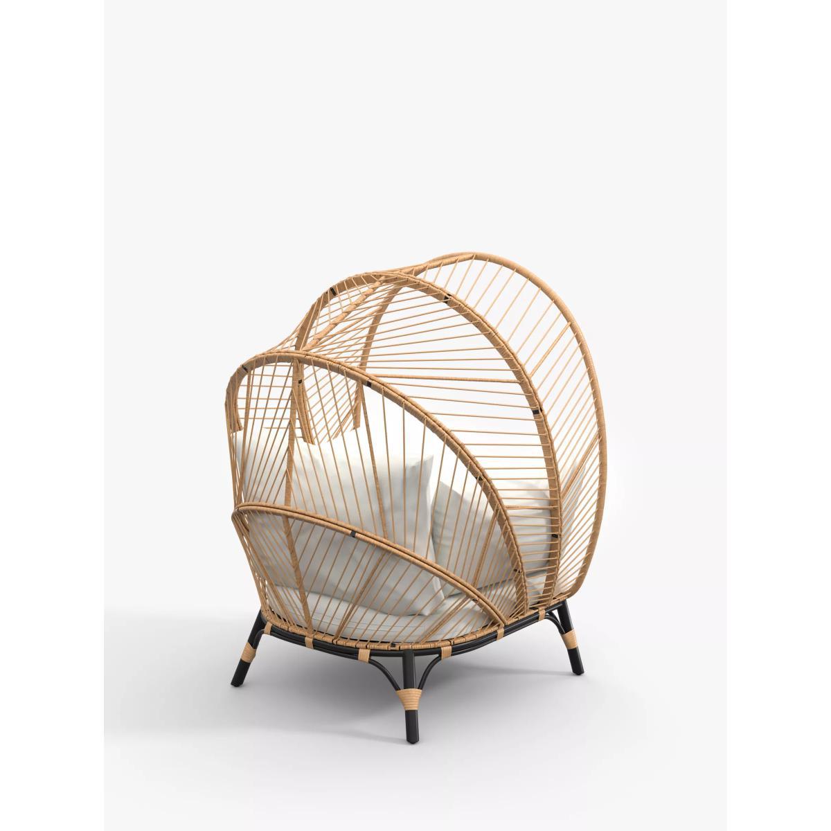 A statement pod styled in traditional rattan with a hood-like canopy for creating a relaxing garden hideaway or conservatory nook. The synthetic weave on a powder-coated aluminium frame makes it both durable and weather-resistant so you can even leave it outside throughout the year. Make sure you bring in the cushions, which are resistant to light rain showers only. The sturdy frame and legs are able to withstand a weight of 17 stone (110kg). The robust design allows the rattan to form its distinctive shape, with the weave ensuring comfortable support. The cushions can be unzipped and the covers are washable, with care. Key features: Hand-woven synthetic rattan design Lightweight and durable aluminium frame Shower-resistant and washable cushioning Comes with a seat cushion, backrest cushion and two side cushions Want to see it first? You may want to see and get a feel for the product in one of our shops before ordering. We'll be able to tell you where the range you'd like to view is on display.