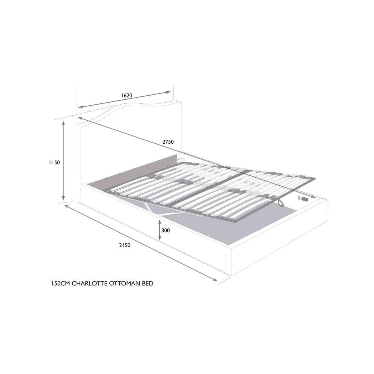 With a gently curved headboard and practical storage base, our Charlotte ottoman bed frame is ideal for smaller bedrooms. A handle and hydraulic arms facilitate an easy manual lift-up and there's plenty of storage space for spare linens or extra clothes. There are also supportive sprung slats in the base. Smart Slats This bed frame is designed with wider slats at the shoulders, lumbar and feet, that provide maximum support for your mattress so that you experience perfect spinal alignment while you sleep. Standard slat caps are black so we have added grey slat caps to ensure that you know where to place the wider slats. Our Band A fabric, Saga is woven with man-made fibres, making it exceptionally durable and versatile. Our Our Band A fabric, Topaz is woven to offer a linen-effect feel, and is available in a versatile palette of colours. Our Band B fabric, Erin is woven with man-made fibres to create a beautifully soft yarn. This tactile, velvet-style chenille fabric exhibits a two-tone look in different lights. Our Band B fabric, Opulence offers a luxurious, soft-touch. This velvet-feel fabric is available in a rich colour palette. Our Band B fabric, Mole is a woven wool-blend that's soft and cosy. Piling and bobbling may occur naturally over time. Our Band B fabric, Relaxed Linen is durable, resilient and versatile, woven from man-made and natural fibres Our Band C fabric, Marylamb is woven with a mix of man-made and natural fibres for a tactile and soft-touch feel. Want to see it first? You may want to see and get a feel for the furniture in one of our shops before ordering. We'll be able to tell you where the range you'd like to view is on display.
