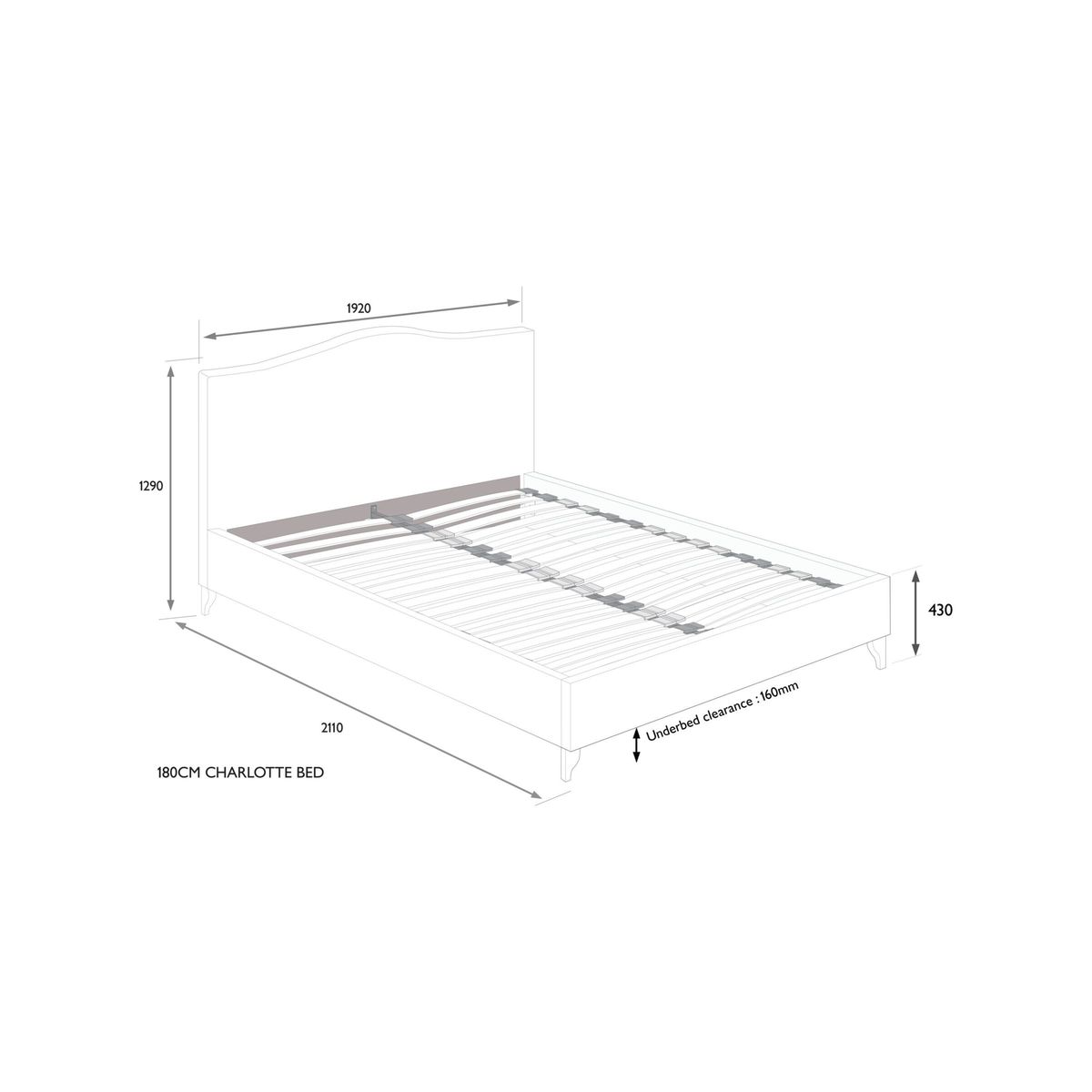 With a gently curved headboard and turned wooden legs, our Charlotte bed frame suits traditional settings. There are also supportive sprung slats in the base. Built with Smart Slats This bed frame is designed with wider slats at the shoulders, lumbar and feet. They provide maximum support for you and your mattress so that you experience perfect spinal alignment while you sleep. The standard slat caps are black so we have added grey slat caps to ensure that you know where to place the wider slats. Choose from one of our fabrics: Our Band A fabric, Topaz is woven to create a linen-effect feel Our Band A fabric, Saga is woven with man-made fibres, making it exceptionally durable and versatile Our Band B fabric, Erin has a velvet-style, chenille feel. It's woven with man-made fibres to create a beautifully soft yarn and can appear two-tone in different lights Our Band B fabric, Opulence is a soft and luxurious velvet-like fabric Our Band B fabric, Mole is a soft and cosy woven wool-blend. Piling and bobbling may occur naturally over time Our Band B fabric, Relaxed Linen is durable, resilient and versatile, woven from man-made and natural fibres Our Band C fabric, Marylamb is woven from both man-made and natural fibres, creating a tactile and soft-touch feel Our Band C fabric, Aquaclean Harriet is made from a short, dense pile of velvet that has a soft, brushed finish. An Aquaclean treatment has been applied to this resilient fabric which means you can banish the majority of household stains with water. The treatment covers every fibre with an invisible coating so it doesn't need to be retreated or re-coated. It will naturally develop lines, scuffs and shading over time. Want to see it first? You may want to see and get a feel for the furniture before ordering. Pop into one of our shops to see the full range of colours and fabrics on offer. We'll be able to tell you where the range you'd like to view is on display.