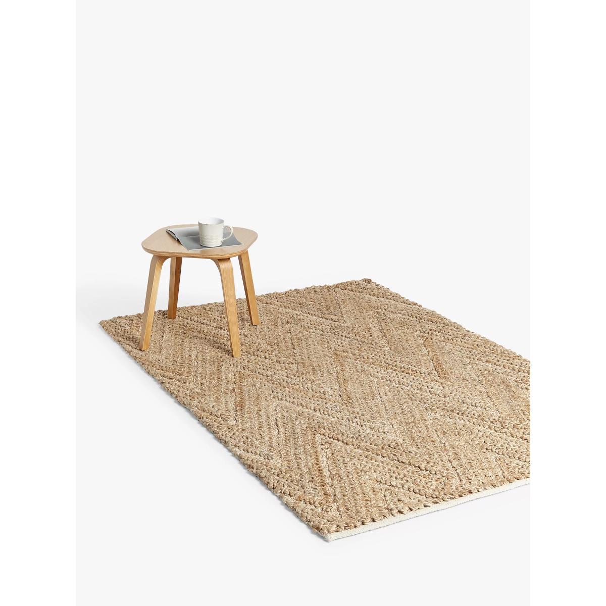 An alternative to just adding more colour to a room, this unusual jute rug has a textured style in a chevron shape. Very thick, this rug is tightly woven to reduce shedding although some may occur at first. About your new rug We recommend John Lewis & Partners Rug Hold Underlay. It prevents your rug from moving underfoot and protects against colour transfer to the floor Natural fibres may shed. This will reduce over time, and shouldn't affect your rug's lifespan or performance When vacuuming your rug, use suction only. Rotating brushes may damage the fibres Blot any spills with a clean, dry cloth. Do not rub or use harsh detergents. Jute is a natural fibre meaning colour variance is expected both in its natural form and when dyed. This means each rug could have a slightly different tone, making your new rug unique. Textile backed