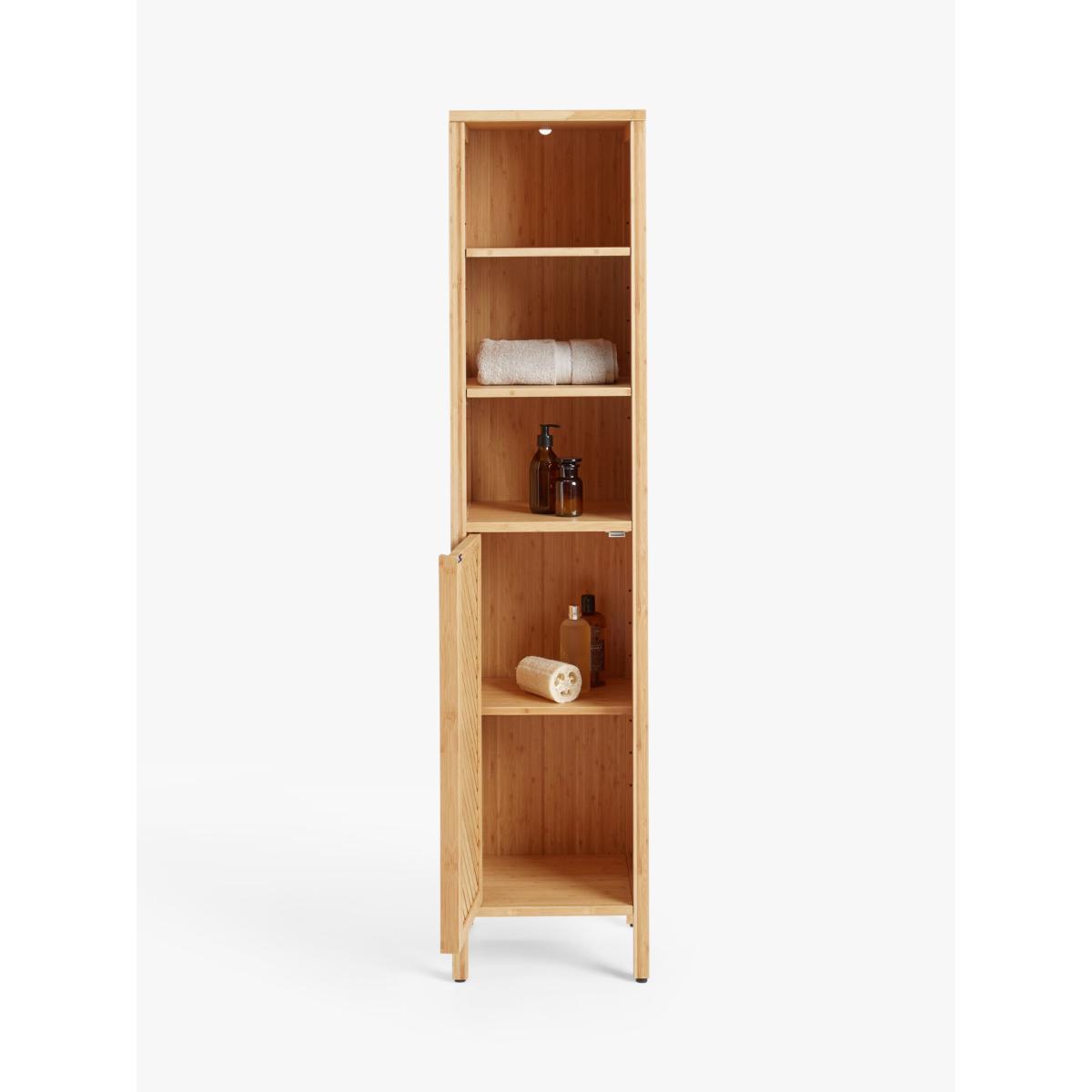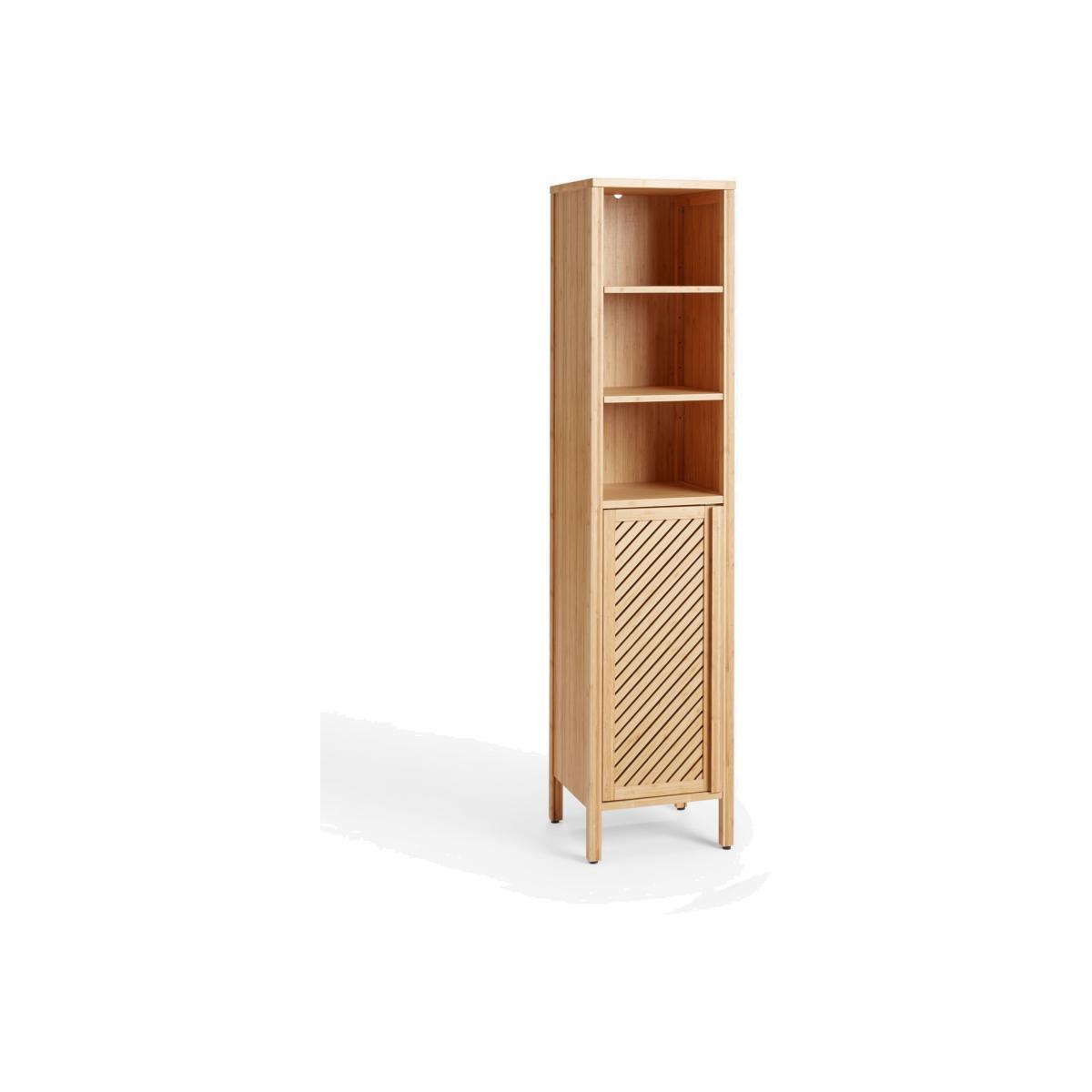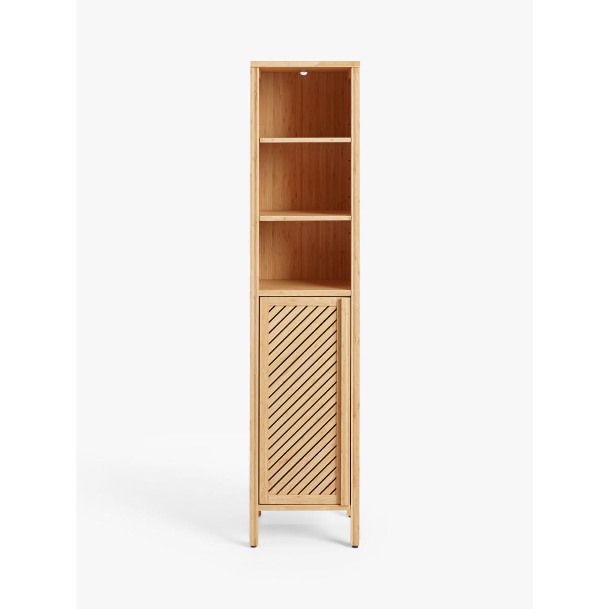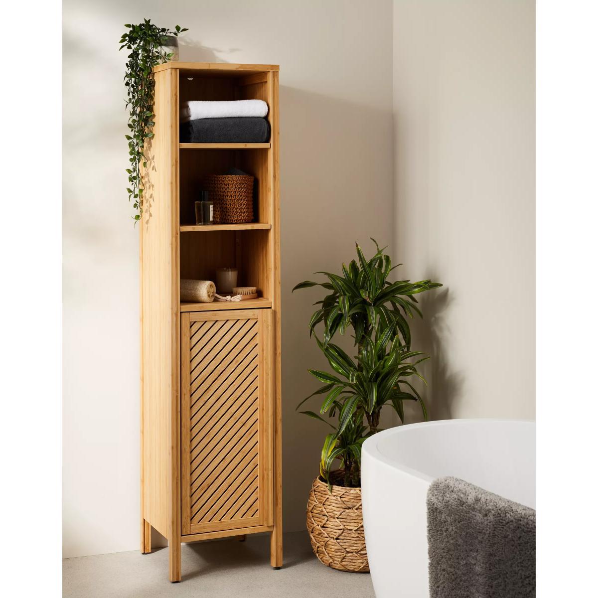 We've designed this freestanding tallboy storage cabinet with a sustainable edge. It's made from a combination of solid bamboo, known for its lightweight and fast-growing characteristics, and MDF in a natural or stained finish. A practical option for your bathroom essentials, there are shelves inside the cupboard section and additional shelves above. Slatted detailing on the door lends a modern accent to the design. More about bamboo Bamboo is considered to be one of the most renewable and readily available raw materials in the world. Incredibly versatile and durable, it's the world's fastest growing plant and can be re-harvested every 3-5 years, in comparison to certain hardwoods that can only be harvested every 50 years. Want to see it first? You may want to see and get a feel for the furniture in one of our shops before ordering. We'll be able to tell you where the range you'd like to view is on display.