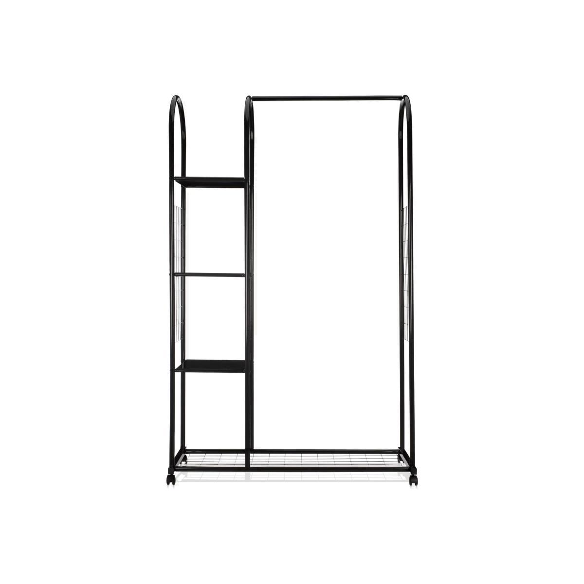 Finished in black coated metal, this garment rail has a built in bottom shelf and 3 separate shelf compartments. Only available to order online.