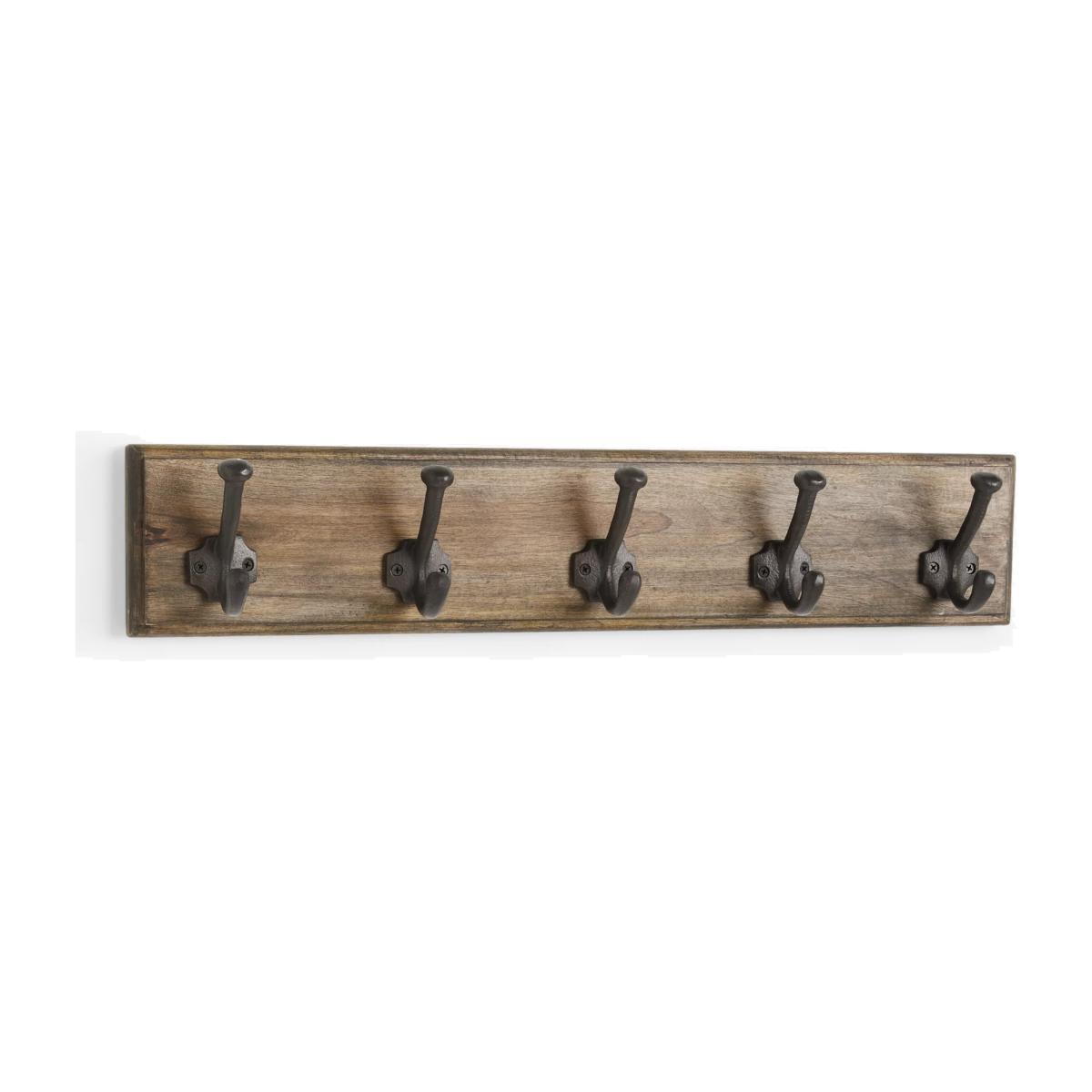 An attractive, hallway hanging rack with a rustic, hand-finished wood backing board and 5 cast aluminium hooks.