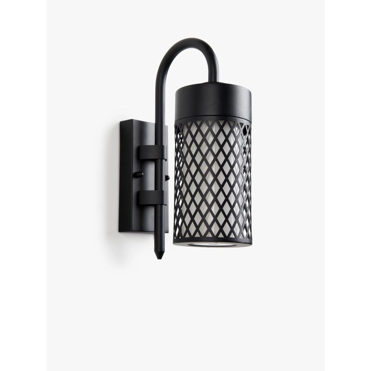 With its caged lantern-style design, this modern wall light is a great option for porches or pathways. IP44-rated and resistant to splashing water, the sealed glass shade offers a soft glow when lit. One LED bulb is required.