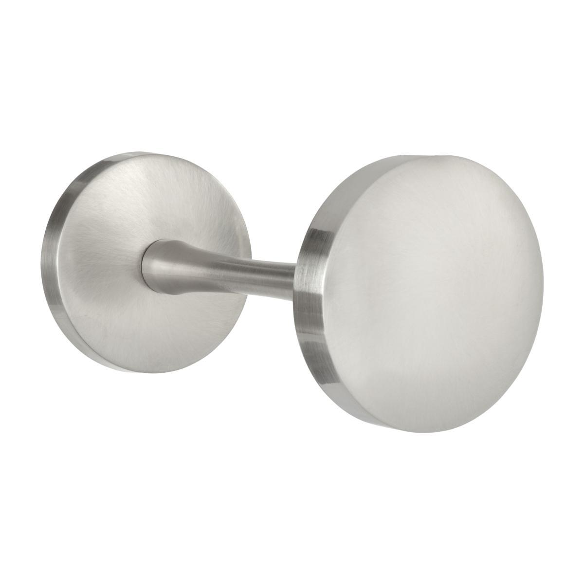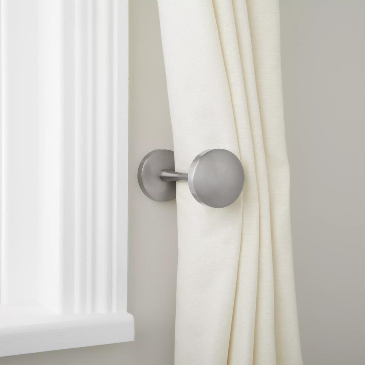 Decorative, stud end curtain holdback in brushed stainless steel. Sold individually.