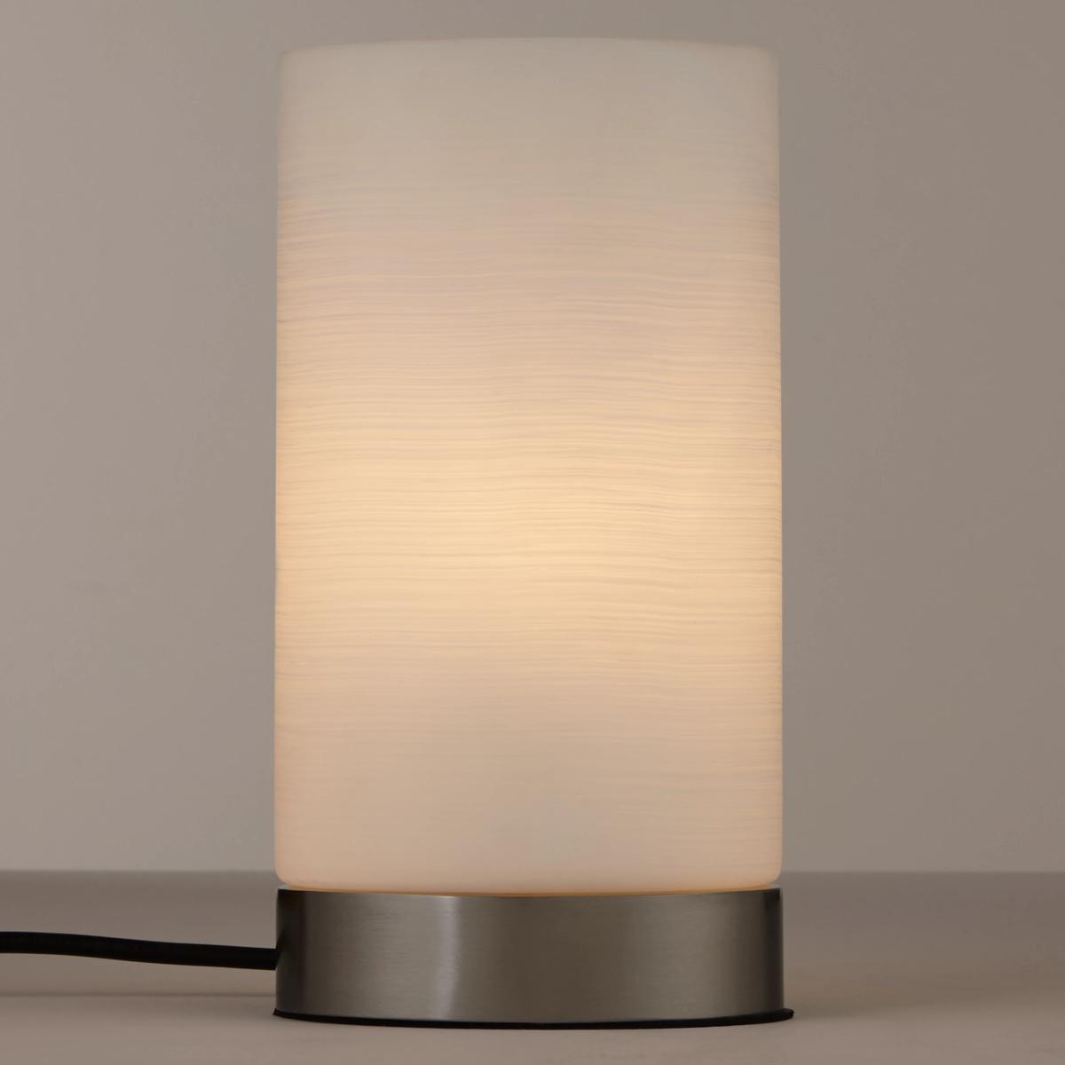 The beautiful oval shaped white washed patterned glass will add a chic edge to your home, complete with a 3 stage touch dimmer so you can easily adjust the brightness and turn the lamp on/off. Finished with a satin nickel base.