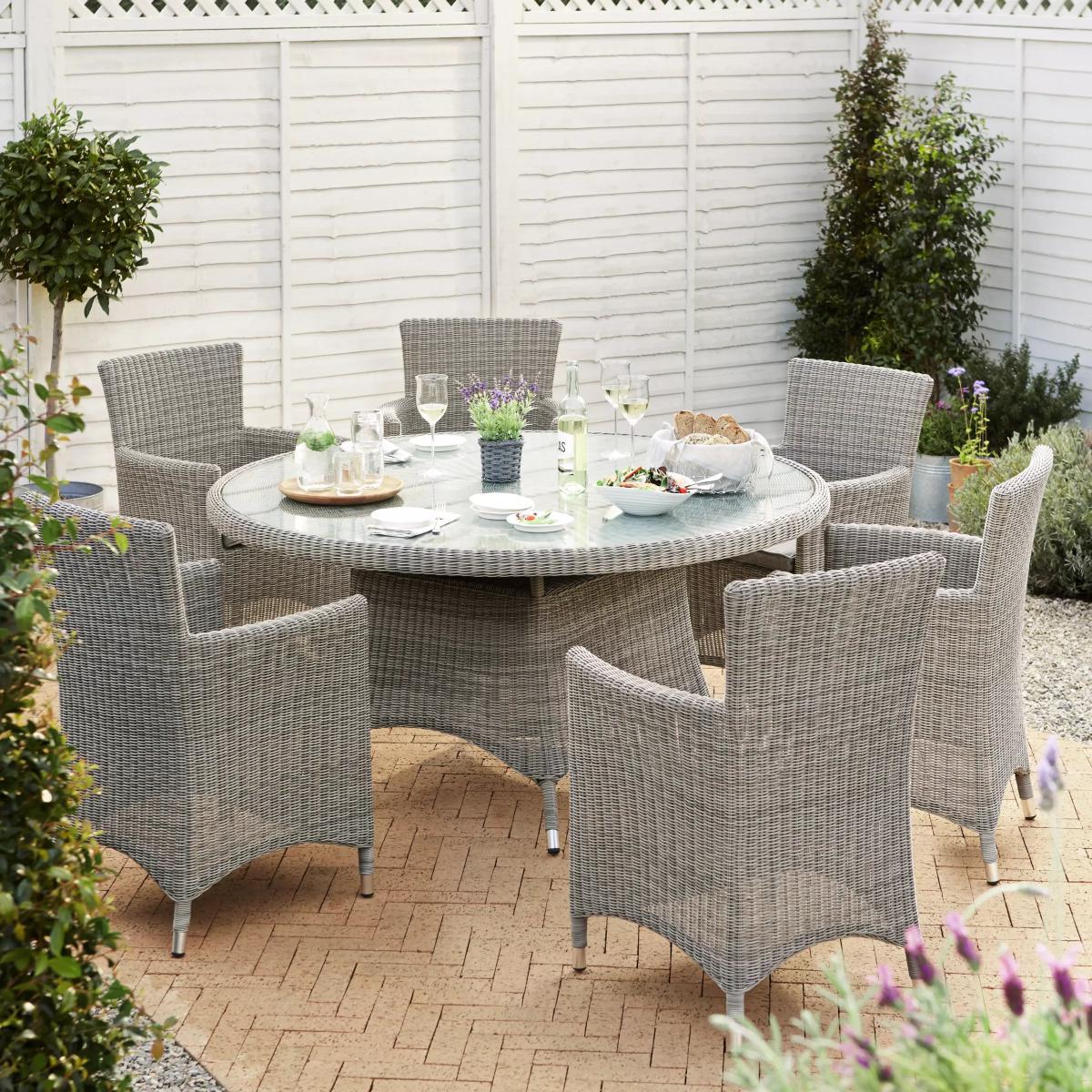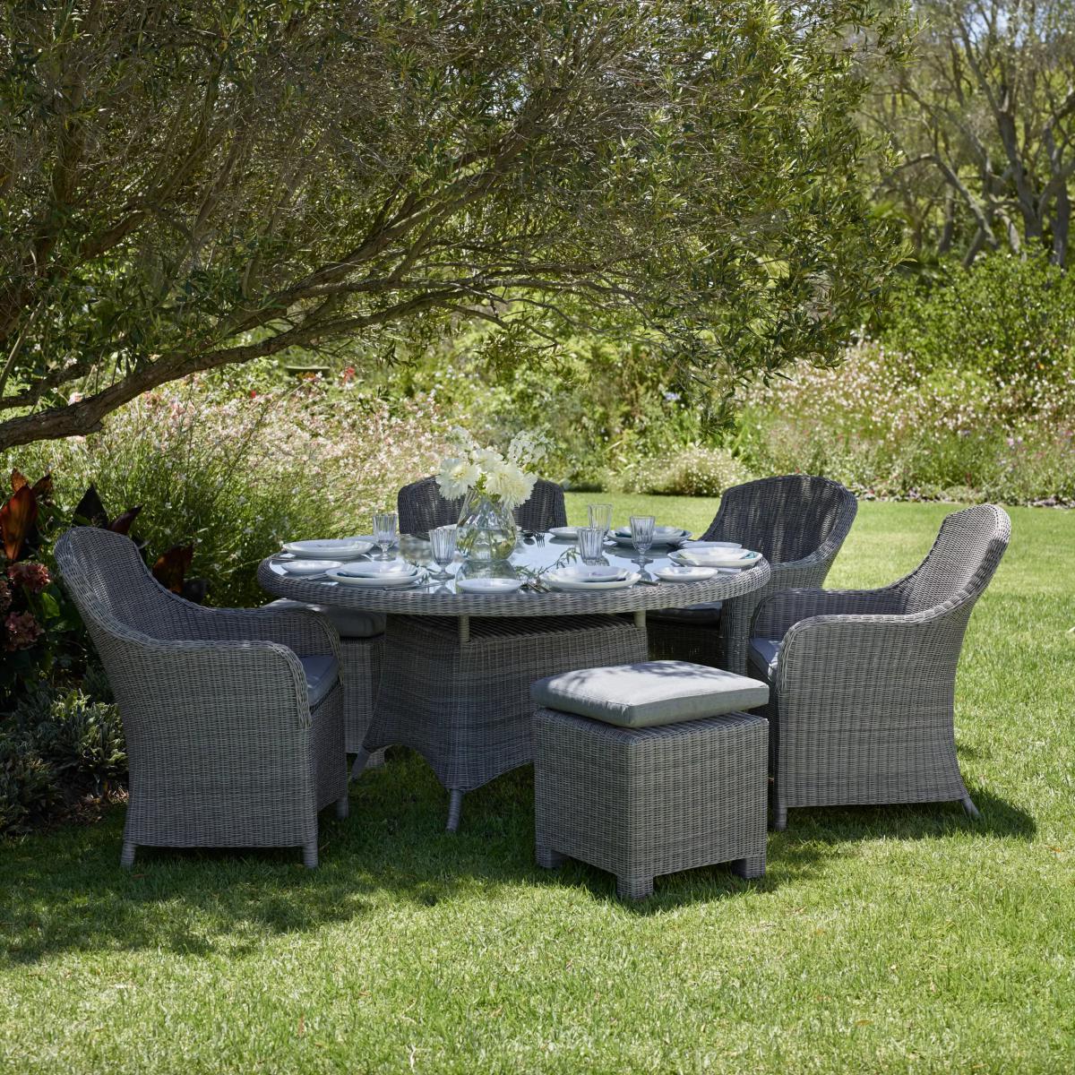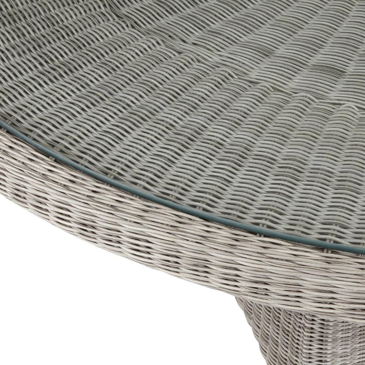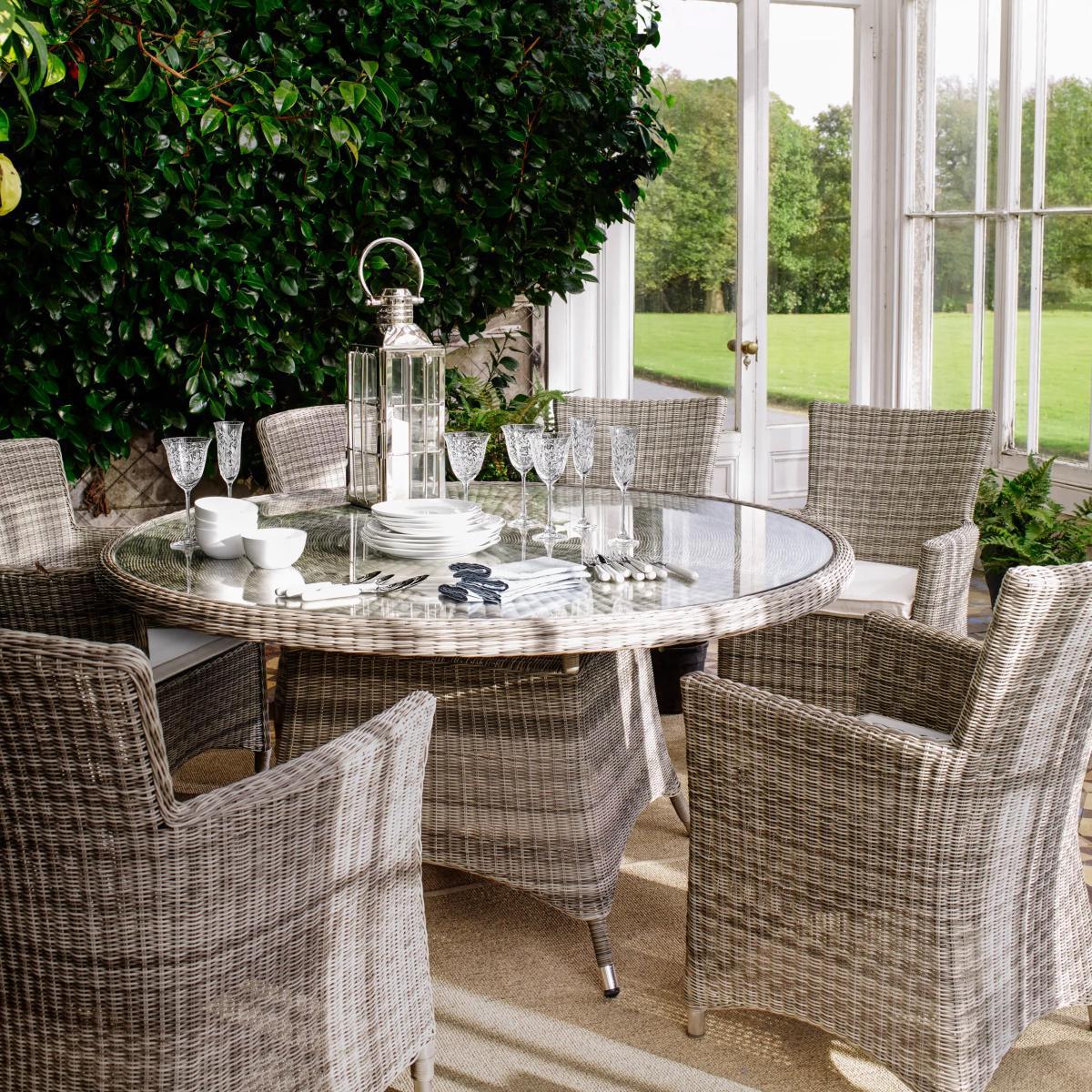 A round garden dining table from our Dante range, made with a sophisticated curved design and a tempered glass top for strength. There's plenty of room for up to six people around the table. Our Dante range of handwoven furniture is weather-resistant and suitable for gardens and conservatories. In a traditional style, the synthetic wicker has a natural finish and is woven onto metal frames for durability and easy maintenance. Dante round wicker is a high-specification resin requiring an intricate hand-woven technique, taking days to produce to the finest quality. Key features: 6-seater garden dining table Tempered glass table top Classic synthetic wicker design 3mm round weave Aluminium frame Easy to clean and maintain Want to see it first? You may want to see and get a feel for the product in one of our shops before ordering. We'll be able to tell you where the range you'd like to view is on display. Choose the perfect outdoor furniture We have a vast selection of furniture for you to choose from which will suit the home or garden. The majority of our furniture ranges have been hand woven using a synthetic wicker. The thinner the weave, the longer it takes for the skilled workers to complete. All weave types are durable so they’ll last throughout the seasons All woven outdoor furniture is UV protected so it will not fade in direct sunlight All woven outdoor furniture is easy to maintain, simply wipe clean using warm water Flat A weave of various widths which offers incredible value for money Half round More detailed with a 3D effect, the half round is a round weave in half which displays a wicker appearance on the top and hollowed underside Double half round A double strand of half round, this is a wider width of weave which achieves an expensive appearance Round weave A very tight weave which is available in various widths, from 2mm to 5mm Rope A selection of our ranges have been made using rope. The yarn is made up of 10,000 (approx) woven strands with a double core for extreme strength, does not attract mould even if wet for a long time and is UV resistant.