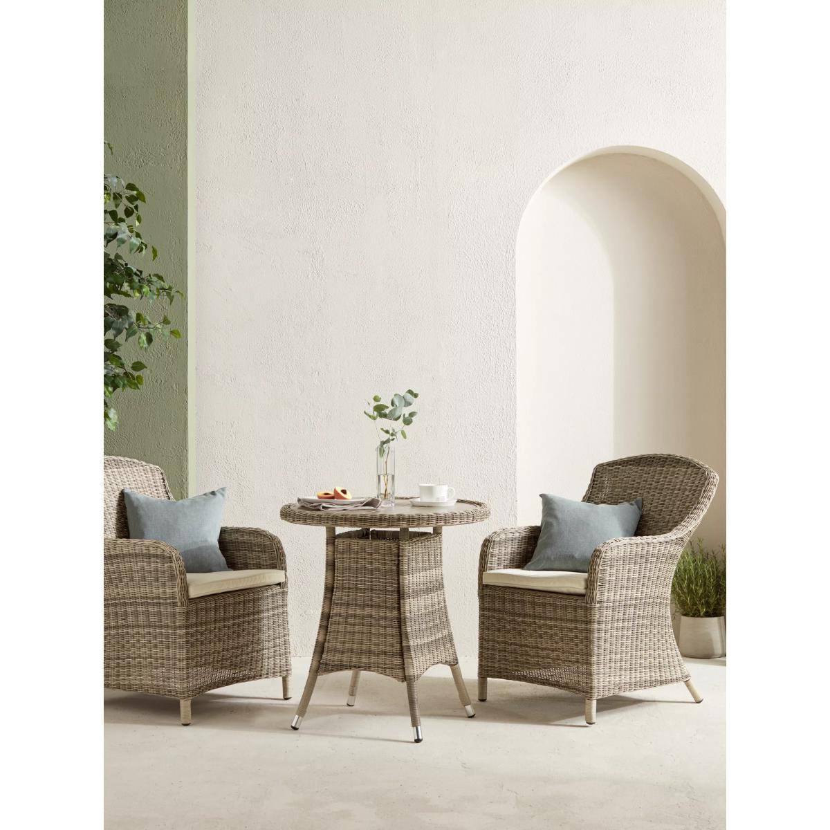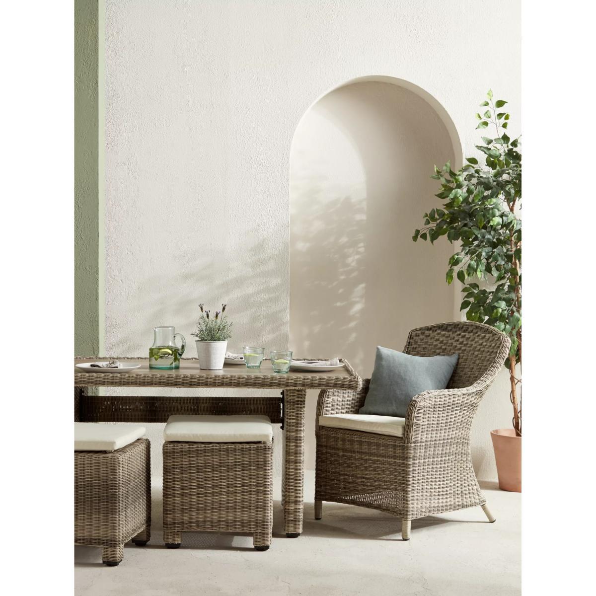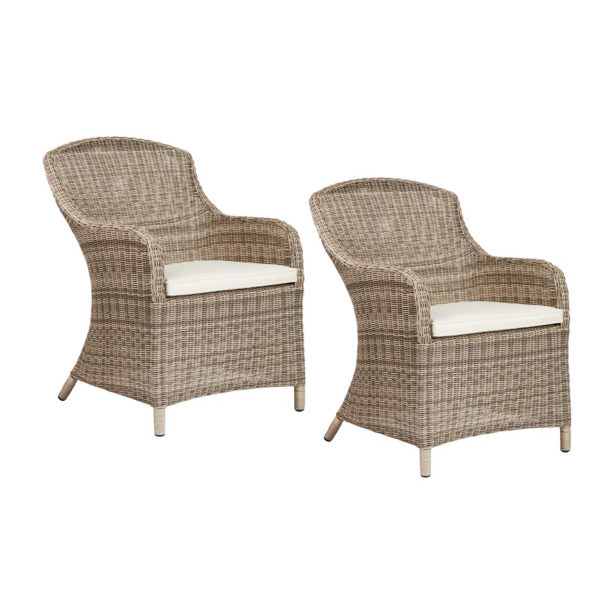 A pair of Deluxe Garden Chairs from our Dante range, made with a sophisticated curved design, for comfortable dining or lounging. Team with a dining table from our Dante range. Our Dante range of handwoven furniture is weather-resistant and suitable for gardens and conservatories. In a traditional style, the synthetic wicker has a natural finish and is woven onto metal frames for durability and easy maintenance. Dante round wicker is a high-specification resin requiring an intricate hand-woven technique, taking days to produce to the finest quality. Seating in the Dante range has robust frames and each chair is tested to withstand 20 stone (127kg), exceeding the industry standard. Key features: Pair of Deluxe dining and lounging armchairs Classic synthetic wicker design 3mm round weave Aluminium frames Robust frames tested to withstand 20 stone, exceeding the industry standard Shower-resistant seat pads included Easy to clean and maintain Want to see it first? You may want to see and get a feel for the product in one of our shops before ordering. We'll be able to tell you where the range you'd like to view is on display. Choose the perfect outdoor furniture We have a vast selection of furniture for you to choose from which will suit the home or garden. The majority of our furniture ranges have been hand woven using a synthetic wicker. The thinner the weave, the longer it takes for the skilled workers to complete. All weave types are durable so they’ll last throughout the seasons All woven outdoor furniture is UV protected so it will not fade in direct sunlight All woven outdoor furniture is easy to maintain, simply wipe clean using warm water Flat A weave of various widths which offers incredible value for money Half round More detailed with a 3D effect, the half round is a round weave in half which displays a wicker appearance on the top and hollowed underside Double half round A double strand of half round, this is a wider width of weave which achieves an expensive appearance Round weave A very tight weave which is available in various widths, from 2mm to 5mm Rope A selection of our ranges have been made using rope. The yarn is made up of 10,000 (approx) woven strands with a double core for extreme strength, does not attract mould even if wet for a long time and is UV resistant.