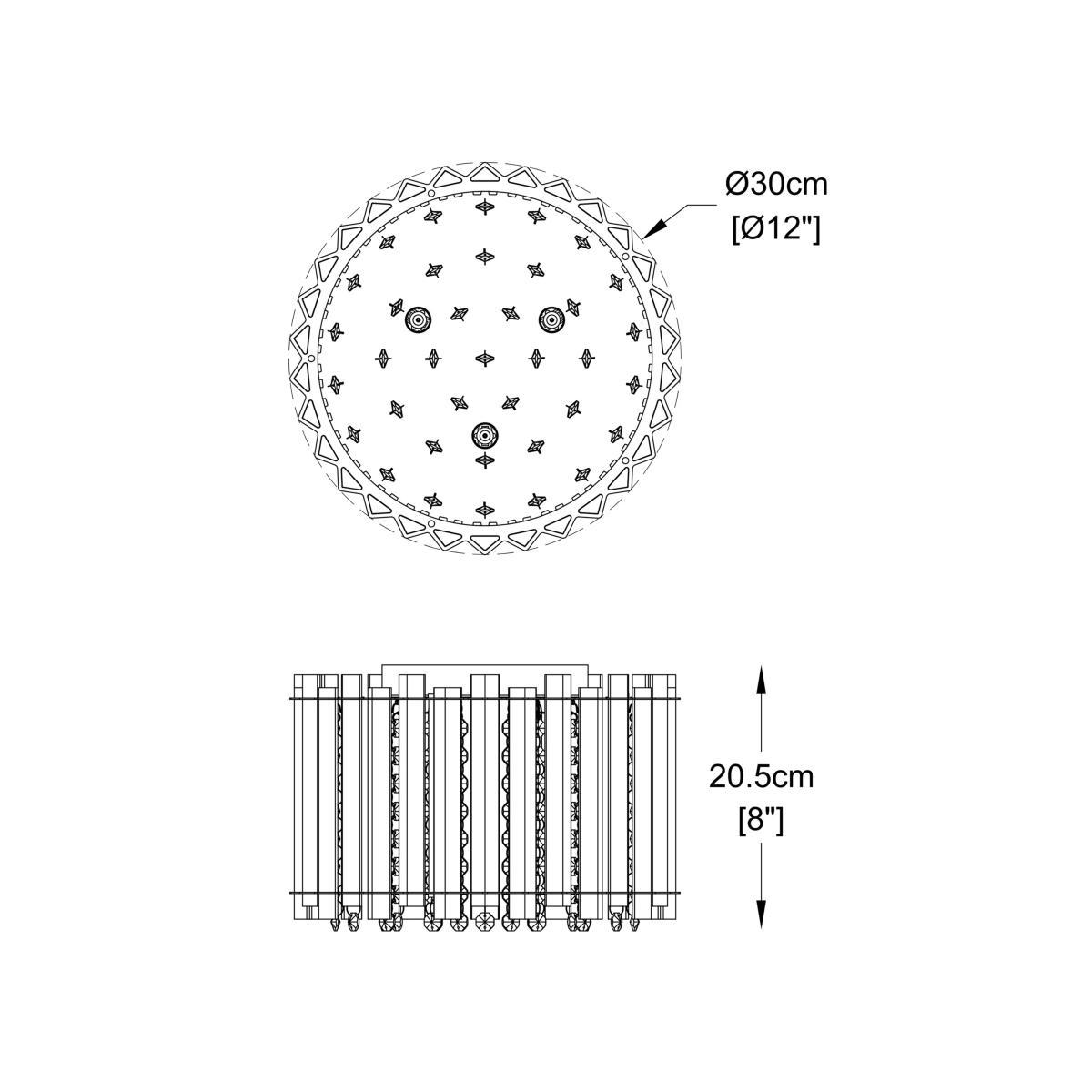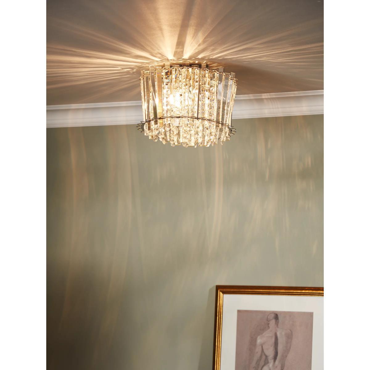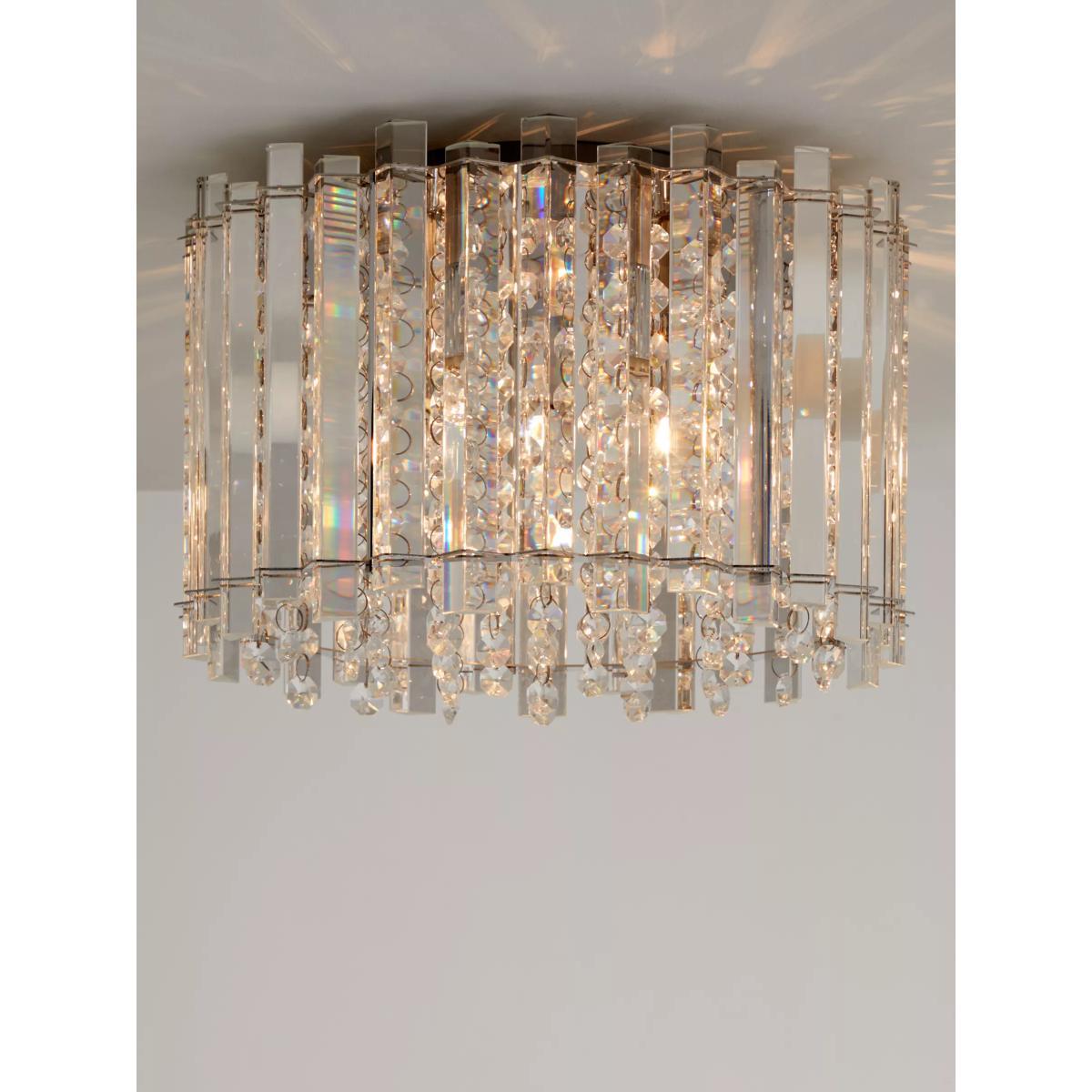 Lending a dazzling accent to any room, this faceted, semi-flush ceiling light is designed with a combination of vertically-placed mirrored strips and crystals. Light shines from the centre and bounces off the crystals to emit a shimmering wash of light. Its eye-catching design sits close to the ceiling and will complement sophisticated interior styles.