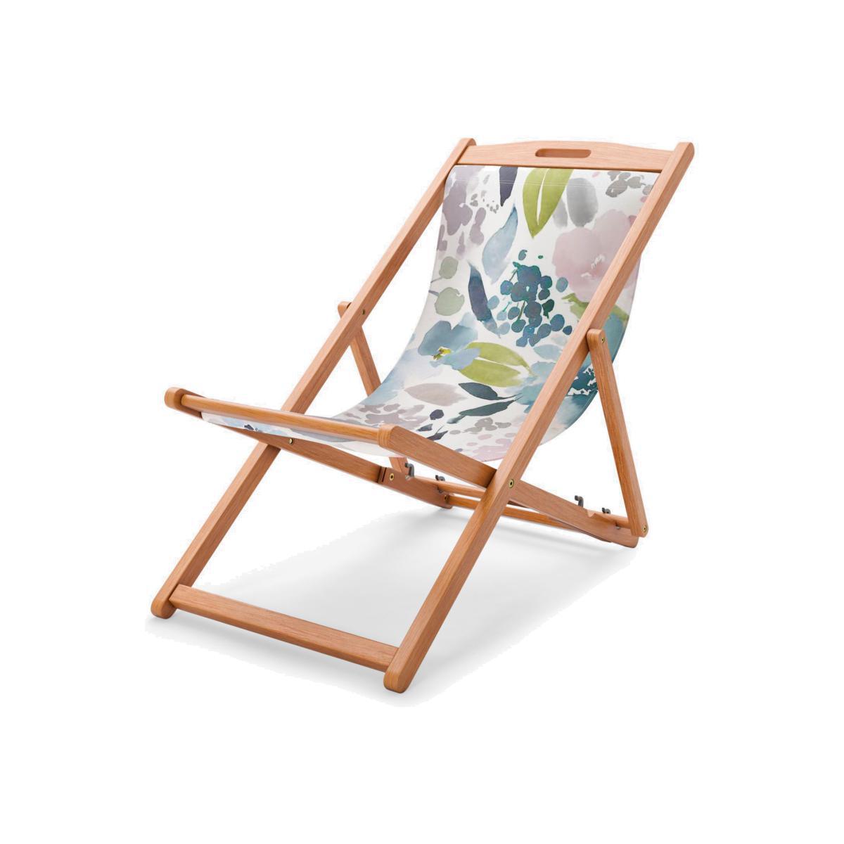 A classic, foldable deckchair with a comfortable sling seat. Bright and colourful, the deckchair sling has a watercolour-style floral pattern. It's made of a heavyweight fabric that's resistant to colour fading and is machine washable for easy cleaning. The lightweight deckchair is easy to carry and made of FSC-certified eucalyptus wood, sourced from sustainably managed forests. Want to see it first? You may want to see and get a feel for the furniture in one of our shops before ordering. We'll be able to tell you where the range you'd like to view is on display. Choose the perfect outdoor furniture We have a selection of wooden furniture for you to choose from which will suit the home or garden. Below are a few options to consider when choosing your perfect outdoor furniture. Teak A premium and popular wood with an attractive appearance which ages beautifully. Strong, durable and resistant to rot and decay, this furniture requires little maintenanceEucalyptus Distinctive scent and appearance which darkens as it ages. Provides similar natural benefits to teak including moisture resistance, hardness and durability. It's plentiful in supply which makes the furniture an inexpensive choice. Acacia. Naturally durable, this wood is incredibly hard and is unlikely to suffer damage during everyday use. It provides similar natural benefits to teak, yet unlike many other hardwoods, acacia is also relatively fast growing which minimises the environmental impact.
