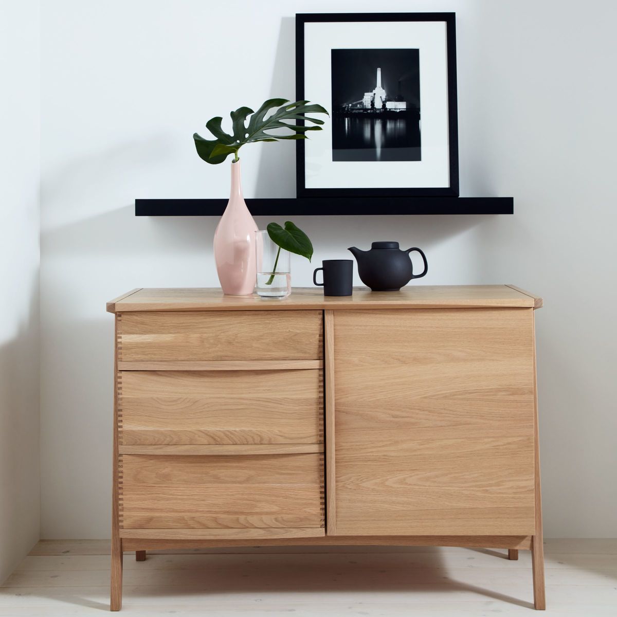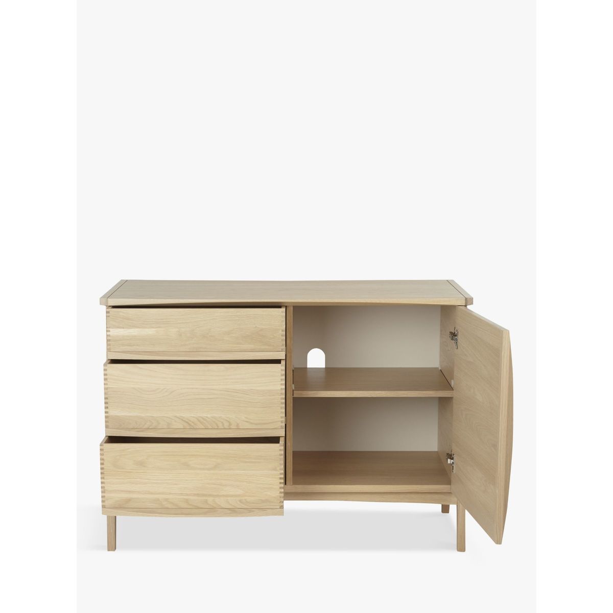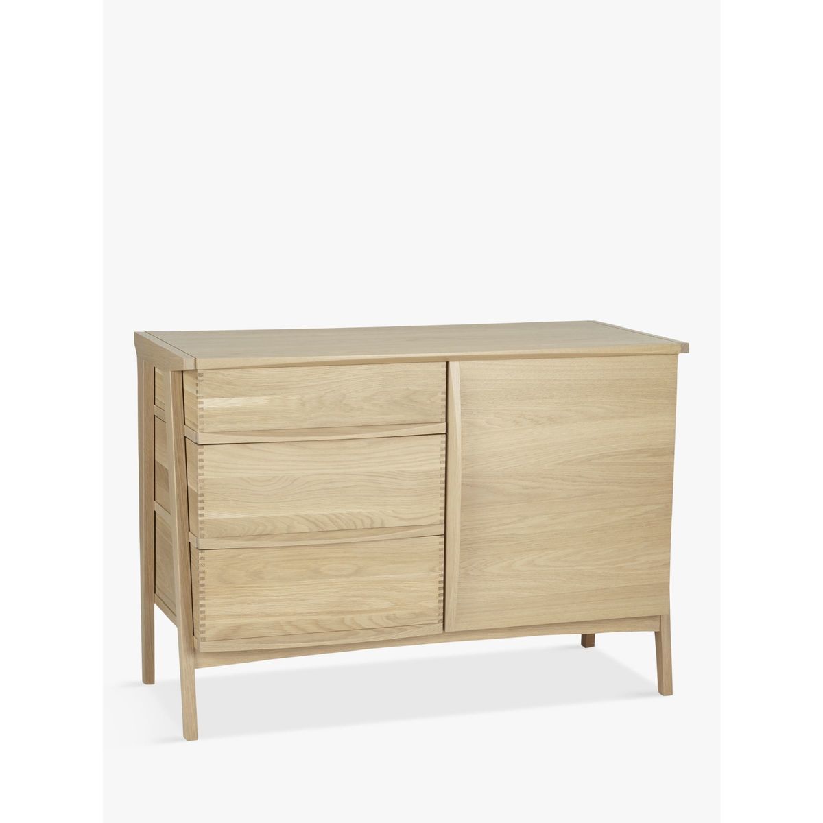 This beautifully crafted sideboard is made from solid oak with oak veneers to give a quality, robust finish. With three drawers and two shelves you can easily store away crockery, cutlery or any other dining essentials. The result of close to twenty years’ development, Duhrer is the innovation of Brighton-based furniture designer and maker, John Weaver. His idea to reveal the furniture’s functional elements as an aesthetic device, has inspired a collection of pieces whose exposed drawers present the intrinsically beautiful detail of features often concealed. John’s initial concept has effortlessly transferred to a wider collection of living and dining furniture. The end frame geometry of which, interestingly resembles the monogram of 16th century artist, Albrecht Durer - giving the range its name. Each piece, realised in solid and visually stunning American white oak, is intended to be treasured and handed down from generation to generation. Manufacture marries the use of the most modern and accurate machinery, with traditional hand-making skills of expert craftsmen, ensuring Duhrer’s quality and durability will stand the test of time.