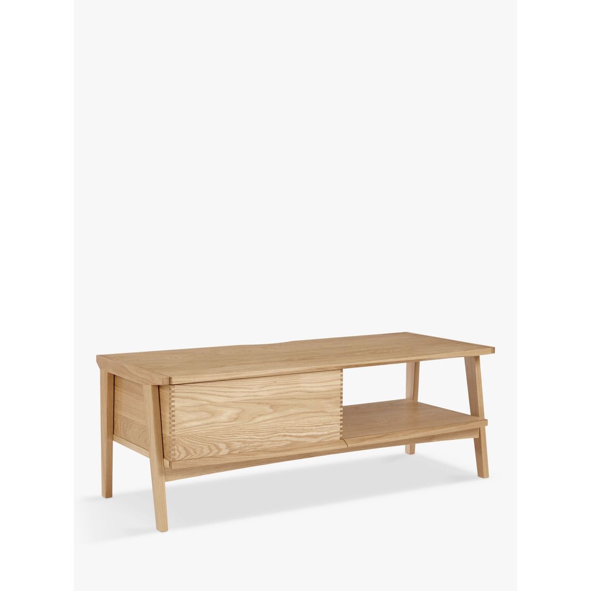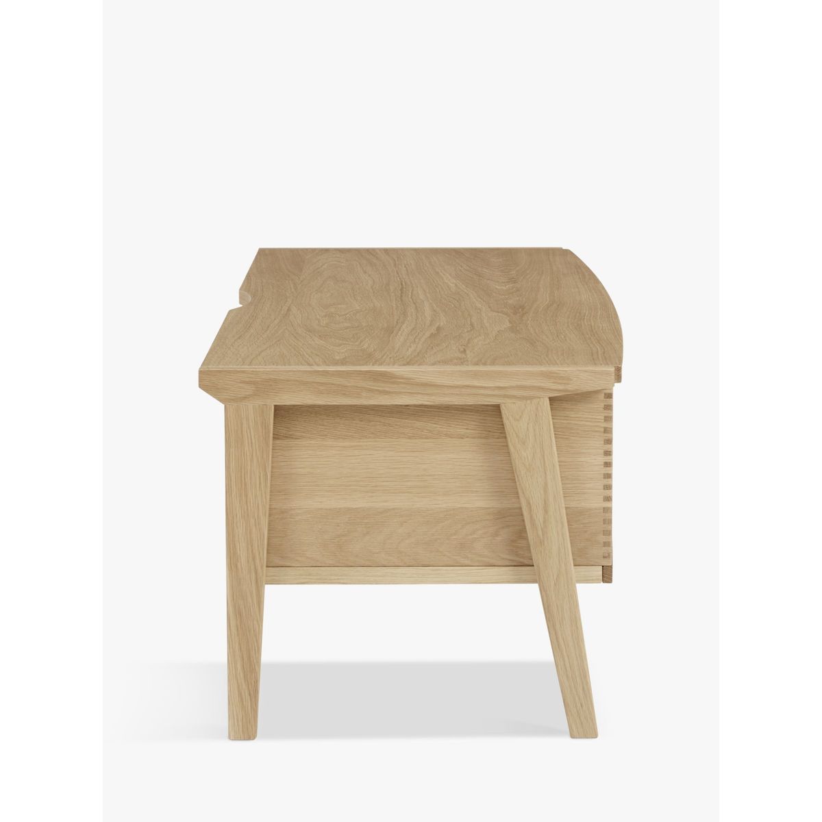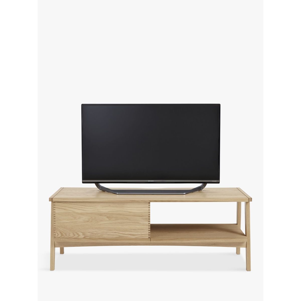 This beautifully crafted TV stand is made from solid oak with oak veneers to give a quality, robust finish. With a drawer and shelf you can easily store away your media essentials and entertainment devices. The result of close to twenty years' development, Duhrer is the innovation of Brighton-based furniture designer and maker, John Weaver. His idea to reveal the furniture's functional elements as an aesthetic device, has inspired a collection of pieces whose exposed drawers present the intrinsically beautiful detail of features often concealed. John's initial concept has effortlessly transferred to a wider collection of living and dining furniture. The end frame geometry of which, interestingly resembles the monogram of 16th century artist, Albrecht Durer - giving the range its name. Each piece, realised in solid and visually stunning American white oak, is intended to be treasured and handed down from generation to generation. Manufacture marries the use of the most modern and accurate machinery, with traditional hand-making skills of expert craftsmen, ensuring Duhrer's quality and durability will stand the test of time. Please note: not all our ranges are on display in our shops.