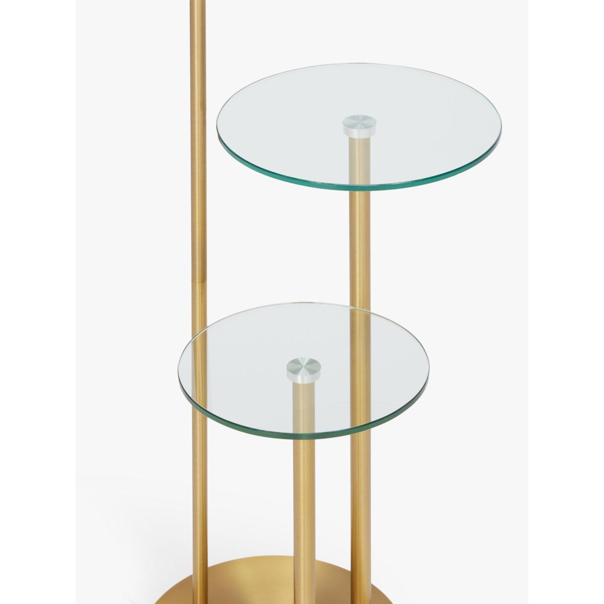 A brilliant option if you're short on space, this floor lamp provides two tiers of table storage as well as decorative lighting within its compact frame. The shelves are made from sturdy glass and the lampshade, which is suspended in an arched style, is made from textured fabric. The result is a modern, upscale look which will beautifully illuminate your decorative accessories and bring a warm glow to your room. Style it next to your favourite reading chair. Complete with an easy on/off foot step switch.
