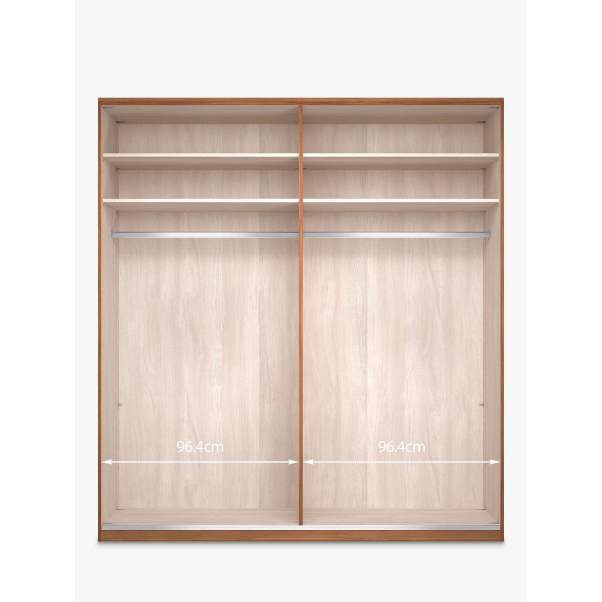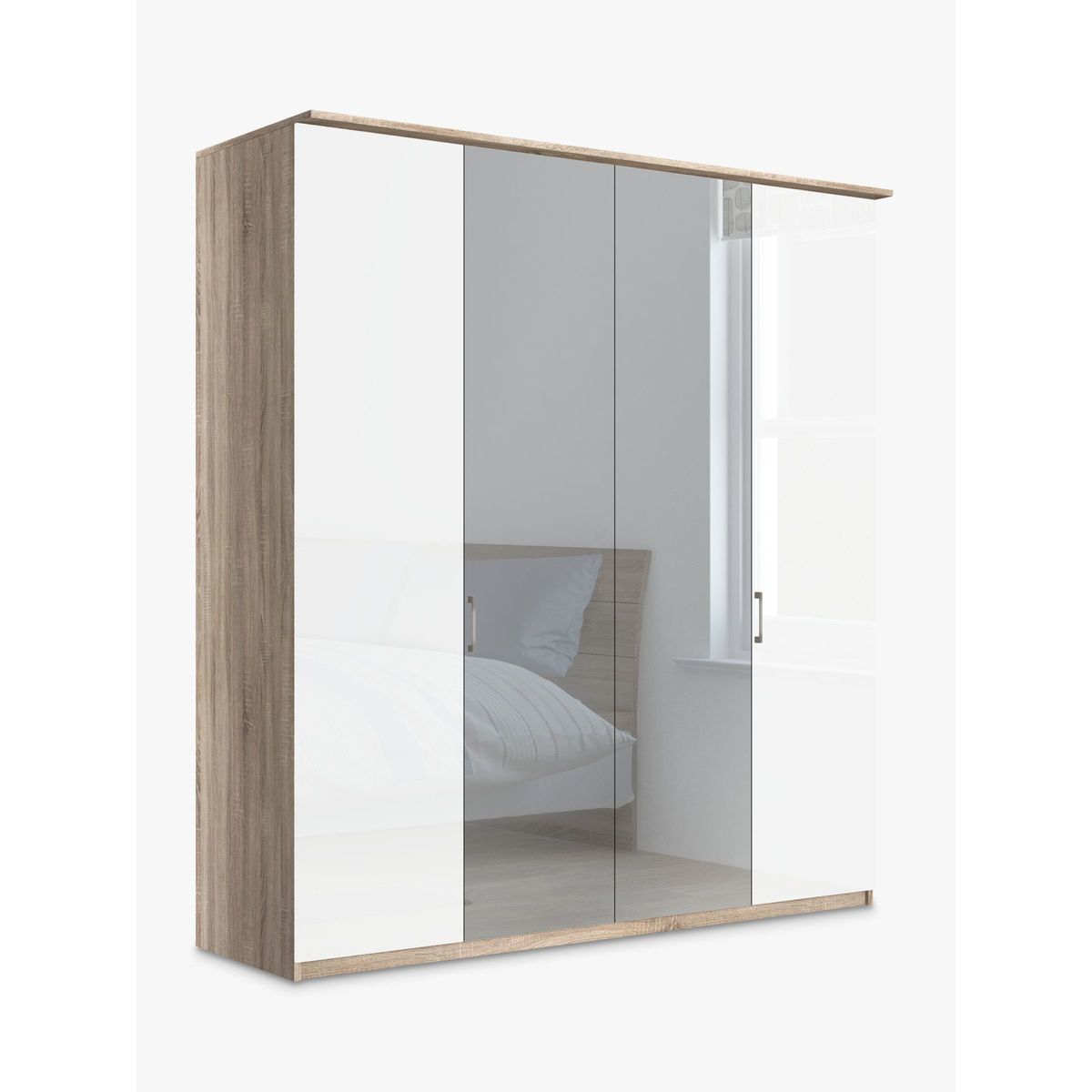 The clean modern lines of this four door Elstra wardrobe are offset with a choice of Rustic Oak, Alpine White or Nocce (rich, dark, walnut) finishes, each helping to bring warmth and tactility to the design. The exterior is then complemented with an attractive cornice detail. The four attractive coloured glass and mirrored hinged doors, featuring two silver-tone handles, lead to two double compartments. Each compartment is completed with two shelves and a hanging rail, all of which are fully adjustable for your convenience. Hitting the mark in the style stakes, this piece will bring bedroom interiors up-to-date, whilst offering ample storage space for clothing, accessories and bed linen.