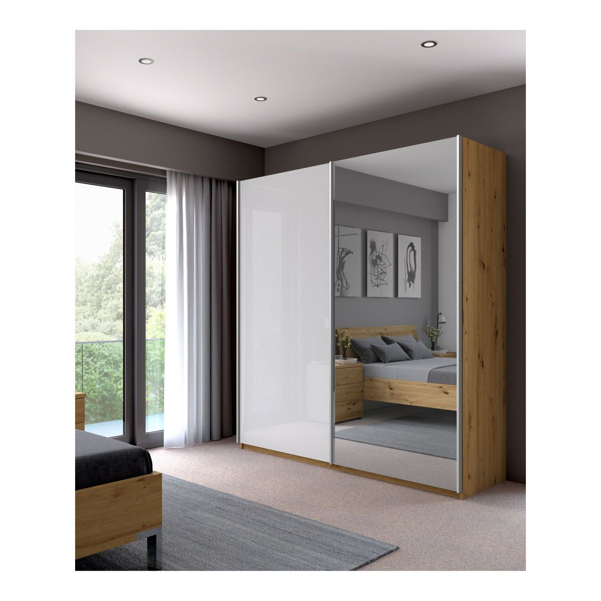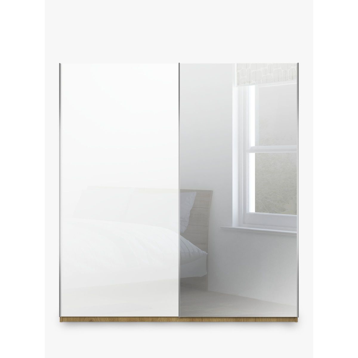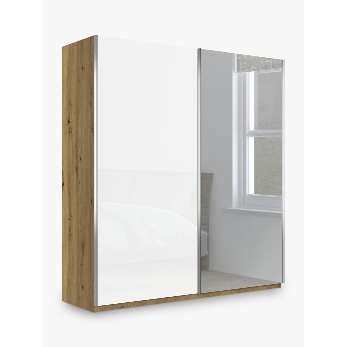 Combining style and functionality, the angular outline of the Elstra 200cm wardrobe is paired with a choice of Rustic Oak, Alpine White or Nocce (rich, dark, walnut) finishes and contrasting glass and mirrored doors. Its contemporary appearance brings any bedroom up to date, while soft-close sliding doors ensure versatile and discreet use even in the smallest of bedrooms. The interior is divided into two equally sized compartments. Both compartments contain two matching shelves and a hanging rail, all fully adjustable for convenience. Extra internal and external accessories are available to purchase separately: Treeline - Set of 3 shelves, width 96.4cm, Product Code: 80323604 Hanging rail, width 96.4cm, Product Code: 80323608 Treeline - Set of 2 internal drawers with glass front, width 96.4cm, Product Code:80323612 Pair of LED external lights Set of 3 LED external lights Want to see it first? You may want to see and get a feel for the furniture in one of our shops before ordering. We'll be able to tell you where the range you'd like to view is on display. We like it because it is delivered and assembled by the supplier in your home for ease and peace of mind.