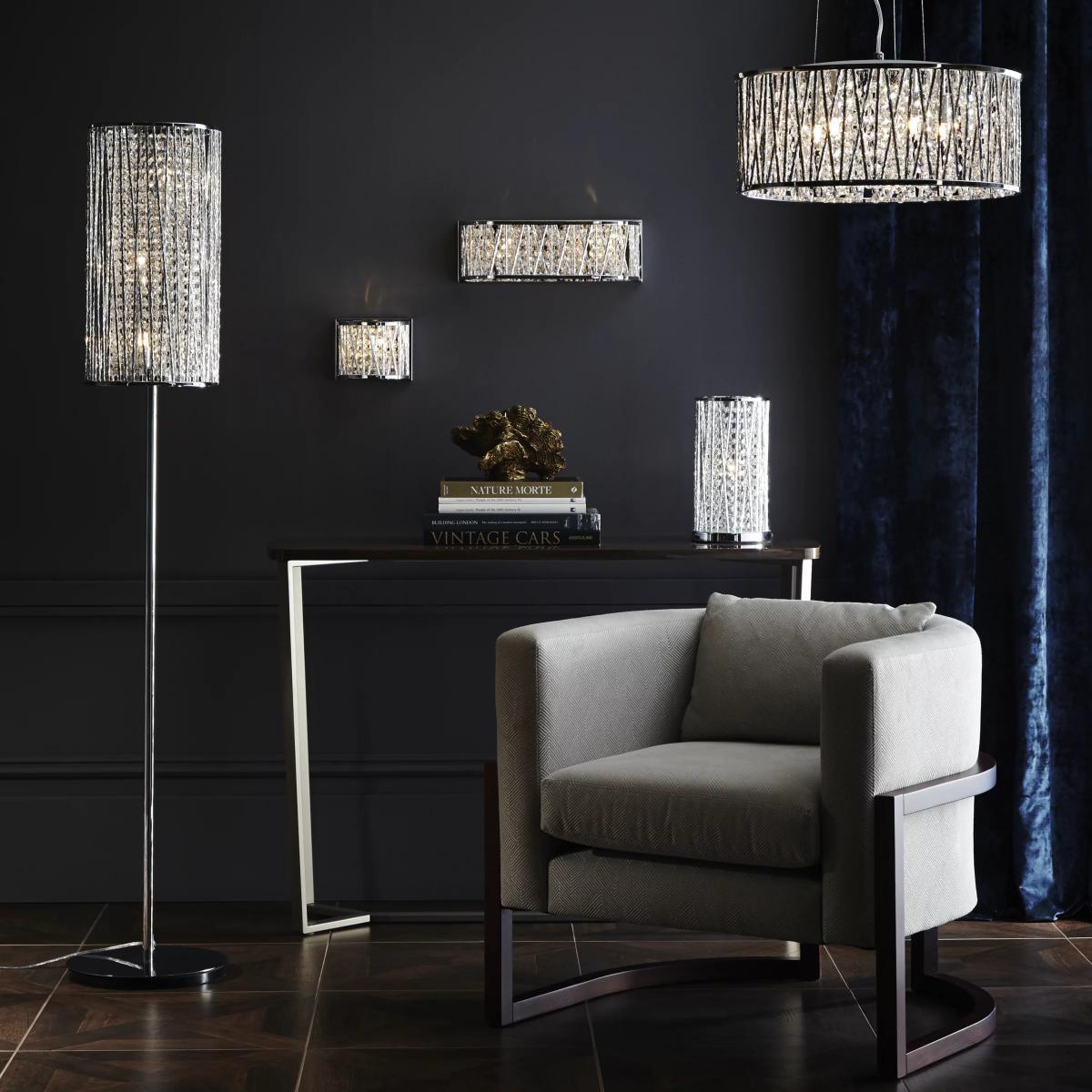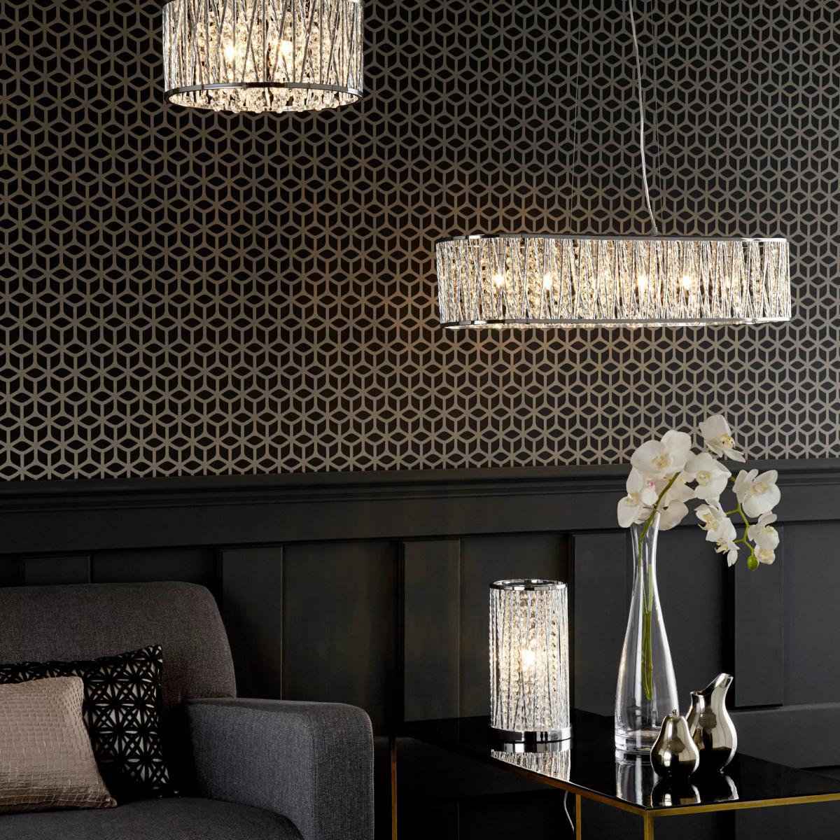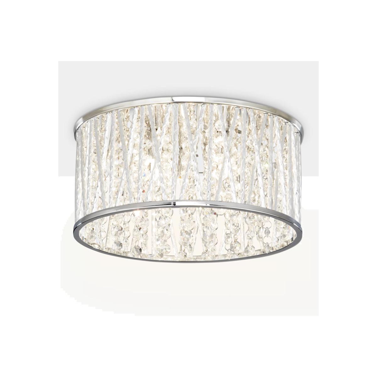 This flush fitting, featuring three capsule bulbs, is surrounded by layers of crystals beads. Each line of droplets is suspended from the chrome structure creating a curtained effect.  When lit, the illumination beams out through the facets and cast a beautiful array of colours against the ceiling. It's perfect for adding glamour to rooms with small ceilings.