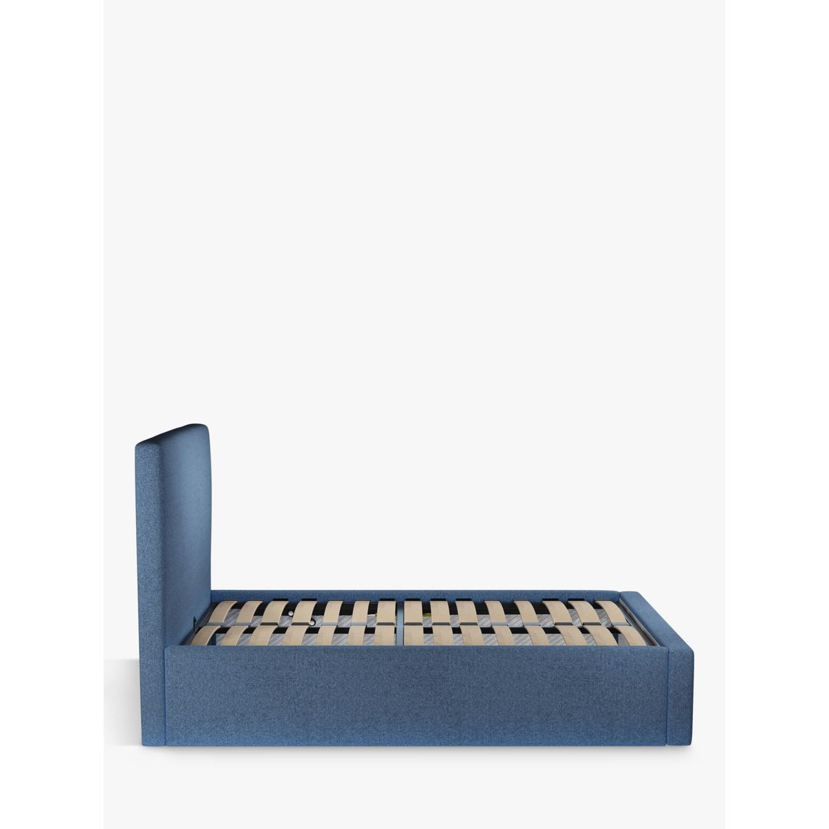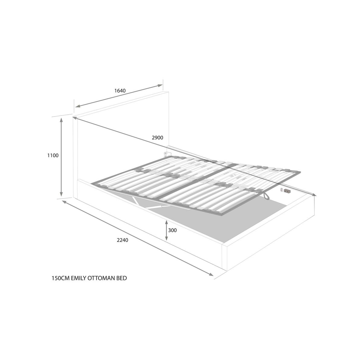Our Emily ottoman bed frame is designed to free-up your floor space and bring a clever storage option into your bedroom. We've kept the design simple and practical, fusing clean lines with soft edges, and we've incorporated a large, well-padded headboard. With the help of hydraulic arms and a handle, it's easy to lift up the mattress to reveal a functional storage space in the base. Sprung slats provide a more supportive foundation for your mattress. Built with Smart Slats This bed frame is designed with wider slats at the shoulders, lumbar and feet. They provide maximum support for you and your mattress so that you experience perfect spinal alignment while you sleep. The standard slat caps are black so we have added grey slat caps to ensure that you know where to place the wider slats. Choose from one of our fabrics: Our Band A fabric, Canvas is a durable, textured weave that's ideal for styling with bold colours and darker shades Our Band A fabric, Topaz is woven to create a linen-effect feel, and is available in a versatile palette of colours Our Band A fabric, Saga is woven with man-made fibres, making it exceptionally durable and versatile Our Band B fabric, Erin has a velvet-style, chenille feel. It's woven with man-made fibres to create a beautifully soft yarn and can appear two-tone in different lights Our Band B fabric, Opulence is soft and luxurious like velvet and available in a rich colour palette Our Band B fabric, Mole is a soft and cosy woven wool-blend. Piling and bobbling may occur naturally over time Our Band C fabric, Marylamb is woven from both man-made and natural fibres, creating a tactile and soft-touch feel Our Band B fabric, Relaxed Linen is durable, resilient and versatile, woven from man-made and natural fibres Our Band C fabric, Aquaclean Harriet is made from a short, dense pile of velvet that has a soft, brushed finish. An Aquaclean treatment has been applied to this resilient fabric which means you can banish the majority of household stains with water. The treatment covers every fibre with an invisible coating that doesn't need to be retreated or re-coated. It will naturally develop lines, scuffs and shading over time Want to see it first? You may want to see and get a feel for the furniture before ordering. Pop into one of our shops to see the full range of colours and fabrics on offer. We'll be able to tell you where the range you'd like to view is on display.