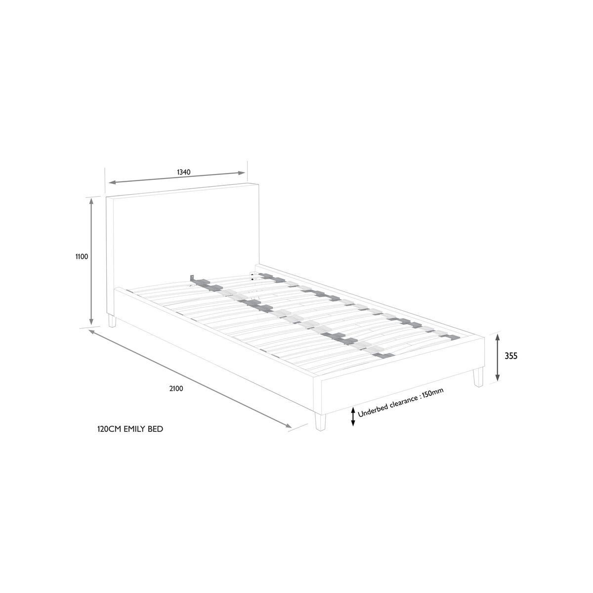 We've kept the design of our Emily bed frame simple and clean-lined so it's a practical choice for modern bedrooms. Easy to assemble and made from high-quality timbers, its versatile shape incorporates a large and well-padded headboard and we've added sprung slats in the base to provide a more supportive foundation for your mattress. Built with Smart Slats This bed frame is designed with wider slats at the shoulders, lumbar and feet. They provide maximum support for you and your mattress so that you experience perfect spinal alignment while you sleep. The standard slat caps are black so we have added grey slat caps to ensure that you know where to place the wider slats. Choose from one of our fabrics: Our Band A fabric, Topaz is woven to create a linen-effect feel, and is available in a versatile palette of colours Our Band A fabric, Saga is woven with man-made fibres, making it exceptionally durable and versatile Our Band B fabric, Erin has a velvet-style, chenille feel. It's woven with man-made fibres to create a beautifully soft yarn and can appear two-tone in different lights Our Band B fabric, Opulence is soft and luxurious like velvet and available in a rich colour palette Our Band B fabric, Mole is a soft and cosy woven wool-blend. Piling and bobbling may occur naturally over time Our Band B fabric, Relaxed Linen is durable, resilient and versatile, woven from man-made and natural fibres Our Band C fabric, Marylamb is woven from both man-made and natural fibres, creating a tactile and soft-touch feel. Our Band C fabric, Aquaclean Harriet is made from a short, dense pile of velvet that has a soft, brushed finish. An Aquaclean treatment has been applied to this resilient fabric which means you can banish the majority of household stains with water. The treatment covers every fibre with an invisible coating that doesn't need to be retreated or re-coated. It will naturally develop lines, scuffs and shading over time. Want to see it first? You may want to see and get a feel for the furniture before ordering. Pop into one of our shops to see the full range of colours and fabrics on offer. We'll be able to tell you where the range you'd like to view is on display.