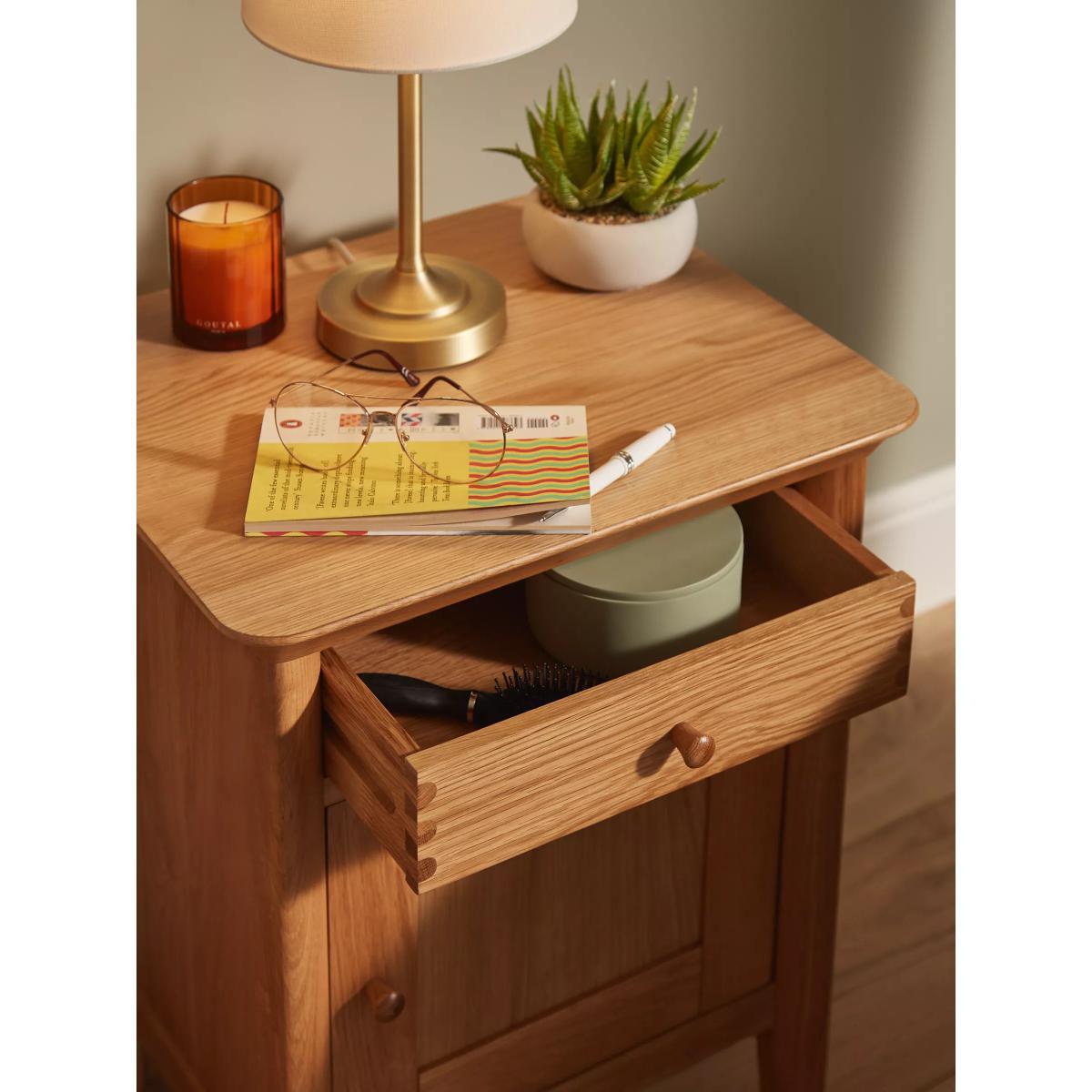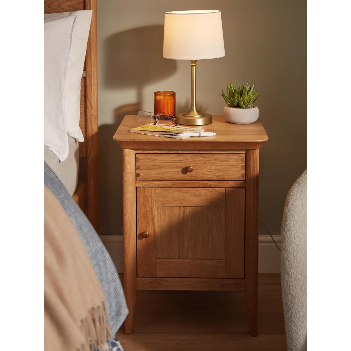 I’m drawn to this oak bedside cabinet for its clean lines, solid dovetail-joined drawer and warm grain - it feels sturdy without looking bulky. It sits equally well in Scandi, modern-farmhouse or pared-back contemporary bedrooms. Styling-wise, balance its natural texture with a slim metal lamp, a small potted plant and a neat stack of books. Use the drawer for bedside clutter and the cupboard to stash charging cables or night-time bits, keeping the top surface calm and functional.