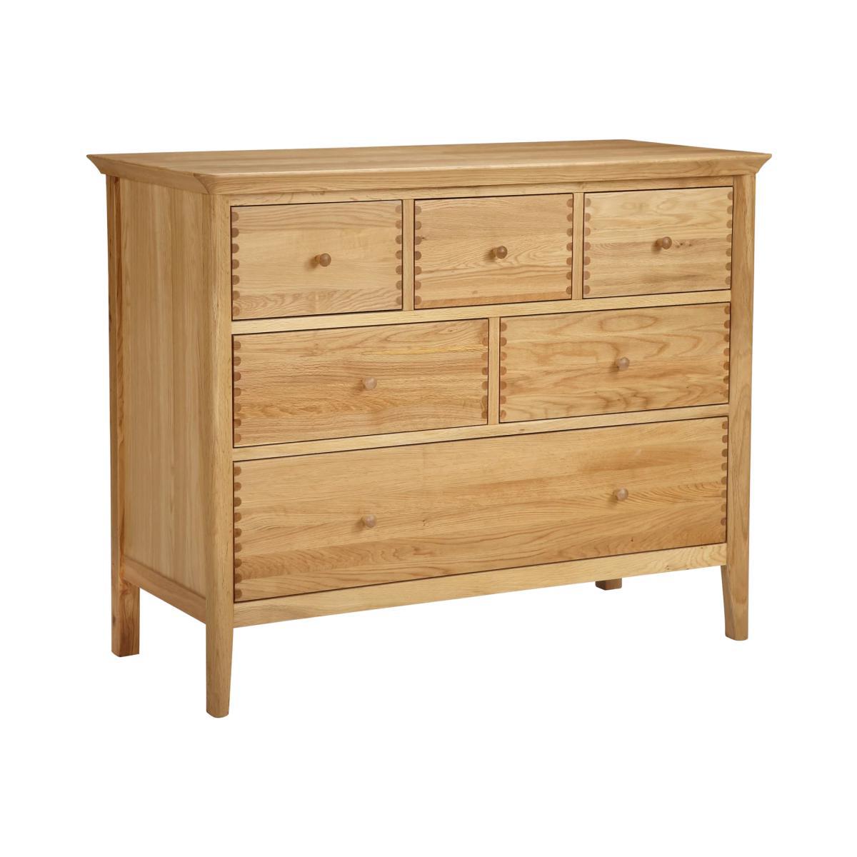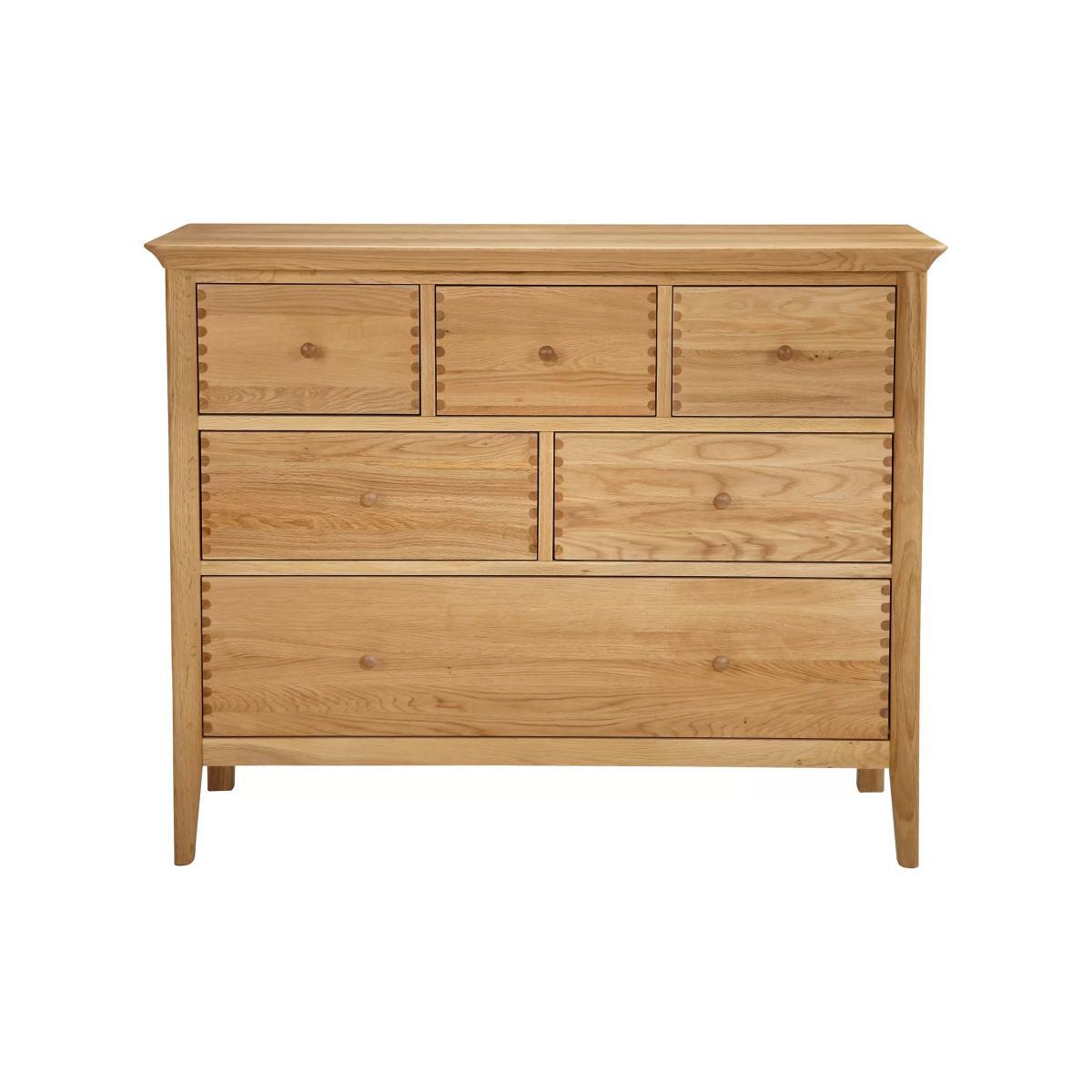 The dovetail joints and smooth rounded edges highlight the impressive construction of this spacious chest of drawers, which we've made from a combination of solid European oak and oak veneers. Designed with six drawers in total, both narrow and wide, there's plenty of storage space. And, we've kept the finish natural to showcase the unique wood grains. Want to see it first? You may want to see and get a feel for the furniture in one of our shops before ordering. We'll be able to tell you where the range you'd like to view is on display.