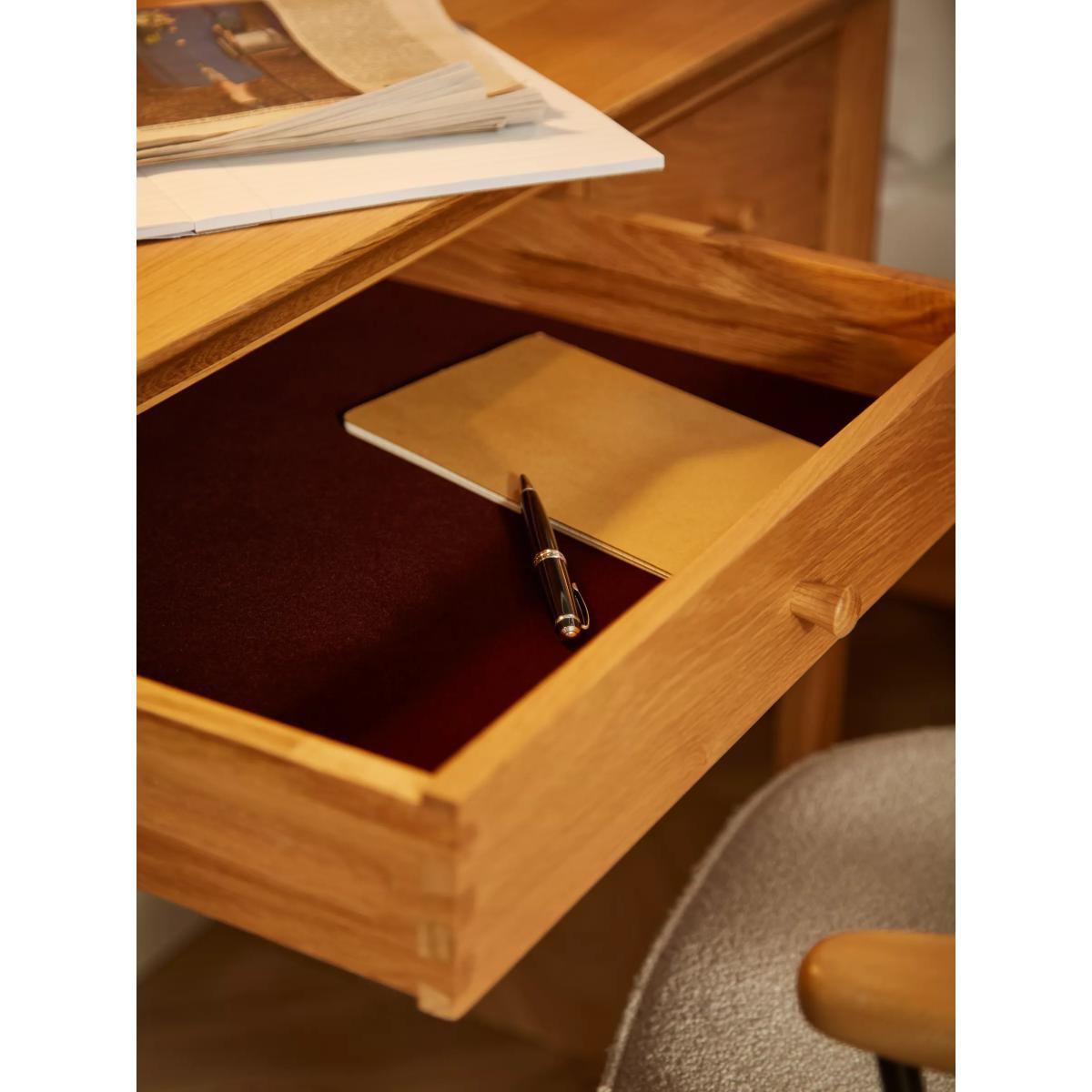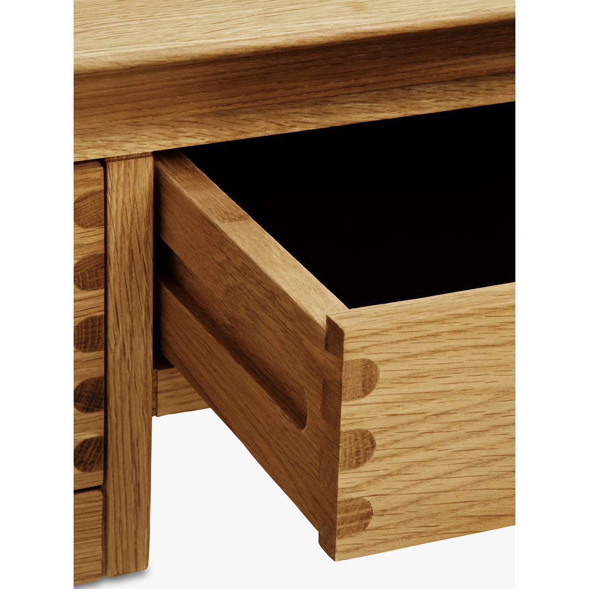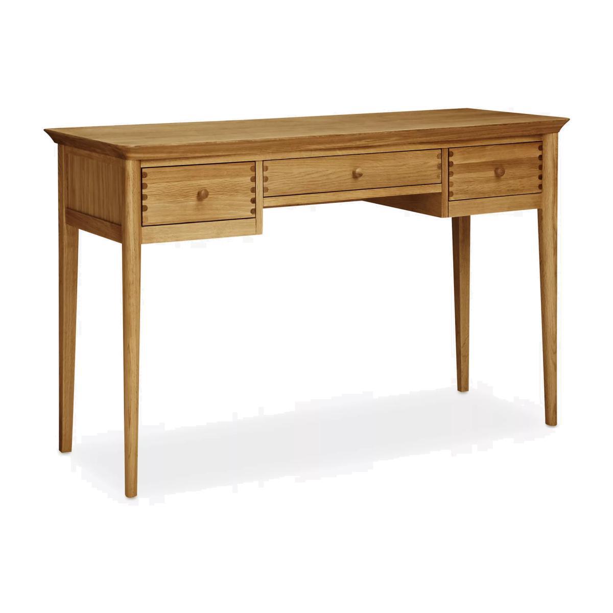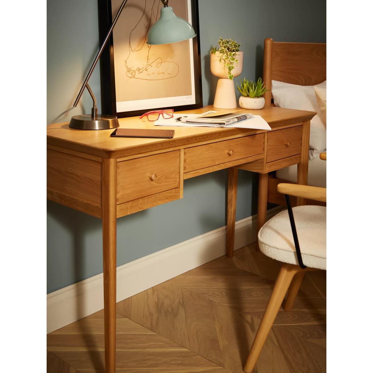 The dovetail joints and smooth rounded edges highlight the impressive construction of this dressing table, which we've made from a combination of solid European oak and oak veneers. There are three spacious drawers for storage and its natural finish gives it a timeless look as it showcases the unique wood grain. Want to see it first? You may want to see and get a feel for the furniture in one of our shops before ordering. We'll be able to tell you where the range you'd like to view is on display.