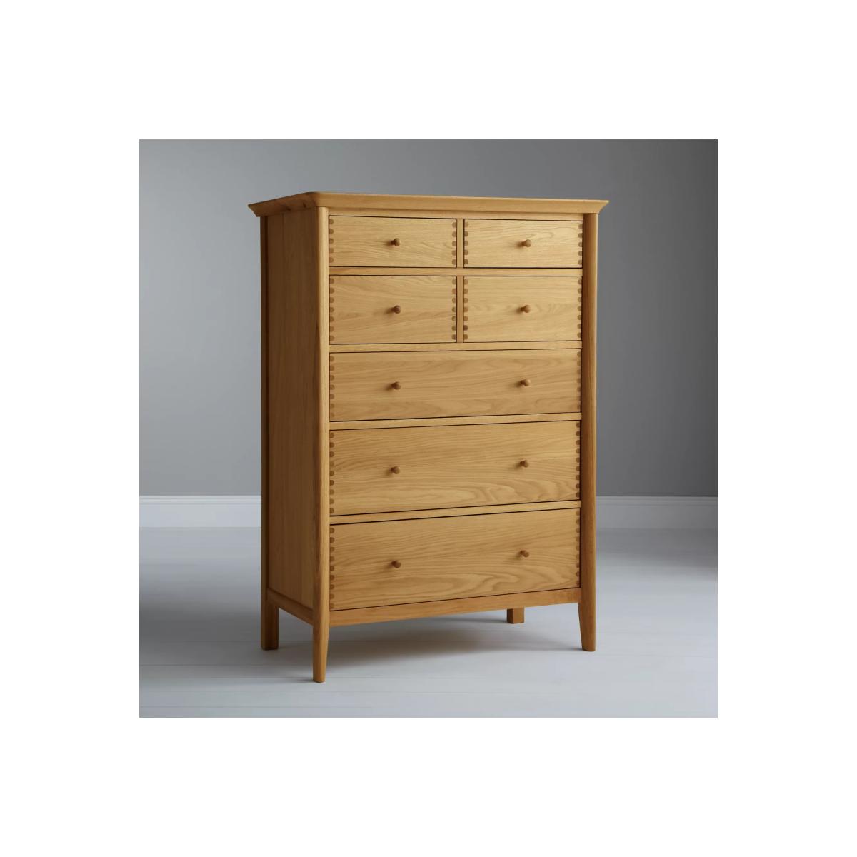 This spacious chest of drawers is made from a combination of solid European oak and high-quality oak veneers for an appealingly natural look. It features seven spacious drawers so there's plenty of storage space and we've built it with dovetail joints for a reassuringly robust finish. Rounded edges and a smooth, natural finish imparts a softer styling touch. Want to see it first? You may want to see and get a feel for the furniture in one of our shops before ordering. We'll be able to tell you where the range you'd like to view is on display.